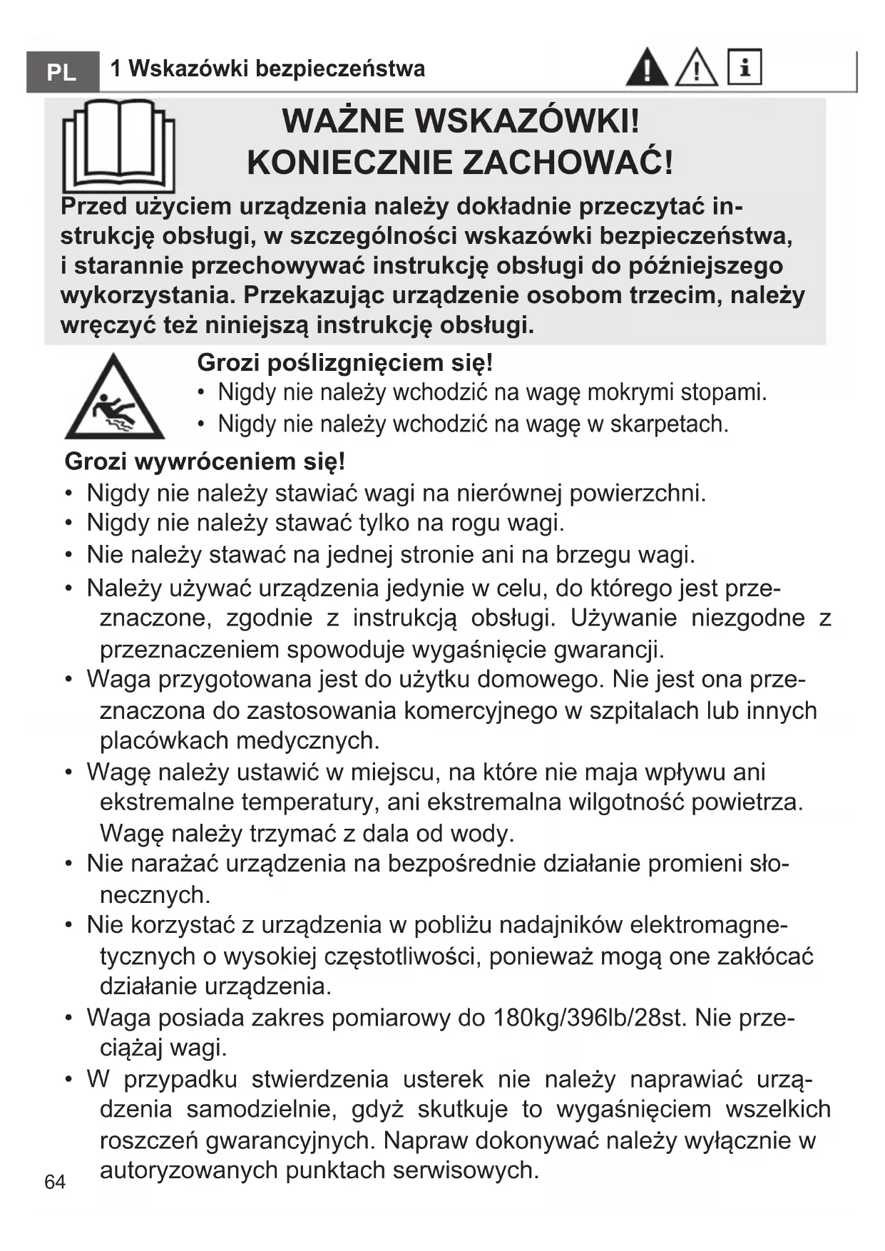 - Nie należy stawać na jednej stronie ani na brzegu wagi.65 1 Wskazówki bezpieczeństwa