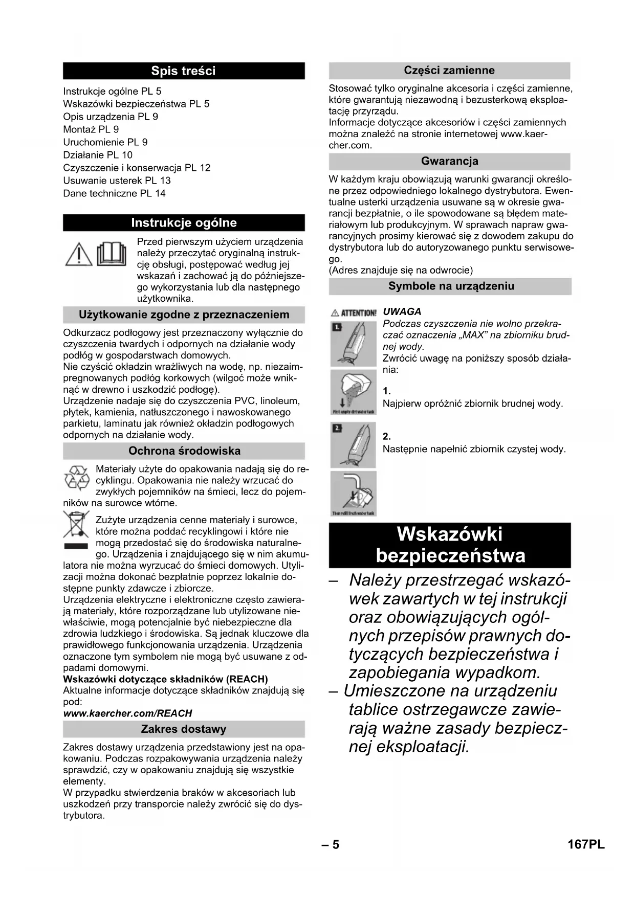 Izhodna napetost polnilnika 30 V Izhodni tok polnilnika 0,6 A Podatki o zmogljivosti Število obratov valja na minuto 500 v/min Polnilna količina Rezervoar za svežo vodo 400 ml Čistilna postaja 200 ml Mere Masa (brez pribora in tekočin za čiščenje) 4,4 kg Dolžina 320 mm Širina 270 mm Višina 1220 mm Dolžina kabla Polnilnik 1500 mm 166 SL– 5 Przed pierwszym użyciem urządzenia należy przeczytać oryginalną instruk- cję obsługi, postępować według jej wskazań i zachować ją do późniejsze- go wykorzystania lub dla następnego użytkownika. Odkurzacz podłogowy jest przeznaczony wyłącznie do czyszczenia twardych i odpornych na działanie wody podłóg w gospodarstwach domowych. Nie czyścić okładzin wrażliwych na wodę, np. niezaim- pregnowanych podłóg korkowych (wilgoć może wnik- nąć w drewno i uszkodzić podłogę). Urządzenie nadaje się do czyszczenia PVC, linoleum, płytek, kamienia, natłuszczonego i nawoskowanego parkietu, laminatu jak również okładzin podłogowych odpornych na działanie wody. Materiały użyte do opakowania nadają się do re- cyklingu. Opakowania nie należy wrzucać do zwykłych pojemników na śmieci, lecz do pojem- ników na surowce wtórne. Zużyte urządzenia cenne materiały i surowce, które można poddać recyklingowi i które nie mogą przedostać się do środowiska naturalne- go. Urządzenia i znajdującego się w nim akumu- latora nie można wyrzucać do śmieci domowych. Utyli- zacji można dokonać bezpłatnie poprzez lokalnie do- stępne punkty zdawcze i zbiorcze. Urządzenia elektryczne i elektroniczne często zawiera- ją materiały, które rozporządzane lub utylizowane nie- właściwie, mogą potencjalnie być niebezpieczne dla zdrowia ludzkiego i środowiska. Są jednak kluczowe dla prawidłowego funkcjonowania urządzenia. Urządzenia oznaczone tym symbolem nie mogą być usuwane z od- padami domowymi. Wskazówki dotyczące składników (REACH) Aktualne informacje dotyczące składników znajdują się pod: www.kaercher.com/REACH Zakres dostawy urządzenia przedstawiony jest na opa- kowaniu. Podczas rozpakowywania urządzenia należy sprawdzić, czy w opakowaniu znajdują się wszystkie elementy. W przypadku stwierdzenia braków w akcesoriach lub uszkodzeń przy transporcie należy zwrócić się do dys- trybutora. Stosować tylko oryginalne akcesoria i części zamienne, które gwarantują niezawodną i bezusterkową eksploa- tację przyrządu. Informacje dotyczące akcesoriów i części zamiennych można znaleźć na stronie internetowej www.kaer- cher.com. W każdym kraju obowiązują warunki gwarancji określo- ne przez odpowiedniego lokalnego dystrybutora. Ewen- tualne usterki urządzenia usuwane są w okresie gwa- rancji bezpłatnie, o ile spowodowane są błędem mate- riałowym lub produkcyjnym. W sprawach napraw gwa- rancyjnych prosimy kierować się z dowodem zakupu do dystrybutora lub do autoryzowanego punktu serwisowe- go. (Adres znajduje się na odwrocie) – Należy przestrzegać wskazó- wek zawartych w tej instrukcji oraz obowiązujących ogól- nych przepisów prawnych do- tyczących bezpieczeństwa i zapobiegania wypadkom. – Umieszczone na urządzeniu tablice ostrzegawcze zawie- rają ważne zasady bezpiecz- nej eksploatacji. Spis treści Instrukcje ogólne PL 5 Wskazówki bezpieczeństwa PL 5 Opis urządzenia PL 9 Montaż PL 9 Uruchomienie PL 9 Działanie PL 10 Czyszczenie i konserwacja PL 12 Usuwanie usterek PL 13 Dane techniczne PL 14 Instrukcje ogólne Użytkowanie zgodne z przeznaczeniem Ochrona środowiska Zakres dostawy Części zamienne Gwarancja Symbole na urządzeniu UWAGA Podczas czyszczenia nie wolno przekra- czać oznaczenia „MAX” na zbiorniku brud- nej wody. Zwrócić uwagę na poniższy sposób działa- nia: