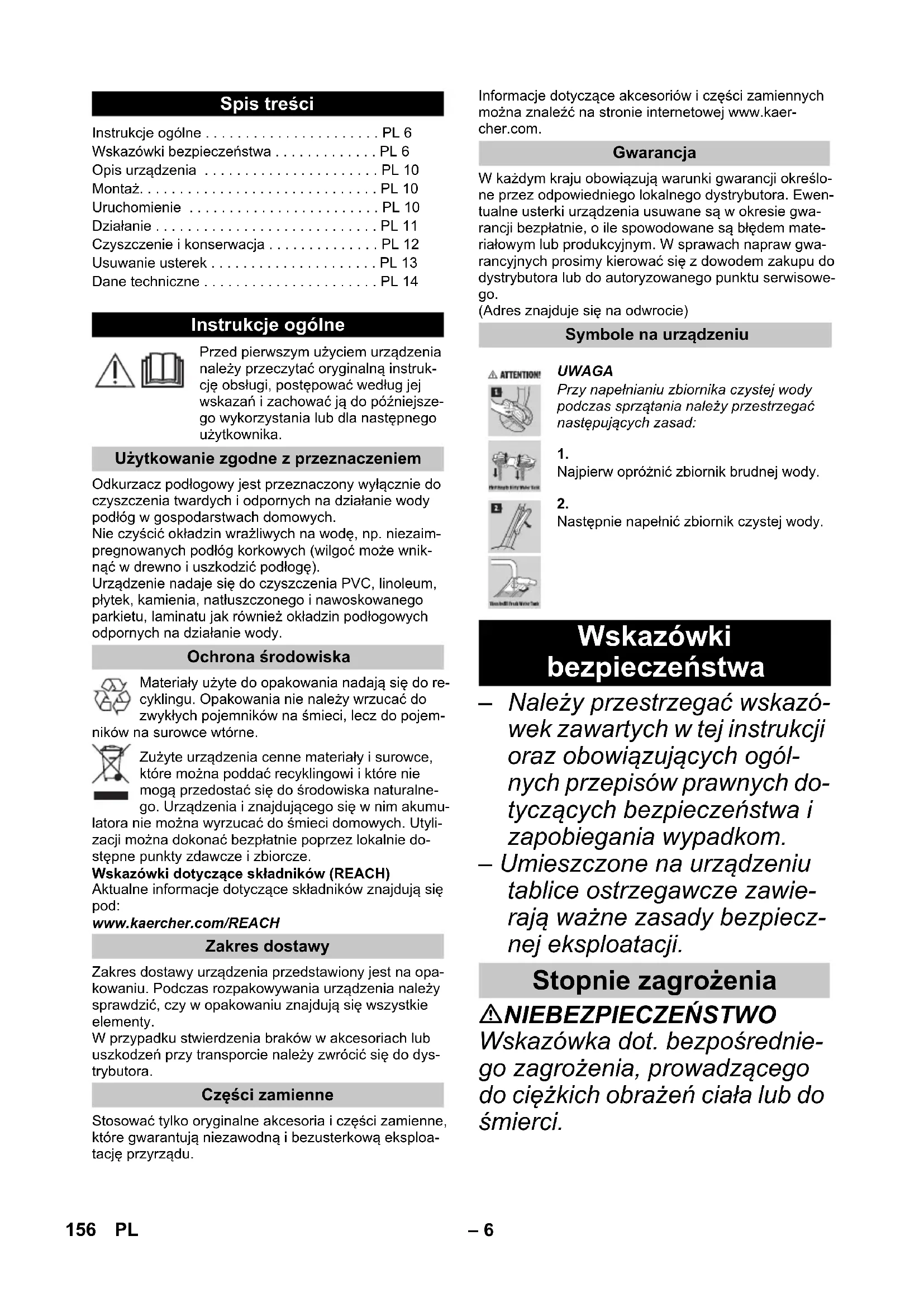 Zrobić przerwę i poczekać, aż urządzenie ostygnie. Jeśli oprócz tego urządzenie wyłącza się: Zrobić przerwę i poczekać, aż urządzenie ostygnie. Urządzenie włączyć ponownie dopiero wtedy, gdy odpowiednio ostygnie. Wałki nie są dostatecznie nawilżane. Nawilżyć wałki przez kilkakrotne przejechanie do przodu i do tyłu w jednym miejscu. Brak wody w zbiorniku czystej wody. Uzupełnić poziom wody Zbiornik świeżej wody nie jest odpowiednio osadzony w urządzeniu. Zamontować zbiornik świeżej wody tak, aby był od- powiednio nasadzony na urządzeniu. Brakuje wałków czyszczących albo są one nieprawidło- wo umieszczone. Zamontować wałki czyszczące lub wkręcić je do oporu w ich mocowanie. Wałki czyszczące są zabrudzone lub zużyte. Wyczyścić wałki czyszczące. lub Wymienić wałki czyszczące. Zapomniano o środku czyszczącym, odmierzono jego nieprawidłową ilość lub użyto nieprawidłowego środka czyszczącego Stosować tylko środek czyszczący KÄRCHER i zwrócić uwagę na prawidłowe dozowanie. Osłona głowicy czyszczącej nieprawidłowo zamonto- wana Sprawdzić, czy osłona głowicy czyszczącej jest prawidłowo osadzona. W tym celu zdjąć i ponownie założyć osłonę głowicy czyszczącej. Wskazówka Lekkie tworzenie się piany w głowicy czyszczącej pod- czas pracy jest normalne i nie oznacza nieprawidłowe- go działania. Dodatkowe czynności należy podjąć tylko w przypadku nadmiernego tworzenia się piany (np. pa- ski piany na podłodze). Nieprawidłowy środek czyszczący lub nieprawidłowe dozowanie. Stosować tylko środek czyszczący KÄRCHER i zwrócić uwagę na prawidłowe dozowanie. Zasada działania urządzenia polega na usuwaniu za- brudzeń z wałków czyszczących. Zabrudzenia i pozo- stałości środków czyszczących z podłóg zbierają się w zbiorniku brudnej wody. W określonych warunkach może to doprowadzić do tworzenia się piany. Dokładnie umyć wałki wodą z zanieczyszczeń i po- zostałości środków czyszczących. Rysunek Rysunek Rysunek W przypadku silnego tworzenia się piany przed rozpoczęciem procesu czyszczenia należy wlać FoamStop do pustego zbiornika brudnej wody. Środki czyszczące i pielęgnacyjne Usuwanie usterek Akumulator nie jest ładowany Nie można włączyć urządzenia Wskaźnik usterki LED Wałki są zbyt suche Urządzenie nie zbiera brudu Tworzenie się piany w głowicy czyszczącej i na podłodze 163PL– 14 Przestrzegać informacji dotyczących dozowania znajdujących się na etykiecie butelki. Wałki są zabrudzone. Umyć wałki. Wałki nie są dostatecznie nawilżane. Nawilżyć wałki przez kilkakrotne przejechanie do przodu i do tyłu w jednym miejscu. Nieprawidłowy środek czyszczący lub nieprawidłowe dozowanie. Stosować tylko środek czyszczący KÄRCHER i zwrócić uwagę na prawidłowe dozowanie. Na podłodze znajdują się pozostałości innych środków czyszczących. Dokładnie umyć wałki wodą z pozostałości środ- ków czyszczących. Kilkakrotnie umyć podłogę urządzeniem z czystymi wałkami bez środka czyszczącego. W ten sposób z podłogi zostaną usunięte pozostałości środków czyszczących Wałki zostały zablokowane. Zdjąć wałki i sprawdzić, czy nie zakleszczył się w nich jakiś przedmiot. Sprawdzić, czy wałki są do oporu wkręcone na uchwyt wałków. Sprawdzić, czy osłona głowicy czyszczącej jest prawidłowo osadzona. W tym celu zdjąć i ponownie założyć osłonę głowicy czyszczącej. Osłona głowicy czyszczącej nieprawidłowo zamonto- wana Sprawdzić, czy osłona głowicy czyszczącej jest prawidłowo osadzona. W tym celu zdjąć i ponownie założyć osłonę głowicy czyszczącej. Wałki są zużyte. Wymienić wałki. Zbiornik brudnej wody jest przepełniony. Natychmiast opróżnić zbiornik brudnej wody. Zbiornik brudnej wody nie jest odpowiednio nasadzony na urządzeniu. Sprawdzić, czy osłona głowicy czyszczącej jest prawidłowo osadzona na zbiorniku brudnej wody. Sprawdzić, czy klapki zbiornika brudnej wody są prawidłowo zamknięte. UWAGA Po zmontowaniu nie zdejmować uchwytu z urządzenia podstawowego. Uchwyt można zdjąć z urządzenia podstawowego tylko wtedy, gdy urządzenie jest wysyłane do serwisu. Rysunek Patrz rysunek na końcu instrukcji obsługi Włożyć śrubokręt pod kątem 90 stopni do małego otworu z tyłu uchwytu i zdjąć uchwyt. UWAGA Zwrócić uwagę na to, aby kabel zasilający znajdujący się między urządzeniem podstawowym a uchwytem nie został uszkodzony. Zmiany techniczne zastrzeżone! Niezadowalający efekt mycia podłogi Wałki nie obracają się Wchłanianie wody nie jest optymalne Urządzenie gubi brudną wodę Zdejmowanie uchwytu z urządzenia podstawowego Dane techniczne Podłączenie do sieci elektrycznej Napięcie 100-240 V 1~50-60 Hz Stopień zabezpieczenia IPX4 Urządzenie Klasa ochrony III Stopień ochrony ładowarki II Moc znamionowa urządzenia 40 W Napięcie znamionowe akumula- tora 7,2 V Typ akumulatora Li-Ion Czas pracy przy naładowanym akumulatorze 20 min Czas ładowania wyładowanego akumulatora