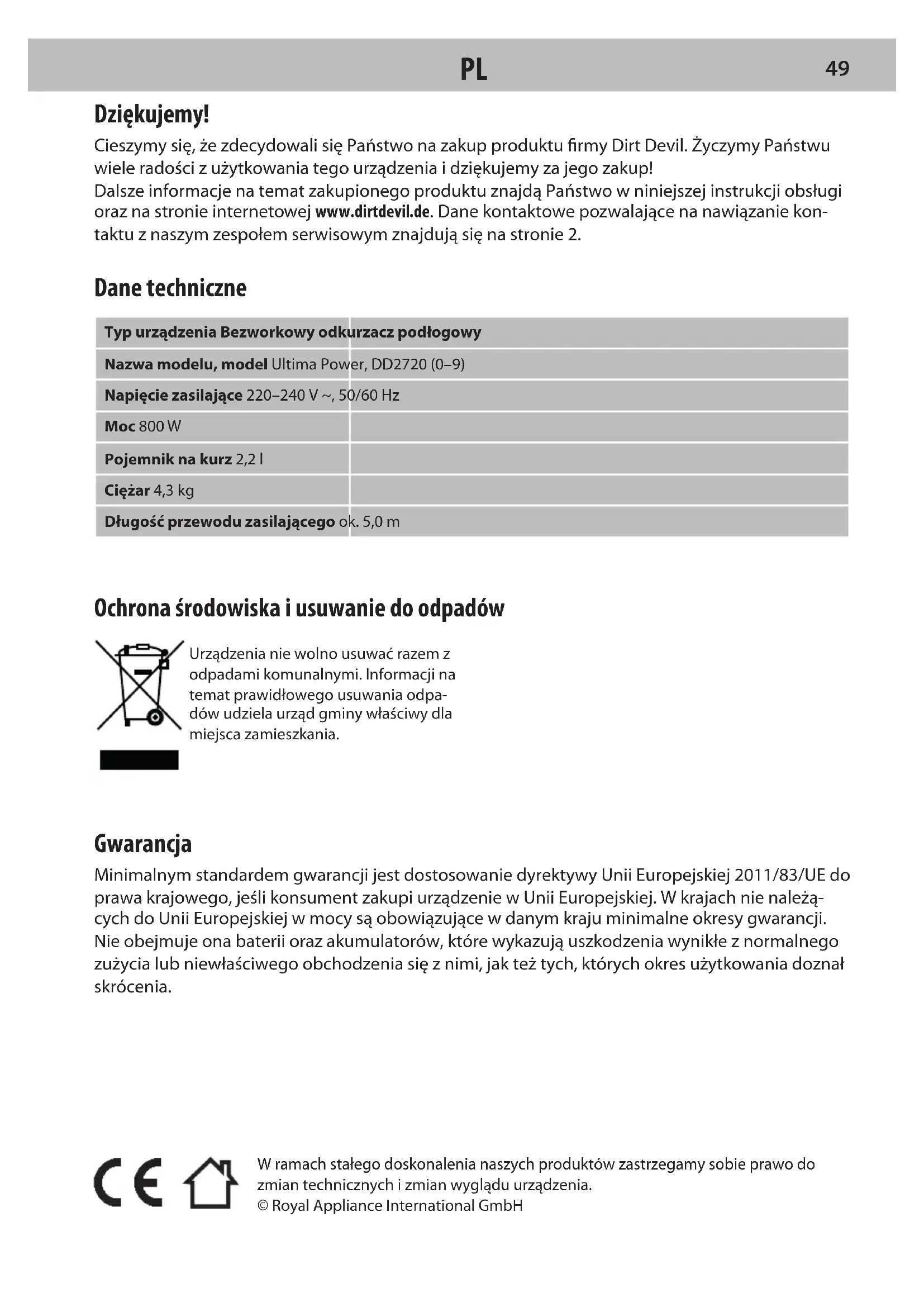NLOchrona środowiska i usuwanie do odpadów Urządzenia nie wolno usuwać razem z odpadami komunalnymi. Informacji na temat prawidłowego usuwania odpa- dów udziela urząd gminy właściwy dla miejsca zamieszkania. Gwarancja Minimalnym standardem gwarancji jest dostosowanie dyrektywy Unii Europejskiej 2011/83/UE do prawa krajowego, jeśli konsument zakupi urządzenie w Unii Europejskiej. W krajach nie należą- cych do Unii Europejskiej w mocy są obowiązujące w danym kraju minimalne okresy gwarancji. Nie obejmuje ona baterii oraz akumulatorów, które wykazują uszkodzenia wynikłe z normalnego zużycia lub niewłaściwego obchodzenia się z nimi, jak też tych, których okres użytkowania doznał skrócenia. W ramach stałego doskonalenia naszych produktów zastrzegamy sobie prawo do zmian technicznych i zmian wyglądu urządzenia. © Royal Appliance International GmbH Dziękujemy! Cieszymy się, że zdecydowali się Państwo na zakup produktu rmy Dirt Devil. Życzymy Państwu wiele radości z użytkowania tego urządzenia i dziękujemy za jego zakup! Dalsze informacje na temat zakupionego produktu znajdą Państwo w niniejszej instrukcji obsługi oraz na stronie internetowej www.dirtdevil.de. Dane kontaktowe pozwalające na nawiązanie kon- taktu z naszym zespołem serwisowym znajdują się na stronie 2. Dane techniczne Typ urządzenia Bezworkowy odkurzacz podłogowy Nazwa modelu, model Ultima Power, DD2720 (0–9) Napięcie zasilające 220–240 V ~, 50/60 Hz Moc 800 W Pojemnik na kurz 2,2 l Ciężar 4,3 kg Długość przewodu zasilającego ok. 5,0 m