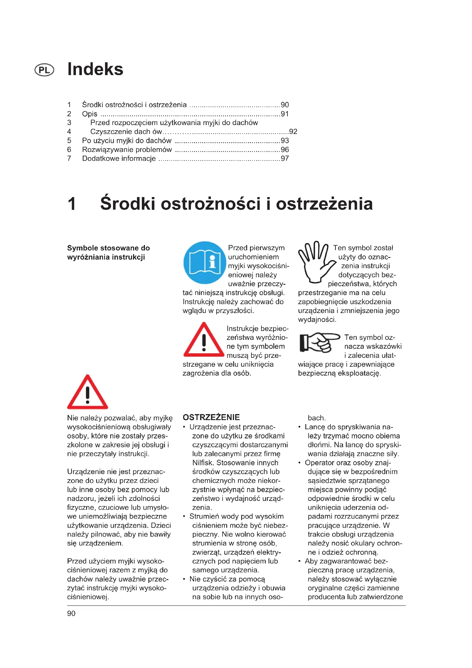 Symbole stosowane do wyróżnianiainstrukcji Przedpierwszym uruchomieniem myjkiwysokociśni- eniowejnależy uważnieprzeczy- taćniniejsząinstrukcjęobsługi. Instrukcjęnależyzachowaćdo wgląduwprzyszłości. Instrukcjebezpiec- zeństwawyróżnio- netymsymbolem musząbyćprze- strzeganewceluuniknięcia zagrożeniadlaosób. Tensymbolzostał użytydooznac- zeniainstrukcji dotyczącychbez- pieczeństwa,których przestrzeganiemanacelu zapobiegnięcieuszkodzenia urządzeniaizmniejszeniajego wydajności. Tensymboloz- naczawskazówki izaleceniaułat- wiającepracęizapewniające bezpiecznąeksploatację. Nienależypozwalać,abymyjkę wysokociśnieniowąobsługiwały osoby,któreniezostałyprzes- zkolonewzakresiejejobsługii nieprzeczytałyinstrukcji. Urządzenieniejestprzeznac- zonedoużytkuprzezdzieci lubinneosobybezpomocylub nadzoru,jeżeliichzdolności zyczne,czuciowelubumysło- weuniemożliwiająbezpieczne użytkowanieurządzenia.Dzieci należypilnować,abyniebawiły sięurządzeniem. Przedużyciemmyjkiwysoko- ciśnieniowejrazemzmyjkądo dachównależyuważnieprzec- zytaćinstrukcjęmyjkiwysoko- ciśnieniowej. OSTRZEŻENIE