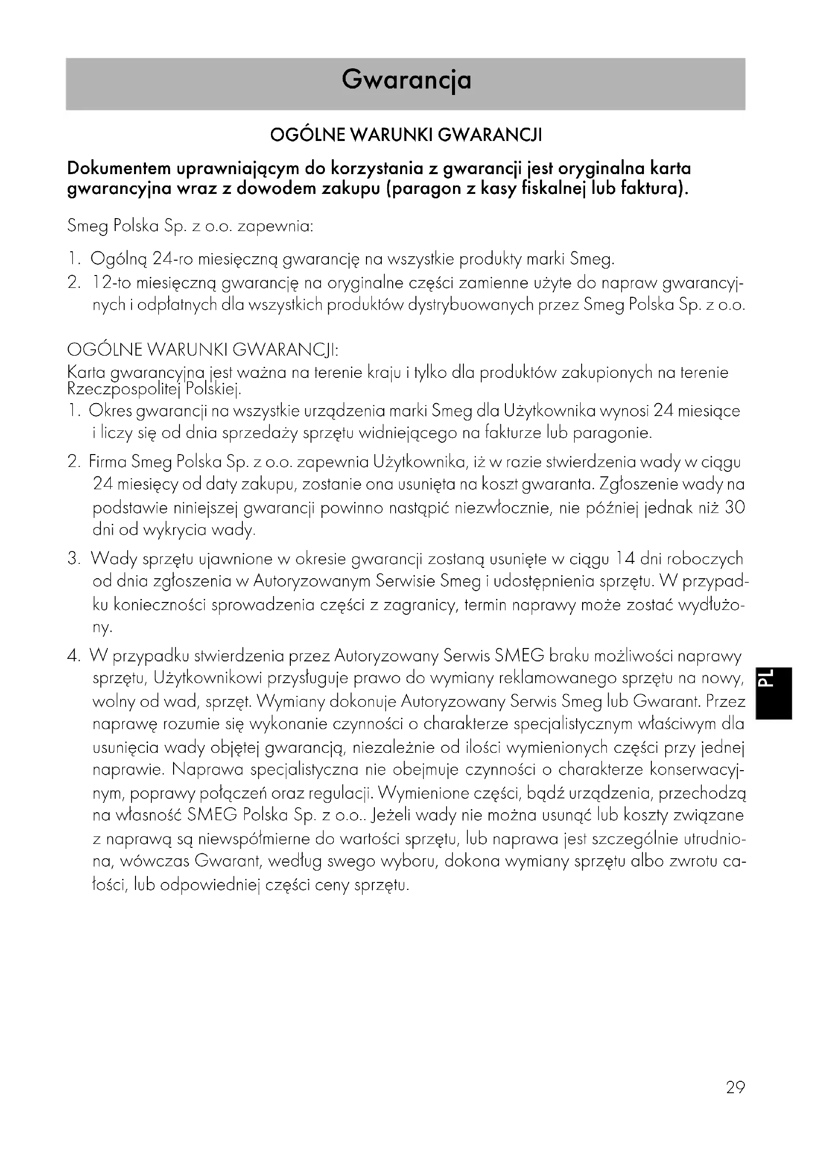 nych i odpłatnych dla wszystkich produktów dystrybuowanych przez Smeg Polska Sp. z o.o. OGÓLNE WARUNKI GWARANCJI: Karta gwarancyjna jest ważna na terenie kraju i tylko dla produktów zakupionych na terenie Rzeczpospolitej Polskiej.