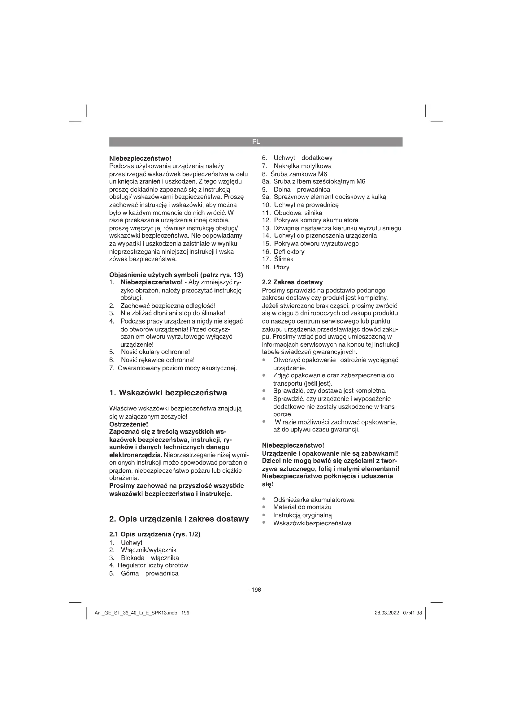 Aby wyjąć akumulator otworzyć pokrywę komory akumulatora (poz. 12), nacisnąć przycisk blokady Anl_GE_ST_36_40_Li_E_SPK13.indb 198Anl_GE_ST_36_40_Li_E_SPK13.indb 198 28.03.2022 07:41:3828.03.2022 07:41:38PL