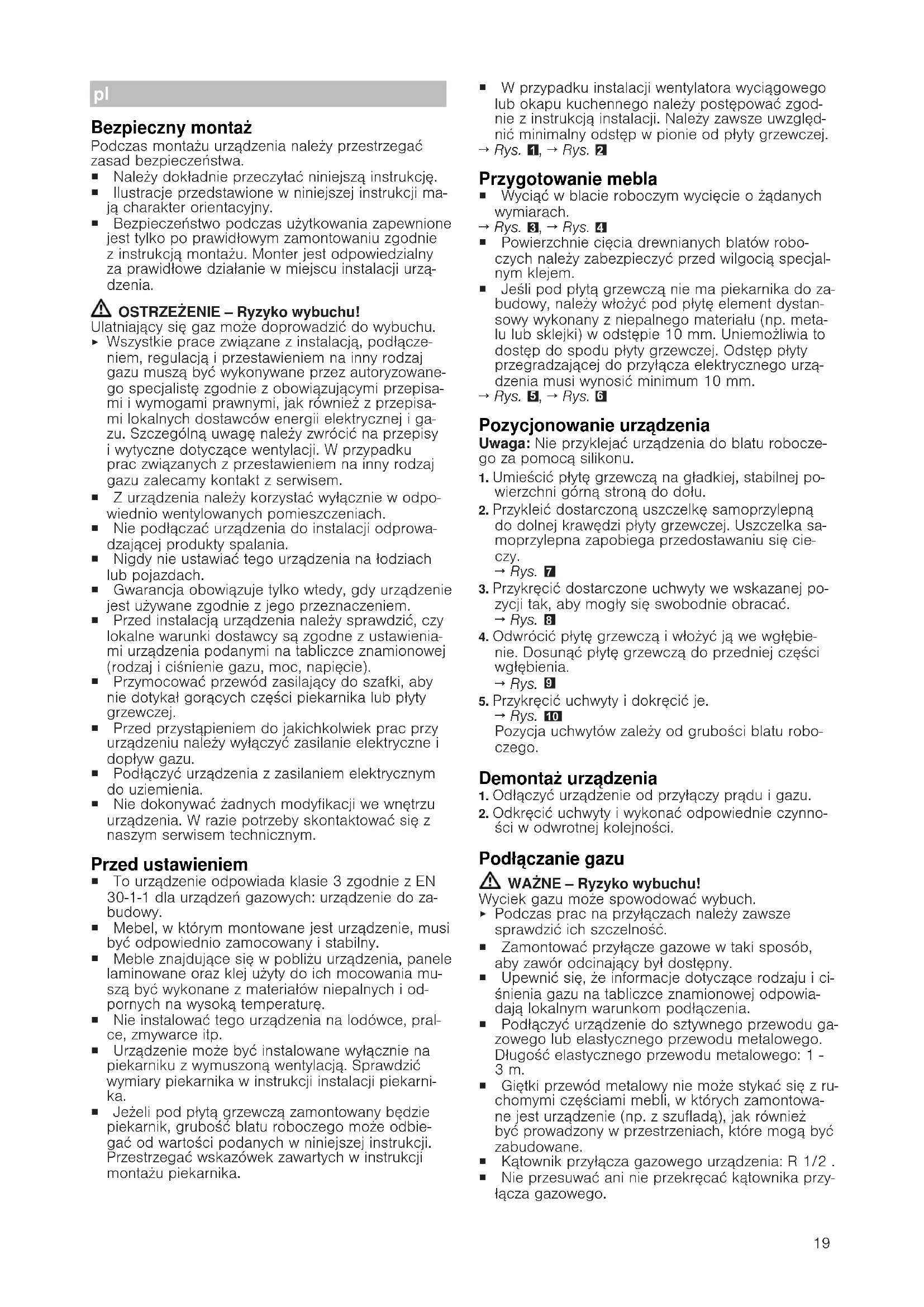 Bezpieczny montaż Podczas montażu urządzenia należy przestrzegać zasad bezpieczeństwa. ¡ Należy dokładnie przeczytać niniejszą instrukcję. ¡ Ilustracje przedstawione w niniejszej instrukcji ma- ją charakter orientacyjny. ¡ Bezpieczeństwo podczas użytkowania zapewnione jest tylko po prawidłowym zamontowaniu zgodnie z instrukcją montażu. Monter jest odpowiedzialny za prawidłowe działanie w miejscu instalacji urzą- dzenia. OSTRZEŻENIE‒Ryzyko wybuchu! Ulatniający się gaz może doprowadzić do wybuchu.