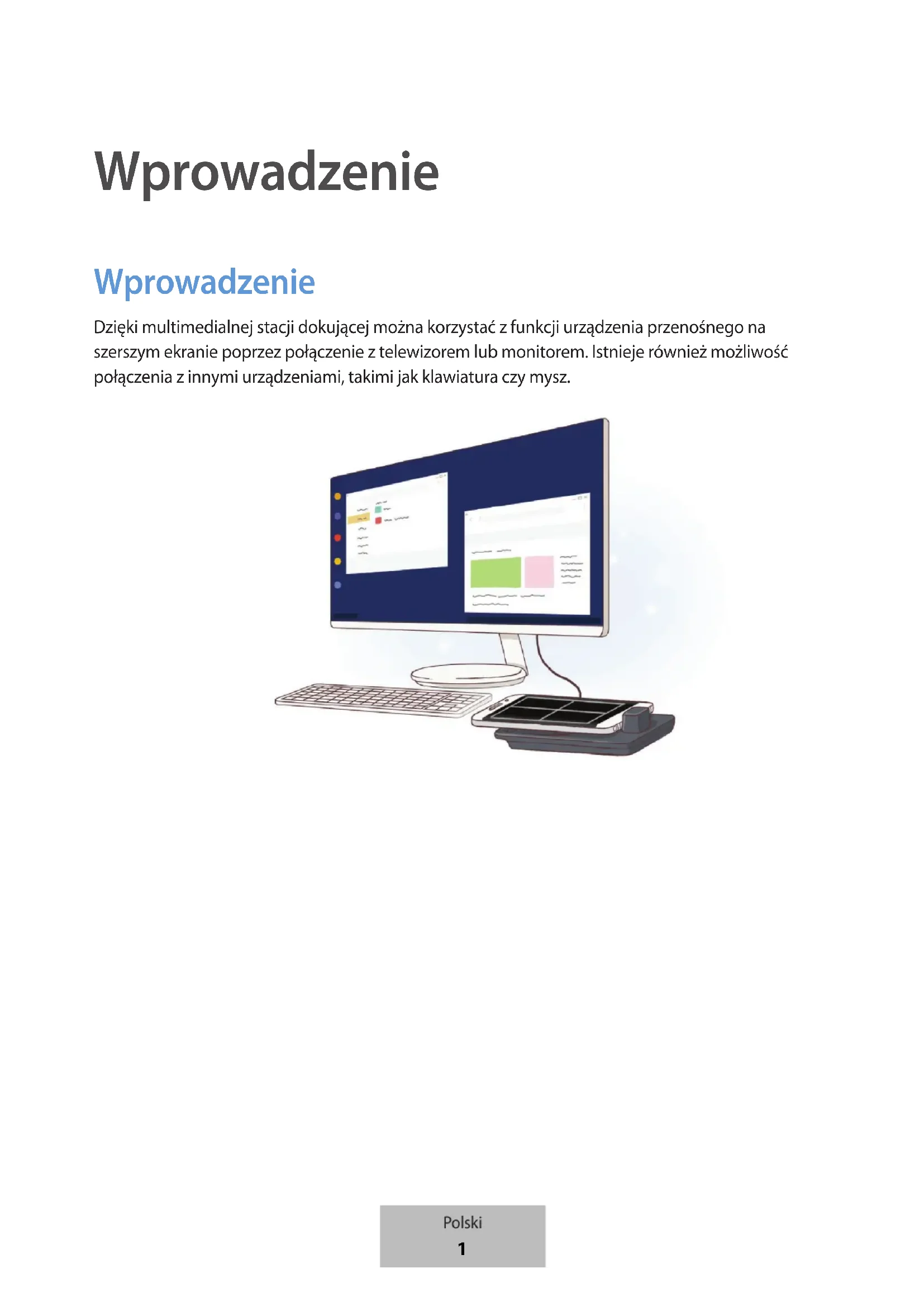 Wprowadzenie Wprowadzenie Dzięki multimedialnej stacji dokującej można korzystać z funkcji urządzenia przenośnego na szerszym ekranie poprzez połączenie z telewizorem lub monitorem. Istnieje również możliwość połączenia z innymi urządzeniami, takimi jak klawiatura czy mysz. Polsk i 1Wprowadzenie