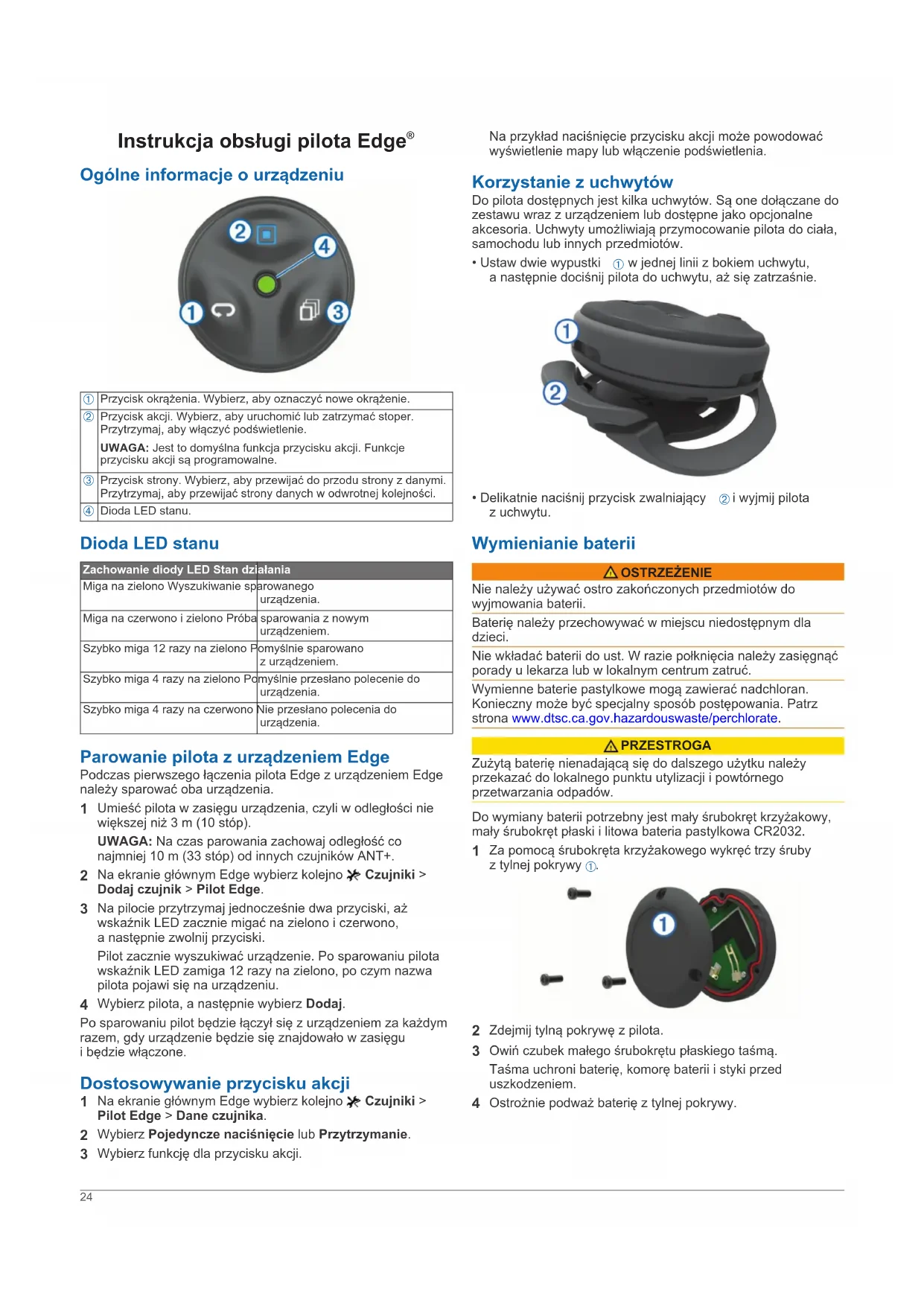 Wybierz funkcję dla przycisku akcji. Na przykład naciśnięcie przycisku akcji może powodować wyświetlenie mapy lub włączenie podświetlenia. Korzystanie z uchwytów Do pilota dostępnych jest kilka uchwytów. Są one dołączane do zestawu wraz z urządzeniem lub dostępne jako opcjonalne akcesoria. Uchwyty umożliwiają przymocowanie pilota do ciała, samochodu lub innych przedmiotów.