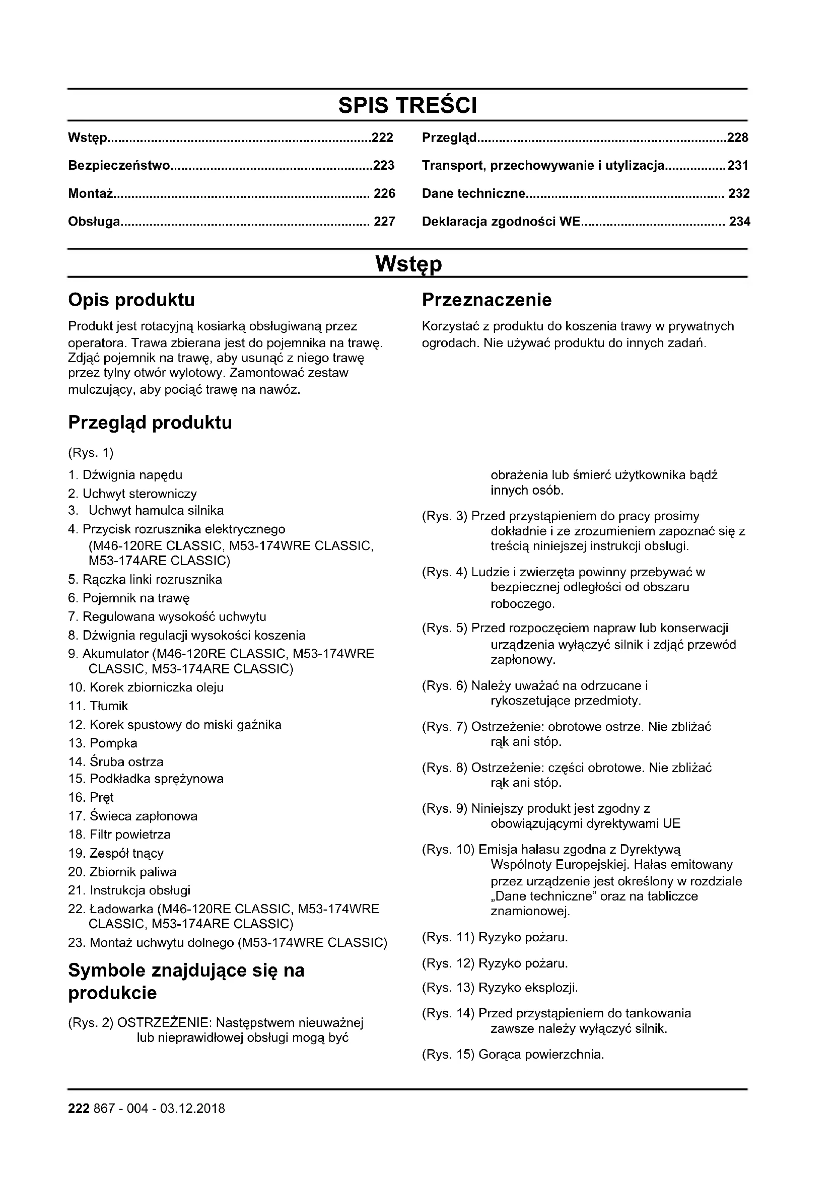 Symbole znajdujące się na produkcie (Rys. 2) OSTRZEŻENIE: Następstwem nieuważnej lub nieprawidłowej obsługi mogą być obrażenia lub śmierć użytkownika bądź innych osób. (Rys. 3) Przed przystąpieniem do pracy prosimy dokładnie i ze zrozumieniem zapoznać się z treścią niniejszej instrukcji obsługi. (Rys. 4) Ludzie i zwierzęta powinny przebywać w bezpiecznej odległości od obszaru roboczego. (Rys. 5) Przed rozpoczęciem napraw lub konserwacji urządzenia wyłączyć silnik i zdjąć przewód zapłonowy. (Rys. 6) Należy uważać na odrzucane i rykoszetujące przedmioty. (Rys. 7) Ostrzeżenie: obrotowe ostrze. Nie zbliżać rąk ani stóp. (Rys. 8) Ostrzeżenie: części obrotowe. Nie zbliżać rąk ani stóp. (Rys. 9) Niniejszy produkt jest zgodny z obowiązującymi dyrektywami UE (Rys. 10) Emisja hałasu zgodna z Dyrektywą Wspólnoty Europejskiej. Hałas emitowany przez urządzenie jest określony w rozdziale „Dane techniczne” oraz na tabliczce znamionowej. (Rys. 11) Ryzyko pożaru. (Rys. 12) Ryzyko pożaru. (Rys. 13) Ryzyko eksplozji. (Rys. 14) Przed przystąpieniem do tankowania zawsze należy wyłączyć silnik. (Rys. 15) Gorąca powierzchnia. 222 867 - 004 - 03.12.2018(Rys. 16) Spaliny z silnika zawierają tlenek węgla, który jest bezwonnym, trującym i niebezpiecznym gazem. nie uruchamiać maszyny w pomieszczeniach ani zamkniętych przestrzeniach. (Rys. 17) Spaliny z silnika zawierają tlenek węgla, który jest bezwonnym, trującym i niebezpiecznym gazem. nie uruchamiać maszyny w pomieszczeniach ani zamkniętych przestrzeniach. Uwaga: Pozostałe symbole/naklejki samoprzylepne umieszczone na produkcie dotyczą wymogów związanych z certyfikatami w innych obszarach komercyjnych. UE V OSTRZEŻENIE: Ingerencja w silnik powoduje unieważnienie europejskiego zatwierdzenia typu produktu. Odpowiedzialność za produkt Zgodnie z przepisami dotyczącymi odpowiedzialności za produkt nie ponosimy odpowiedzialności za szkody spowodowane przez nasz produkt, jeśli: