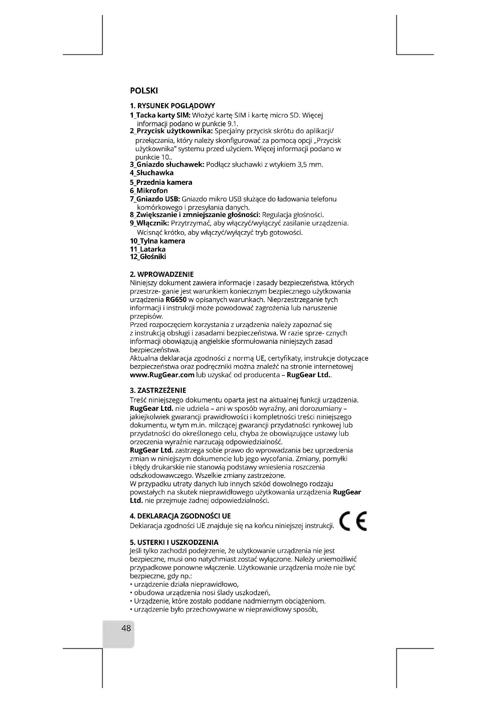 Treść niniejszego dokumentu oparta jest na aktualnej funkcji urządzenia. RugGear Ltd. nie udziela – ani wsposób wyraźny, ani dorozumiany – jakiejkolwiek gwarancji prawidłowości ikompletności treści niniejszego dokumentu, wtym m.in. milczącej gwarancji przydatności rynkowej lub przydatności do określonego celu, chyba że obowiązujące ustawy lub orzeczenia wyraźnie narzucają odpowiedzialność. RugGear Ltd. zastrzega sobie prawo do wprowadzania bez uprzedzenia zmian wniniejszym dokumencie lub jego wycofania. Zmiany, pomyłki ibłędy drukarskie nie stanowią podstawy wniesienia roszczenia odszkodowawczego. Wszelkie zmiany zastrzeżone. W przypadku utraty danych lub innych szkód dowolnego rodzaju powstałych na skutek nieprawidłowego użytkowania urządzenia RugGear Ltd. nie przejmuje żadnej odpowiedzialności.