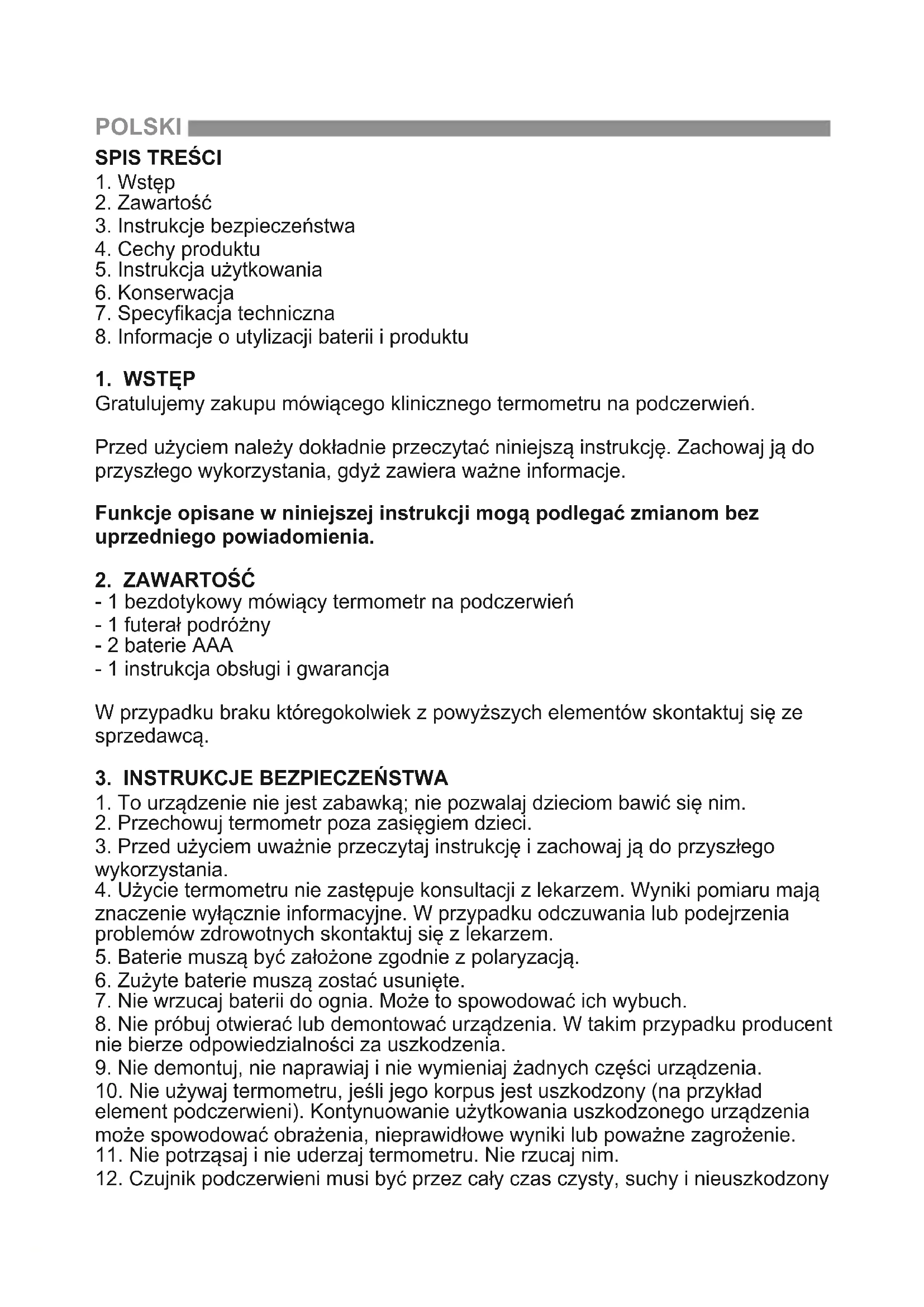 Gratulujemy zakupu mówiącego klinicznego termometru na podczerwień. Przed użyciem należy dokładnie przeczytać niniejszą instrukcję. Zachowaj ją do przyszłego wykorzystania, gdyż zawiera ważne informacje. Funkcje opisane w niniejszej instrukcji mogą podlegać zmianom bez uprzedniego powiadomienia.