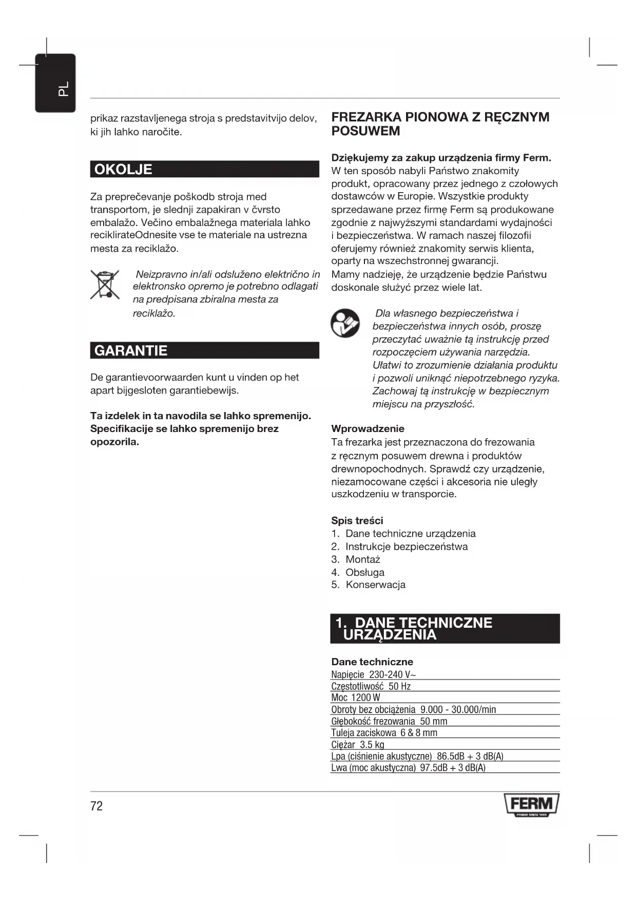 POSUWEM Dziękujemy za zakup urządzenia firmy Ferm. W ten sposób nabyli Państwo znakomity produkt, opracowany przez jednego z czołowych dostawców w Europie. Wszystkie produkty sprzedawane przez firmę Ferm są produkowane zgodnie z najwyższymi standardami wydajności i bezpieczeństwa. W ramach naszej filozofii oferujemy również znakomity serwis klienta, oparty na wszechstronnej gwarancji. Mamy nadzieję, że urządzenie będzie Państwu doskonale służyć przez wiele lat. Dla własnego bezpieczeństwa i bezpieczeństwa innych osób, proszę przeczytać uważnie tą instrukcję przed rozpoczęciem używania narzędzia. Ułatwi to zrozumienie działania produktu i pozwoli uniknąć niepotrzebnego ryzyka. Zachowaj tą instrukcję w bezpiecznym miejscu na przyszłość. Wprowadzenie Ta frezarka jest przeznaczona do frezowania z ręcznym posuwem drewna i produktów drewnopochodnych. Sprawdź czy urządzenie, niezamocowane części i akcesoria nie uległy uszkodzeniu w transporcie. Spis treści