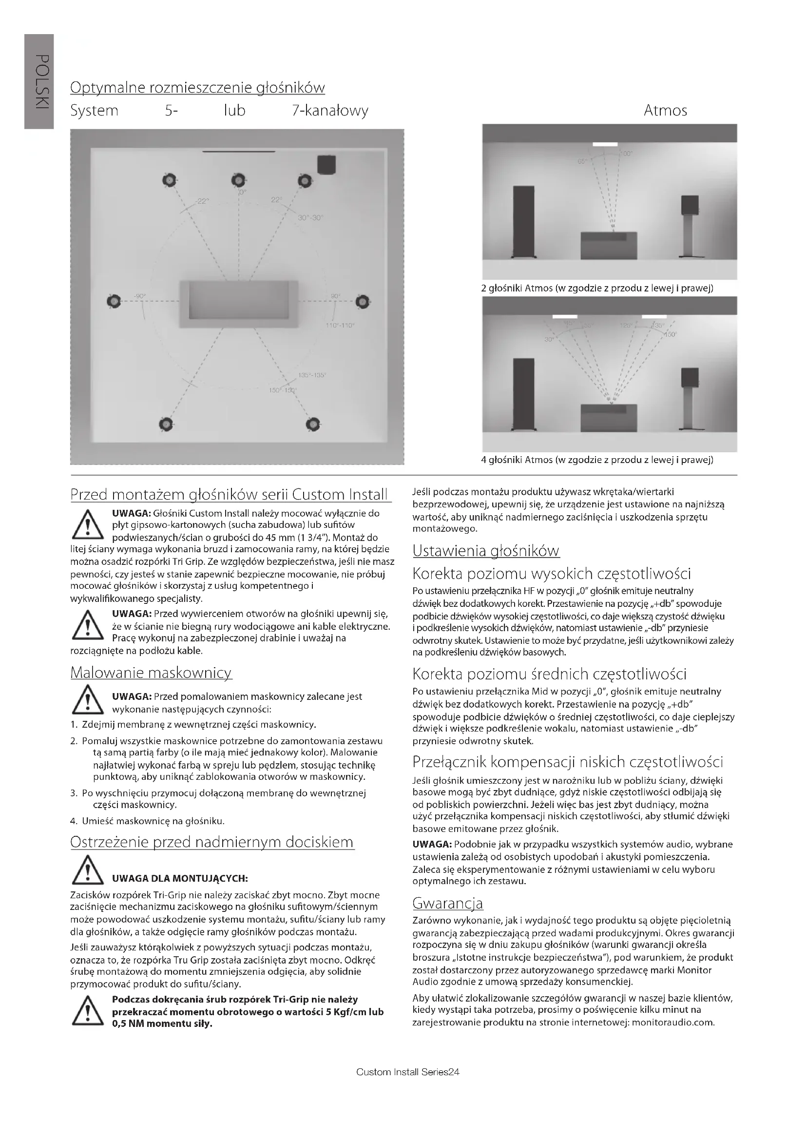 Ostrzeżenie przed nadmiernym dociskiem UWAGA DLA MONTUJĄCYCH: Zacisków rozpórek Tri-Grip nie należy zaciskać zbyt mocno. Zbyt mocne zaciśnięcie mechanizmu zaciskowego na głośniku sutowym/ściennym może powodować uszkodzenie systemu montażu, sutu/ściany lub ramy dla głośników, a także odgięcie ramy głośników podczas montażu. Jeśli zauważysz którąkolwiek z powyższych sytuacji podczas montażu, oznacza to, że rozpórka Tru Grip została zaciśnięta zbyt mocno. Odkręć śrubę montażową do momentu zmniejszenia odgięcia, aby solidnie przymocować produkt do sutu/ściany. Podczas dokręcania śrub rozpórek Tri-Grip nie należy przekraczać momentu obrotowego o wartości 5 Kgf/cm lub 0,5 NM momentu siły. Jeśli podczas montażu produktu używasz wkrętaka/wiertarki bezprzewodowej, upewnij się, że urządzenie jest ustawione na najniższą wartość, aby uniknąć nadmiernego zaciśnięcia i uszkodzenia sprzętu montażowego. Ustawienia głośników Korekta poziomu wysokich częstotliwości Po ustawieniu przełącznika HF w pozycji „0” głośnik emituje neutralny dźwięk bez dodatkowych korekt. Przestawienie na pozycję „+db” spowoduje podbicie dźwięków wysokiej częstotliwości, co daje większą czystość dźwięku i podkreślenie wysokich dźwięków, natomiast ustawienie „-db” przyniesie odwrotny skutek. Ustawienie to może być przydatne, jeśli użytkownikowi zależy na podkreśleniu dźwięków basowych. Korekta poziomu średnich częstotliwości Po ustawieniu przełącznika Mid w pozycji „0”, głośnik emituje neutralny dźwięk bez dodatkowych korekt. Przestawienie na pozycję „+db” spowoduje podbicie dźwięków o średniej częstotliwości, co daje cieplejszy dźwięk i większe podkreślenie wokalu, natomiast ustawienie „-db” przyniesie odwrotny skutek. Przełącznik kompensacji niskich częstotliwości Jeśli głośnik umieszczony jest w narożniku lub w pobliżu ściany, dźwięki basowe mogą być zbyt dudniące, gdyż niskie częstotliwości odbijają się od pobliskich powierzchni. Jeżeli więc bas jest zbyt dudniący, można użyć przełącznika kompensacji niskich częstotliwości, aby stłumić dźwięki basowe emitowane przez głośnik. UWAGA: Podobnie jak w przypadku wszystkich systemów audio, wybrane ustawienia zależą od osobistych upodobań i akustyki pomieszczenia. Zaleca się eksperymentowanie z różnymi ustawieniami w celu wyboru optymalnego ich zestawu. Gwarancja Zarówno wykonanie, jak i wydajność tego produktu są objęte pięcioletnią gwarancją zabezpieczającą przed wadami produkcyjnymi. Okres gwarancji rozpoczyna się w dniu zakupu głośników (warunki gwarancji określa broszura „Istotne instrukcje bezpieczeństwa”), pod warunkiem, że produkt został dostarczony przez autoryzowanego sprzedawcę marki Monitor Audio zgodnie z umową sprzedaży konsumenckiej. Aby ułatwić zlokalizowanie szczegółów gwarancji w naszej bazie klientów, kiedy wystąpi taka potrzeba, prosimy o poświęcenie kilku minut na zarejestrowanie produktu na stronie internetowej: monitoraudio.com. Optymalne rozmieszczenie głośników System 5- lub 7-kanałowy Atmos POLSKI Custom Install Series24 90° -90° 110°-110° 135°-135° 150°-150°