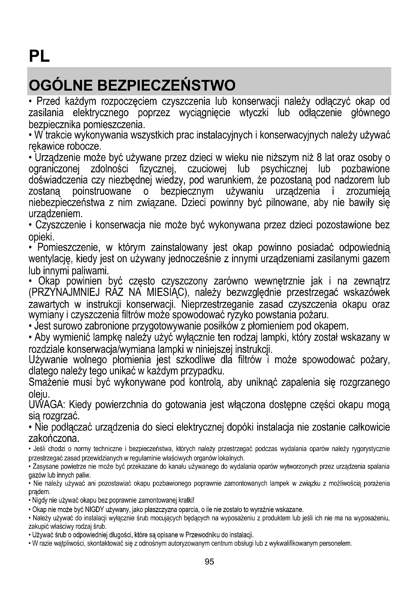 - Okap powinien być często czyszczony zarówno wewnętrznie jak i na zewnątrz (PRZYNAJMNIEJ RAZ NA MIESIĄC), należy bezwzględnie przestrzegać wskazówek zawartych w instrukcji konserwacji. Nieprzestrzeganie zasad czyszczenia okapu oraz wymiany i czyszczenia filtrów może spowodować ryzyko powstania pożaru.