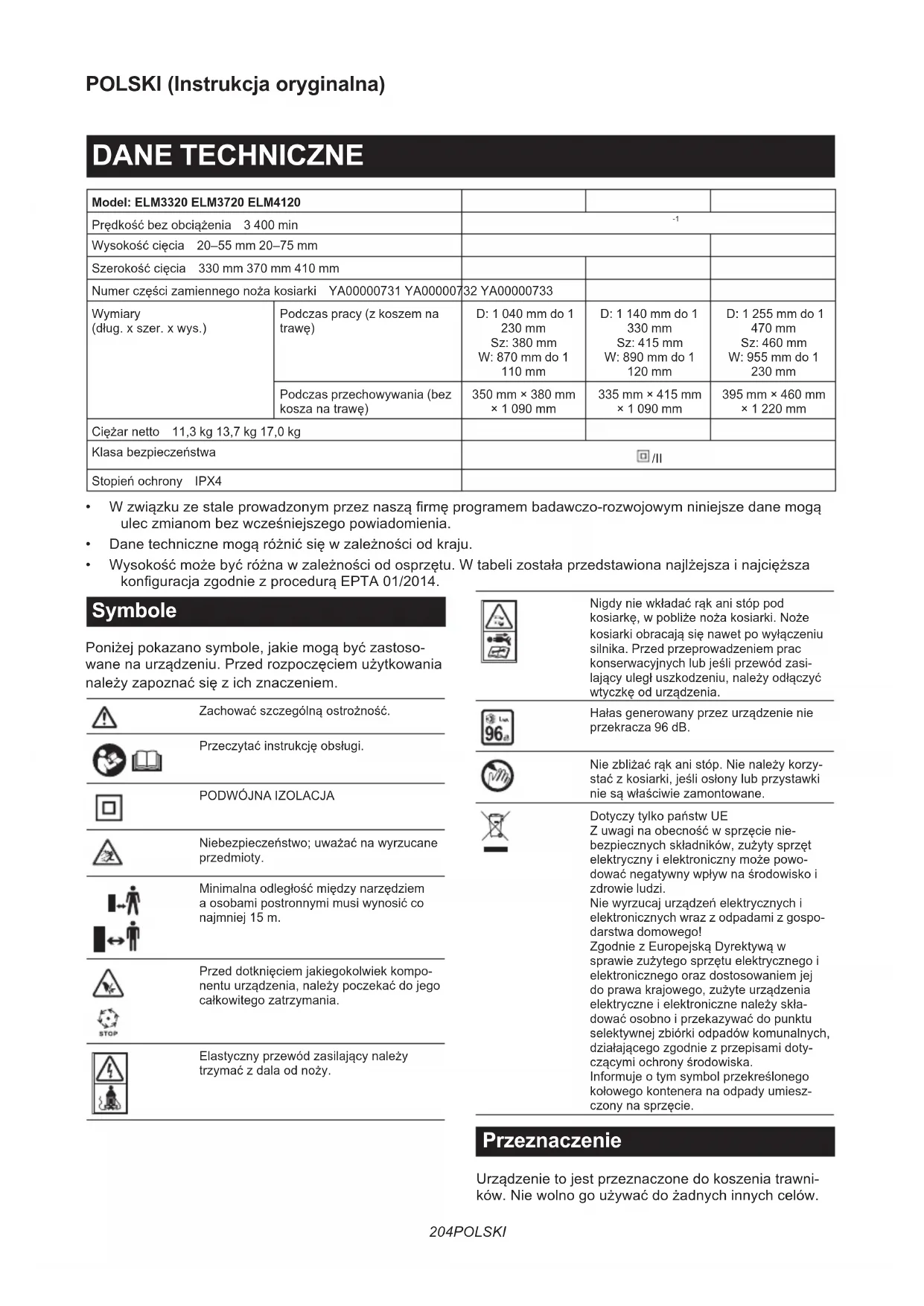 Niebezpieczeństwo;uważaćnawyrzucane przedmioty. Minimalnaodległośćmiędzynarzędziem aosobamipostronnymimusiwynosićco najmniej15m. Przeddotknięciemjakiegokolwiekkompo- nentuurządzenia,należypoczekaćdojego całkowitegozatrzymania. Elastycznyprzewódzasilającynależy trzymaćzdalaodnoży. Nigdyniewkładaćrąkanistóppod kosiarkę,wpobliżenożakosiarki.Noże kosiarkiobracająsięnawetpowyłączeniu silnika. Przed przeprowadzeniem prac konserwacyjnychlubjeśliprzewódzasi- lającyuległuszkodzeniu,należyodłączyć wtyczkęodurządzenia. Hałasgenerowanyprzezurządzenienie przekracza 96 dB. Niezbliżaćrąkanistóp.Nienależykorzy- staćzkosiarki,jeśliosłonylubprzystawki niesąwłaściwiezamontowane. DotyczytylkopaństwUE Zuwaginaobecnośćwsprzęcienie- bezpiecznychskładników,zużytysprzęt elektrycznyielektronicznymożepowo- dowaćnegatywnywpływnaśrodowiskoi zdrowie ludzi. Niewyrzucajurządzeńelektrycznychi elektronicznych wraz z odpadami z gospo- darstwa domowego! ZgodniezEuropejskąDyrektywąw sprawiezużytegosprzętuelektrycznegoi elektronicznegoorazdostosowaniemjej doprawakrajowego,zużyteurządzenia elektryczneielektronicznenależyskła- dowaćosobnoiprzekazywaćdopunktu selektywnejzbiórkiodpadówkomunalnych, działającegozgodniezprzepisamidoty- czącymiochronyśrodowiska. Informujeotymsymbolprzekreślonego kołowegokonteneranaodpadyumiesz- czonynasprzęcie. Przeznaczenie Urządzenietojestprzeznaczonedokoszeniatrawni- ków.Niewolnogoużywaćdożadnychinnychcelów.205 POLSKI Używanieurządzeniadocelówinnychniżprzewidziane możepowodowaćniebezpiecznesytuacje. Zasilanie Narzędziewolnopodłączaćtylkodoźródełzasilaniao napięciuzgodnymznapięciempodanymnatabliczce znamionowej.Możnajezasilaćwyłączniejednofazo- wymprądemprzemiennym.Narzędziemapodwójną izolację,dlategoteżmożnajezasilaćzgniazdaelek- trycznego bez uziemienia. Abyuniknąćniebezpieczeństwa,uszkodzonyprzewód zasilającymusizostaćwymienionyprzezproducenta lubjegoprzedstawiciela. Dotyczy niskonapięciowych sieci elektroenergetycznych o napięciu pomiędzy 220 V a 250 V Włączanieiwyłączanieurządzeńelektrycznychpowo- dujewahanianapięcia.Posługiwaniesięnarzędziem przyniesprzyjającychparametrachzasilaniamożemieć niekorzystnywpływnadziałanieinnychurządzeń.Jeśli impedancjasiecielektrycznejjestmniejszalubrówna 0,425 oma (model ELM3720) lub 0,427 oma (model ELM4120),możnazałożyć,żeniekorzystneefektynie wystąpią.Gniazdosiecioweużywanedopodłączenia tegourządzeniapowinnobyćzabezpieczonebezpiecz- nikiemlubwyłącznikiemozwłocznejcharakterystyce wyłączania. Hałas Obowiązującanorma:ENIEC62841-4-3 Model Poziomciśnieniaakustycznego Poziomnatężeniadźwięku