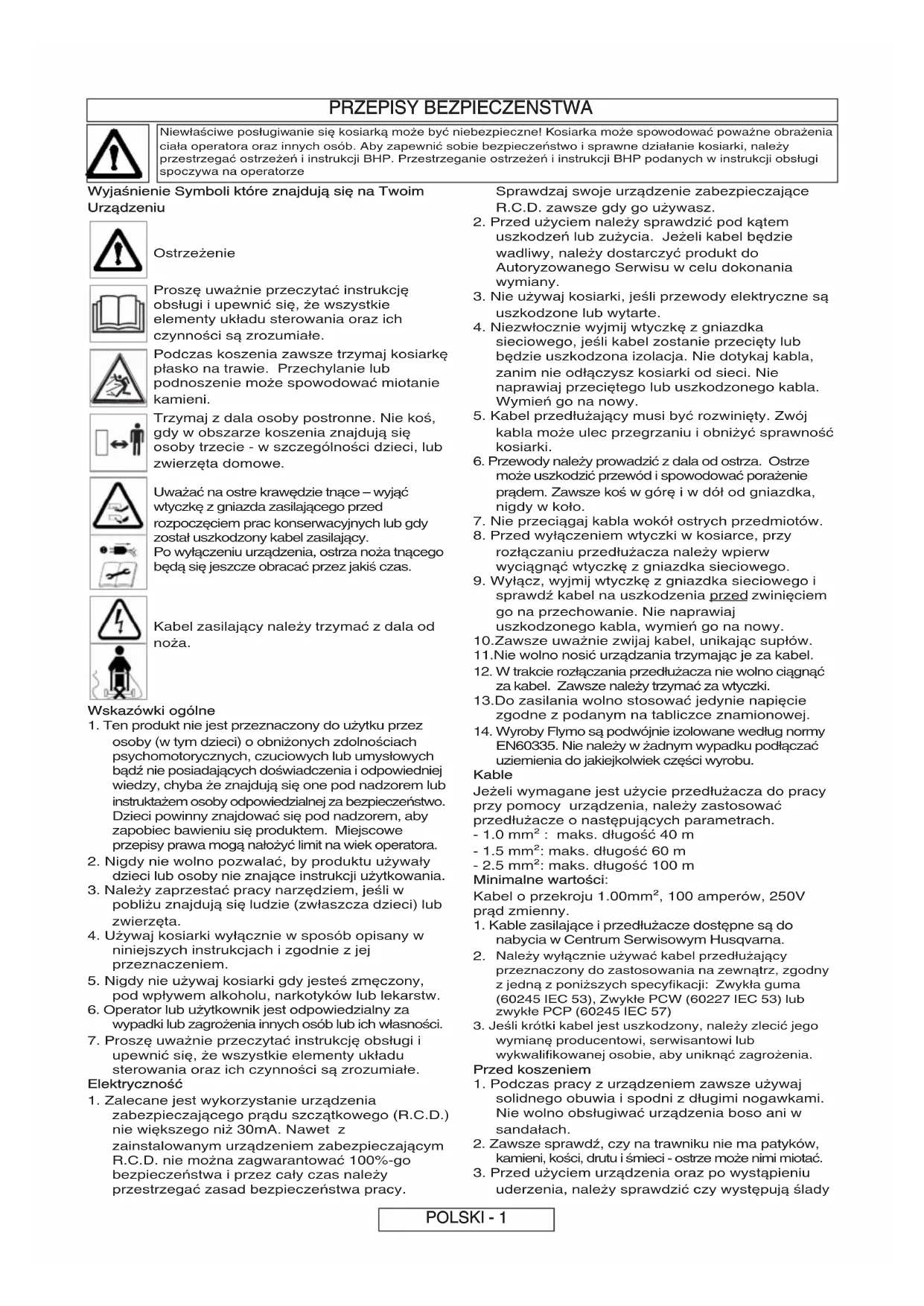 330 Hivatkozási szám: FLY007350 Hivatkozási szám: FLY008400 Hivatkozási szám: FLY048Alkatrészszám: 511835790Alkatrészszám: 512733490Alkatrészszám: 511864790PRZEPISY BEZPIECZENSTWA Wyjaśnienie Symboli które znajdują się na Twoim Urządzeniu Ostrzeżenie Proszę uważnie przeczytać instrukcję obsługi i upewnić się, że wszystkie elementy układu sterowania oraz ich czynności są zrozumiałe. Podczas koszenia zawsze trzymaj kosiarkę płasko na trawie. Przechylanie lub podnoszenie może spowodować miotanie kamieni. Trzymaj z dala osoby postronne. Nie koś, gdy w obszarze koszenia znajdują się osoby trzecie - w szczególności dzieci, lub zwierzęta domowe. Uważać na ostre krawędzie tnące – wyjąć wtyczkę z gniazda zasilającego przed rozpoczęciem prac konserwacyjnych lub gdy został uszkodzony kabel zasilający. Po wyłączeniu urządzenia, ostrza noża tnącego będą się jeszcze obracać przez jakiś czas. Kabel zasilający należy trzymać z dala od noża. Wskazówki ogólne