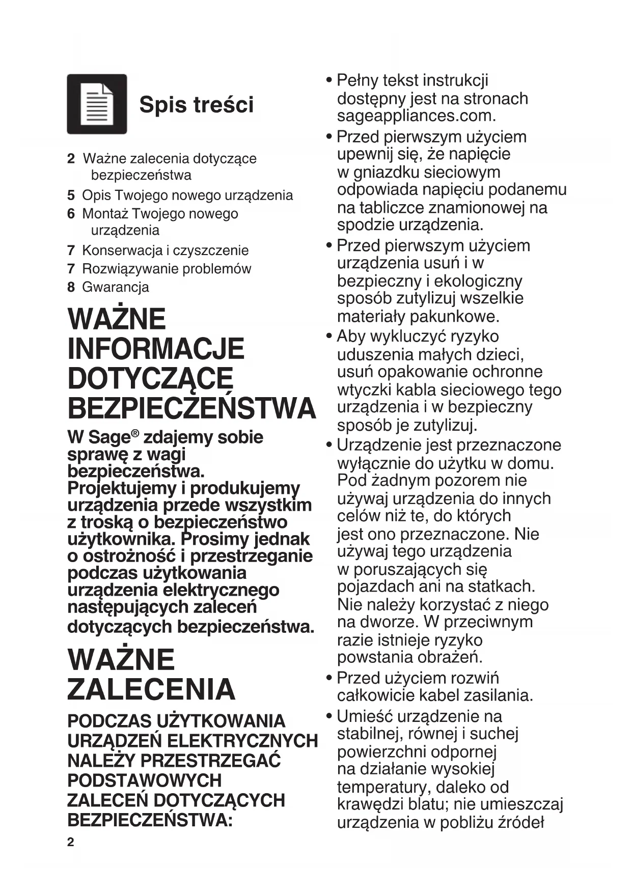 - Pełny tekst instrukcji dostępny jest na stronach sageappliances.com.