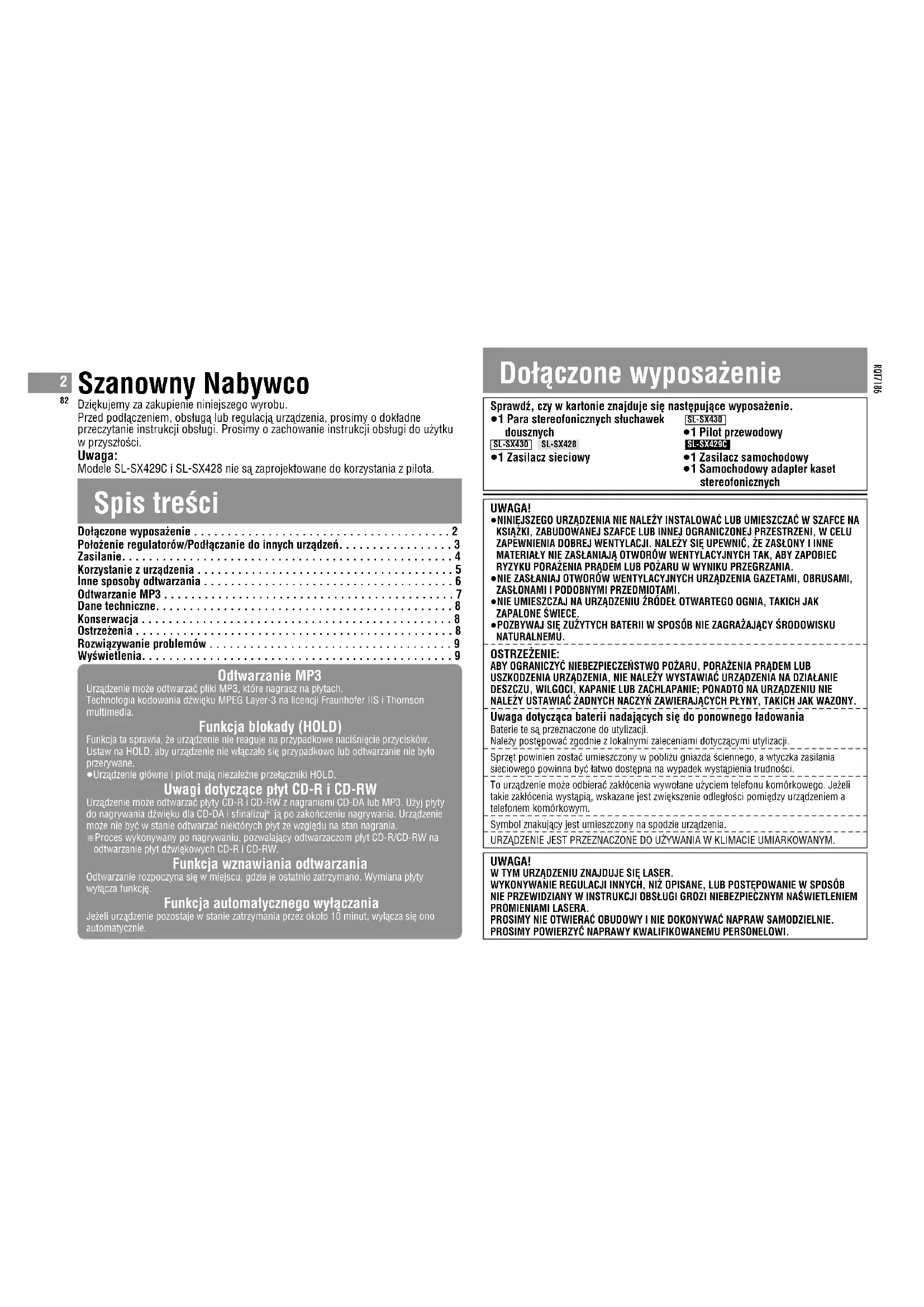 Sprawdœ, czy w kartonie znajduje siè nastèpujàce wyposaëenie. Spis treøci Szanowny Nabywco Dzièkujemy za zakupienie niniejszego wyrobu. Przed podìàczeniem, obsìugà lub regulacjà urzàdzenia, prosimy o dokìadne przeczytanie instrukcji obsìugi. Prosimy o zachowanie instrukcji obsìugi do uëytku w przyszìoøci. Uwaga: Modele SL-SX429C i SL-SX428 nie sà zaprojektowane do korzystania z pilota. Odtwarzanie MP3 Urzàdzenie moëe odtwarzaã pliki MP3, które nagrasz na pìytach. Technologia kodowania dœwièku MPEG Layer-3 na licencji Fraunhofer IIS i Thomson multimedia. Funkcja blokady (HOLD) Funkcja ta sprawia, ëe urzàdzenie nie reaguje na przypadkowe naciøniècie przycisków. Ustaw na HOLD, aby urzàdzenie nie wìàczaìo siè przypadkowo lub odtwarzanie nie byìo przerywane. ≥Urzàdzenie gìówne i pilot majà niezaleëne przeìàczniki HOLD. Uwagi dotyczàce pìyt CD-R i CD-RW Urzàdzenie moëe odtwarzaã pìyty CD-R i CD-RW z nagraniami CD-DA lub MP3. Uëyj pìyty do nagrywania dœwièku dla CD-DA i sfinalizuj