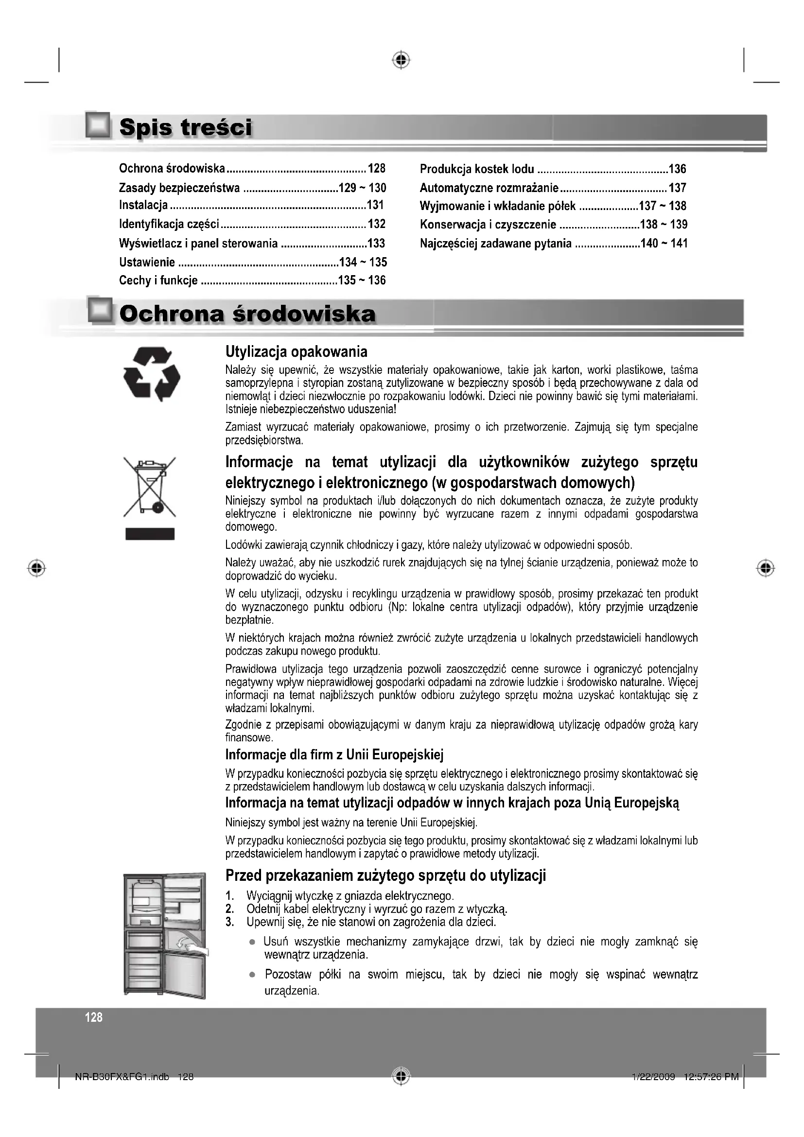 - ● Kontrollér, om køleskabet er i Holiday-tilstand (ferie). NR-B30FX&FG1.indb 127NR-B30FX&FG1.indb 127 1/22/2009 12:57:26 PM1/22/2009 12:57:26 PM128 Ochrona środowiska p. 128