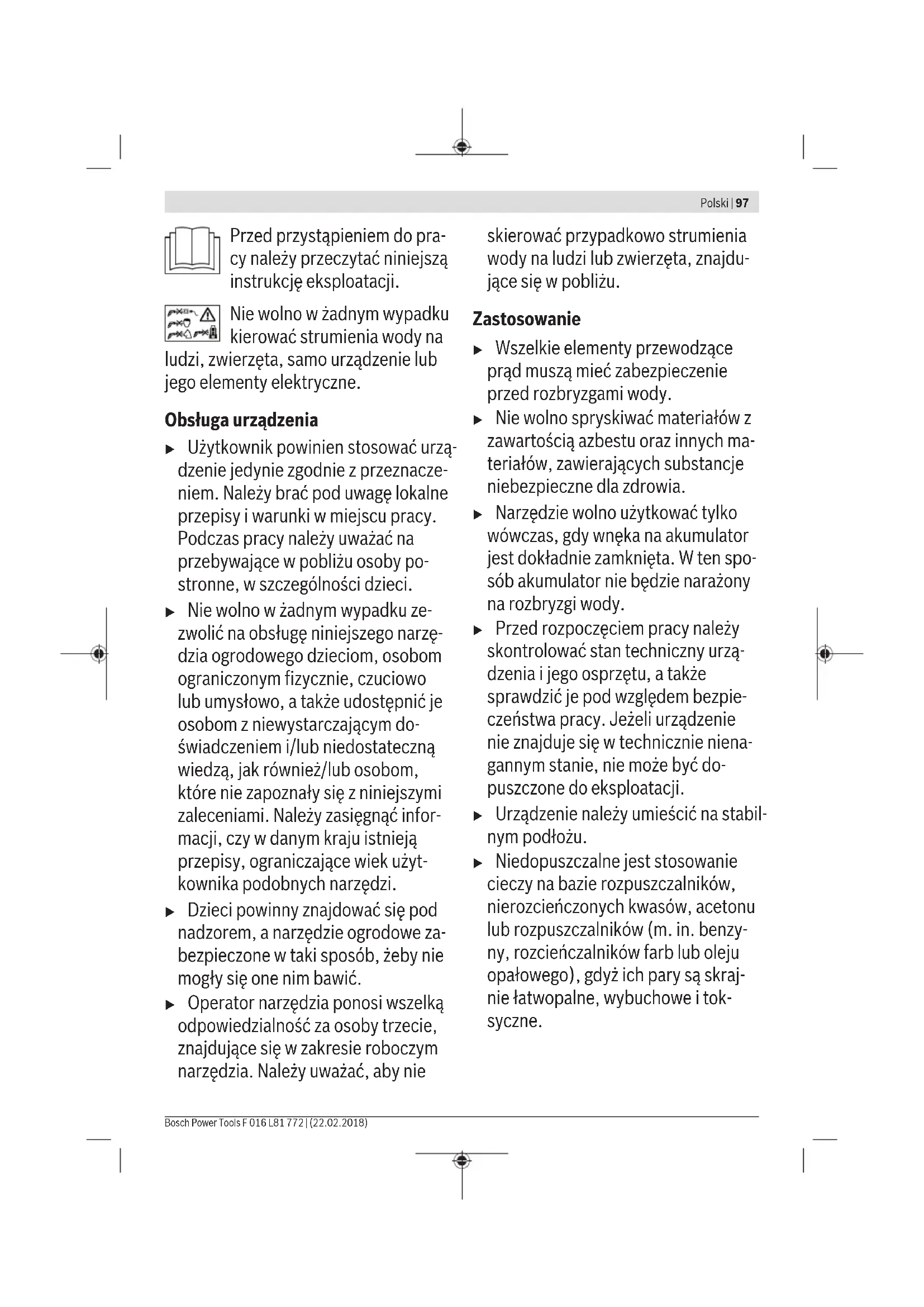 Niewolnowzadnym wypadku zezwolic na obstuge niniejszego narzedzia ogrodowego daneicom, osobom ograniczonym fizycznie, czuciwo lub umyslowo, a takze udostepnic je osobom z niewystarczajacym do-swiaedzieniem i/lub niedostatecznag wiedza, jak rowniez/lub osobom, ktore nie zapoznały sie z niniejszymi zaleceniami. Nalezy zasięgnac informaci,czy w danym kraju istnieja przyepamy, ograniczajace wiek uzytkownik podobnych narzedzi.
