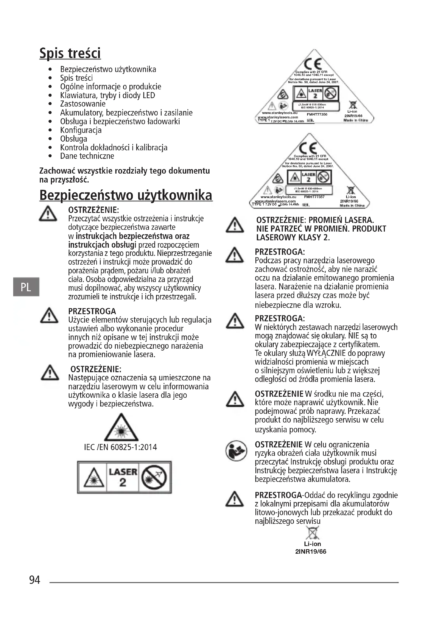 - Ten produkt laserowy nie nadaje się do naprawy przez użytkownika iwymaga przekazania do dystrybutora lub centrum obsługi gwarancyjnej/ serwisowej Stanley wprzypadku usterki lub uszkodzenia. Urządzenie musi być serwisowane przez odpowiednio wykwalikowanego technika, stosującego jedynie identyczne części zamienne. Zapewni to utrzymanie bezpieczeństwa produktu.97
