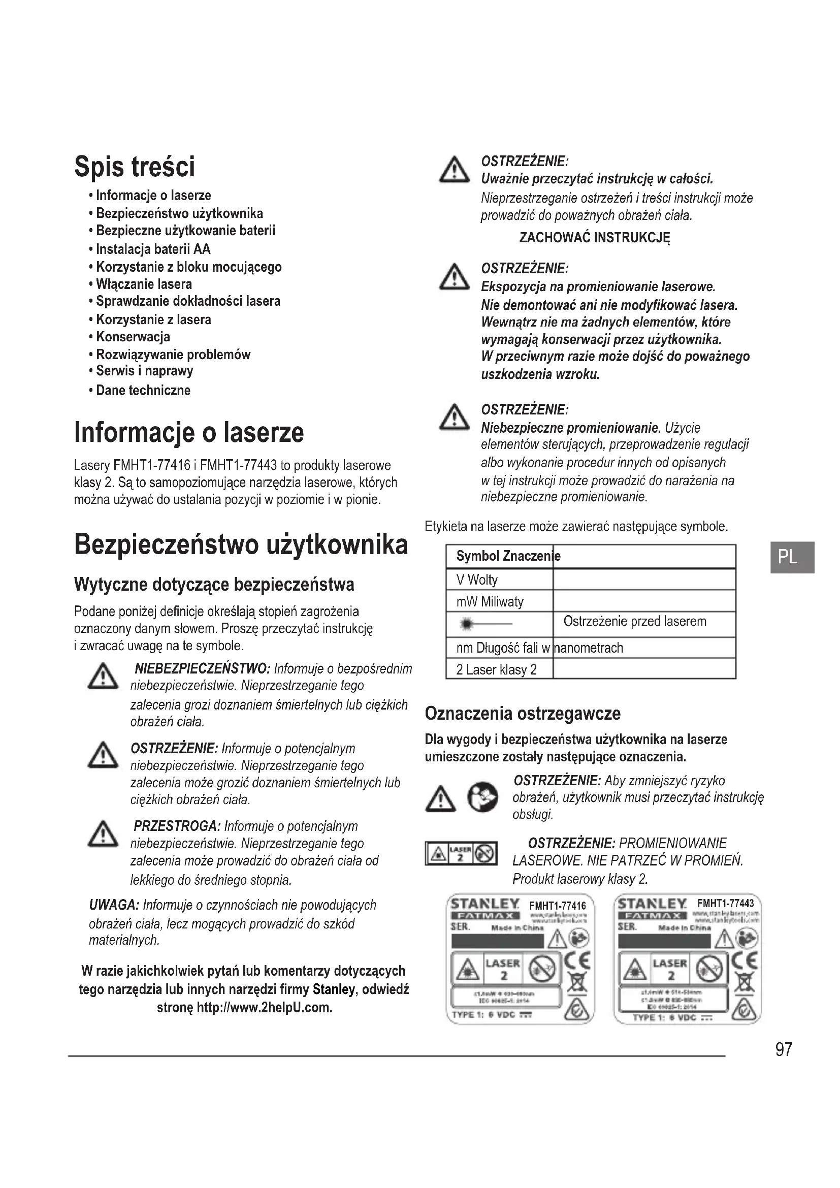 - Dane techniczne Informacje o laserze Lasery FMHT1-77416 i FMHT1-77443 to produkty laserowe klasy 2. Są to samopoziomujące narzędzia laserowe, których można używać do ustalania pozycji w poziomie i w pionie. Bezpieczeństwo użytkownika Wytyczne dotyczące bezpieczeństwa Podane poniżej denicje określają stopień zagrożenia oznaczony danym słowem. Proszę przeczytać instrukcję i zwracać uwagę na te symbole. NIEBEZPIECZEŃSTWO: Informuje o bezpośrednim niebezpieczeństwie. Nieprzestrzeganie tego zalecenia grozi doznaniem śmiertelnych lub ciężkich obrażeń ciała. OSTRZEŻENIE: Informuje o potencjalnym niebezpieczeństwie. Nieprzestrzeganie tego zalecenia może grozić doznaniem śmiertelnych lub ciężkich obrażeń ciała. PRZESTROGA: Informuje o potencjalnym niebezpieczeństwie. Nieprzestrzeganie tego zalecenia może prowadzić do obrażeń ciała od lekkiego do średniego stopnia. UWAGA: Informuje o czynnościach nie powodujących obrażeń ciała, lecz mogących prowadzić do szkód materialnych. W razie jakichkolwiek pytań lub komentarzy dotyczących tego narzędzia lub innych narzędzi rmy Stanley, odwiedź stronę http://www.2helpU.com. OSTRZEŻENIE: Uważnie przeczytać instrukcję w całości. Nieprzestrzeganie ostrzeżeń i treści instrukcji może prowadzić do poważnych obrażeń ciała. ZACHOWAĆ INSTRUKCJĘ OSTRZEŻENIE: Ekspozycja na promieniowanie laserowe. Nie demontować ani nie modykować lasera. Wewnątrz nie ma żadnych elementów, które wymagają konserwacji przez użytkownika. W przeciwnym razie może dojść do poważnego uszkodzenia wzroku. OSTRZEŻENIE: Niebezpieczne promieniowanie. Użycie elementów sterujących, przeprowadzenie regulacji albo wykonanie procedur innych od opisanych w tej instrukcji może prowadzić do narażenia na niebezpieczne promieniowanie. Etykieta na laserze może zawierać następujące symbole. Symbol Znaczenie V Wolty mW Miliwaty Ostrzeżenie przed laserem nm Długość fali w nanometrach 2 Laser klasy 2 Oznaczenia ostrzegawcze Dla wygody i bezpieczeństwa użytkownika na laserze umieszczone zostały następujące oznaczenia. OSTRZEŻENIE: Aby zmniejszyć ryzyko obrażeń, użytkownik musi przeczytać instrukcję obsługi.