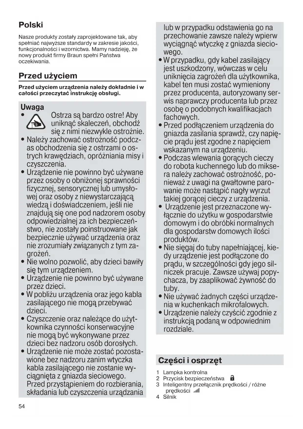 Podczas wlewania gorących cieczy do robota kuchennego lub do mikse- ra należy zachować ostrożność, po- nieważ z uwagi na gwałtowne paro- wanie może nastąpić nagły wyrzut takiej gorącej cieczy z urządzenia.