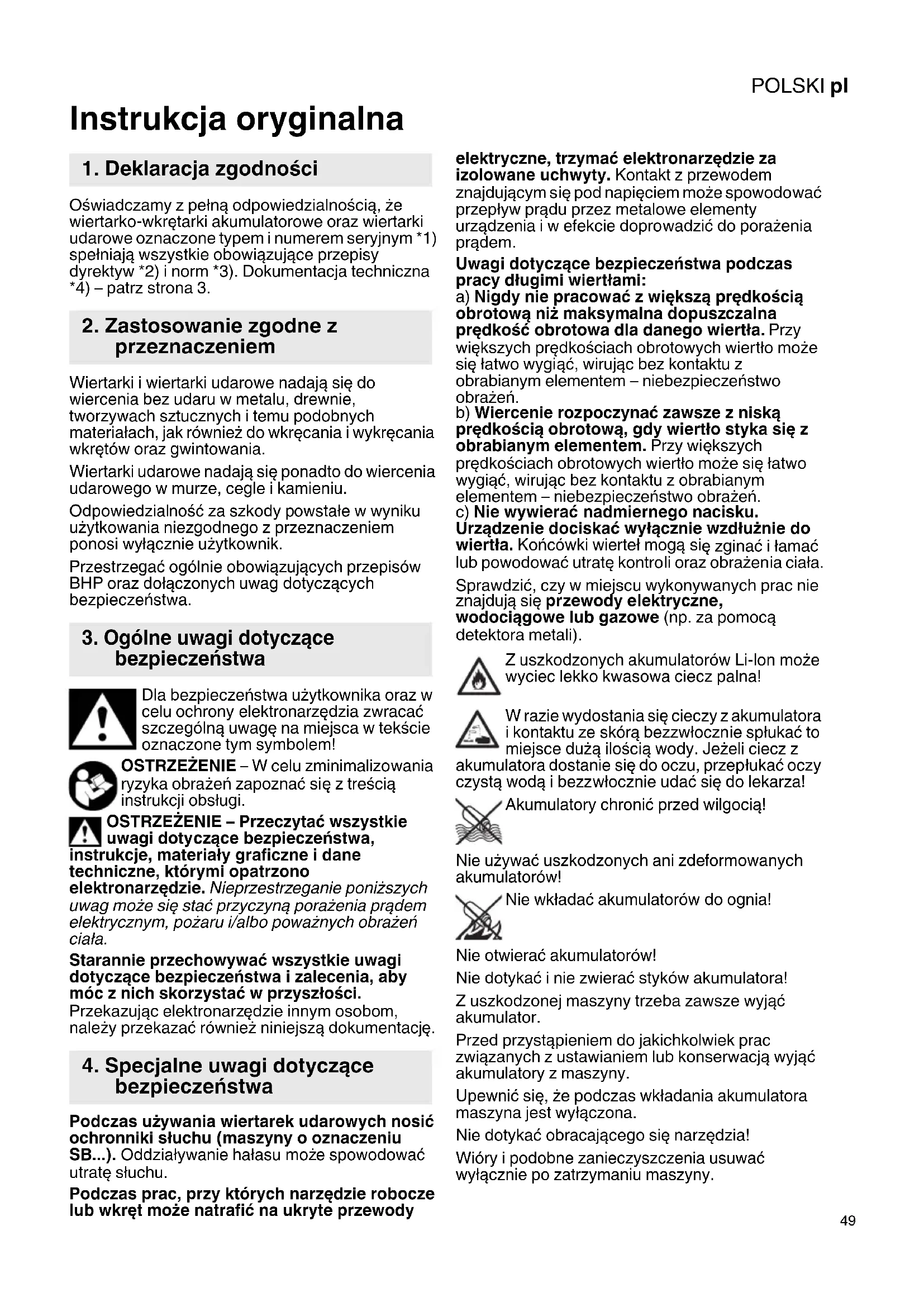 Instrukcja oryginalna Oświadczamy z pełną odpowiedzialnością, że wiertarko-wkrętarki akumulatorowe oraz wiertarki udarowe oznaczone typem i numerem seryjnym *1) spełniają wszystkie obowiązujące przepisy dyrektyw *2) i norm *3). Dokumentacja techniczna *4) – patrz strona 3. Wiertarki i wiertarki udarowe nadają się do wiercenia bez udaru w metalu, drewnie, tworzywach sztucznych i temu podobnych materiałach, jak również do wkręcania i wykręcania wkrętów oraz gwintowania. Wiertarki udarowe nadają się ponadto do wiercenia udarowego w murze, cegle i kamieniu. Odpowiedzialność za szkody powstałe w wyniku użytkowania niezgodnego z przeznaczeniem ponosi wyłącznie użytkownik. Przestrzegać ogólnie obowiązujących przepisów BHP oraz dołączonych uwag dotyczących bezpieczeństwa. Dla bezpieczeństwa użytkownika oraz w celu ochrony elektronarzędzia zwracać szczególną uwagę na miejsca w tekście oznaczone tym symbolem! OSTRZEŻENIE – W celu zminimalizowania ryzyka obrażeń zapoznać się z treścią instrukcji obsługi. OSTRZEŻENIE – Przeczytać wszystkie uwagi dotyczące bezpieczeństwa, instrukcje, materiały graficzne i dane techniczne, którymi opatrzono elektronarzędzie. Nieprzestrzeganie poniższych uwag może się stać przyczyną porażenia prądem elektrycznym, pożaru i/albo poważnych obrażeń ciała. Starannie przechowywać wszystkie uwagi dotyczące bezpieczeństwa i zalecenia, aby móc z nich skorzystać w przyszłości. Przekazując elektronarzędzie innym osobom, należy przekazać również niniejszą dokumentację. Podczas uż ywania wiertarek udarowych nosić ochronniki słuchu (maszyny o oznaczeniu SB...). Oddziaływanie hałasu może spowodować utratę słuchu. Podczas prac, przy których narzędzie robocze lub wkręt może natrafić na ukryte przewody elektryczne, trzymać elektronarzędzie za izolowane uchwyty. Kontakt z przewodem znajdującym się pod napięciem może spowodować przepływ prądu przez metalowe elementy urządzenia i w efekcie doprowadzić do porażenia prądem. Uwagi dotyczące bezpieczeństwa podczas pracy długimi wiertłami: a) Nigdy nie pracować z większą prędkością obrotową niż maksymalna dopuszczalna prędkość obrotowa dla danego wiertła. Przy większych prędkościach obrotowych wiertło może się łatwo wygiąć, wirując bez kontaktu z obrabianym elementem – niebezpieczeństwo obrażeń. b) Wiercenie rozpoczynać zawsze z niską prędkością obrotową, gdy wiertło styka się z obrabianym elementem. Przy większych prędkościach obrotowych wiertło może się łatwo wygiąć, wirując bez kontaktu z obrabianym elementem – niebezpieczeństwo obrażeń. c) Nie wywierać nadmiernego nacisku. Urządzenie dociskać wyłącznie wzdłużnie do wiertła. Końcówki wierteł mogą si ę zginać i łamać lub powodować utratę kontroli oraz obrażenia ciała. Sprawdzić, czy w miejscu wykonywanych prac nie znajdują się przewody elektryczne, wodociągowe lub gazowe (np. za pomocą detektora metali). Z uszkodzonych akumulatorów Li-Ion może wyciec lekko kwasowa ciecz palna! W razie wydostania się cieczy z akumulatora i kontaktu ze skórą bezzwłocznie spłukać to miejsce dużą ilością wody. Jeżeli ciecz z akumulatora dostanie się do oczu, przepłukać oczy czystą wodą i bezzwłocznie udać się do lekarza! Akumulatory chronić przed wilgocią! Nie używać uszkodzonych ani zdeformowanych akumulatorów! Nie wkładać akumulatorów do ognia! Nie otwierać akumulatorów! Nie dotykać i nie zwierać styków akumulatora! Z uszkodzonej maszyny trzeba zawsze wyjąć akumulator. Przed przystąpieniem do jakichkolwiek prac związanych z ustawianiem lub konserwacją wyjąć akumulatory z maszyny. Upewnić się, że podczas wkładania akumulatora maszyna jest wyłączona. Nie dotykać obracającego się narzędzia! Wióry i podobne zanieczyszczenia usuwać wyłącznie po zatrzymaniu maszyny.
