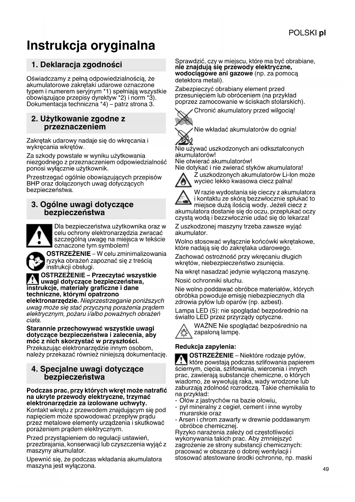 Instrukcja oryginalna Oświadczamy z pełną odpowiedzialnością, że akumulatorowe zakrętaki udarowe oznaczone typem i numerem seryjnym *1) spełniają wszystkie obowiązujące przepisy dyrektyw *2) i norm *3). Dokumentacja techniczna *4) – patrz strona 3. Zakrętak udarowy nadaje się do wkręcania i wykręcania wkrętów. Za szkody powstałe w wyniku użytkowania niezgodnego z przeznaczeniem odpowiedzialność ponosi wyłącznie użytkownik. Przestrzegać ogólnie obowiązujących przepisów BHP oraz dołączonych uwag dotyczących bezpieczeństwa. Dla bezpieczeństwa użytkownika oraz w celu ochrony elektronarzędzia zwracać szczególną uwagę na miejsca w tekście oznaczone tym symbolem! OSTRZEŻENIE – W celu zminimalizowania ryzyka obrażeń zapoznać się z treścią instrukcji obsługi. OSTRZEŻENIE – Przeczytać wszystkie uwagi dotyczące bezpieczeństwa, instrukcje, materiały graficzne i dane techniczne, którymi opatrzono elektronarzędzie. Nieprzestrzeganie poniższych uwag może się stać przyczyną porażenia prądem elektrycznym, pożaru i/albo poważnych obrażeń ciała. Starannie przechowywać wszystkie uwagi dotyczące bezpieczeństwa i zalecenia, aby móc z nich skorzystać w przyszłości. Przekazując elektronarzędzie innym osobom, należy przekazać również niniejszą dokumentację. Podczas prac, przy których wkręt może natrafić na ukryte przewody elektryczne, trzymać elektronarzędzie za izolowane uchwyty. Kontakt wkrętu z przewodem znajdującym się pod napięciem może spowodować przepływ prądu przez metalowe elementy urządzenia i skutkować porażeniem prądem elektrycznym. Przed przystąpieniem do regulacji ustawień, przezbrajania, konserwacji lub czyszczenia wyjąć z maszyny akumulator. Upewnić się, że podczas wkładania akumulatora maszyna jest wyłączona. Sprawdzić, czy w miejscu, które ma być obrabiane, nie znajdują się przewody elektryczne, wodociągowe ani gazowe (np. za pomocą detektora metali). Zabezpieczyć obrabiany element przed przesunięciem lub obróceniem (na przykład poprzez zamocowanie w ściskach stolarskich). Chronić akumulatory przed wilgocią! Nie wkładać akumulatorów do ognia! Nie używać uszkodzonych ani odkształconych akumulatorów! Nie otwierać akumulatorów! Nie dotykać i nie zwiera ć styków akumulatora! Z uszkodzonych akumulatorów Li-Ion może wyciec lekko kwasowa ciecz palna! W razie wydostania się cieczy z akumulatora i kontaktu ze skórą bezzwłocznie spłukać to miejsce dużą ilością wody. Jeżeli ciecz z akumulatora dostanie się do oczu, przepłukać oczy czystą wodą i bezzwłocznie udać się do lekarza! Z uszkodzonej maszyny trzeba zawsze wyjąć akumulator. Wolno stosować wyłącznie końcówki wkrętakowe, które nadają się do zakrętaka udarowego. Zachować ostrożność przy wkręcaniu długich wkrętów, niebezpieczeństwo zsunięcia. Na wkręt nasadzać jedynie wyłączoną maszynę. Nosić ochronniki słuchu. Nie wolno poddawa ć obróbce materiałów, których obróbka powoduje emisję niebezpiecznych dla zdrowia pyłów lub oparów (np. azbest). Lampa LED (5): nie spoglądać bezpośrednio na światło LED przez przyrządy optyczne. WAŻNE Nie spoglądać bezpośrednio na zapaloną lampę. Redukcja zapylenia: OSTRZEŻENIE – Niektóre rodzaje pyłów, które powstają podczas szlifowania papierem ściernym, cięcia, szlifowania, wiercenia i innych prac, zawierają substancje chemiczne, o których wiadomo, że wywołują raka, wady wrodzone lub zaburzają zdolność rozrodczą. Takie chemikalia to na przykład: -Ołów z jastrychów na bazie ołowiu, -pył mineralny z cegieł, cement i inne wyroby murarskie oraz - Arsen i chrom zawarty w drewnie poddawanym obróbce chemicznej. Ryzyko narażenia zależy od częstotliwości wykonywania takich prac. Aby zmniejszyć zagrożenie ze strony substancji chemicznych: pracować w obszarze o dobrej wentylacji i stosować atestowane środki ochronne, np. maski