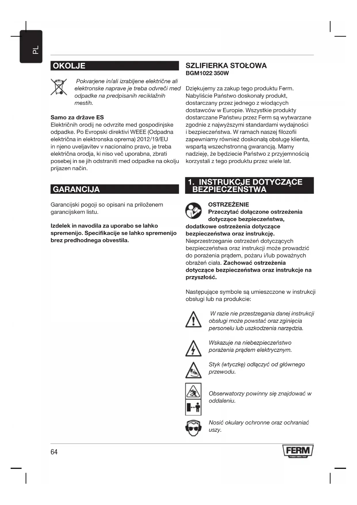 BGM1022 350W Dziękujemy za zakup tego produktu Ferm. Nabyliście Państwo doskonały produkt, dostarczany przez jednego z wiodących dostawców w Europie. Wszystkie produkty dostarczane Państwu przez Ferm są wytwarzane zgodnie z najwyższymi standardami wydajności i bezpieczeństwa. W ramach naszej filozofii zapewniamy również doskonałą obsługę klienta, wspartą wszechstronną gwarancją. Mamy nadzieję, że będziecie Państwo z przyjemnością korzystali z tego produktu przez wiele lat.