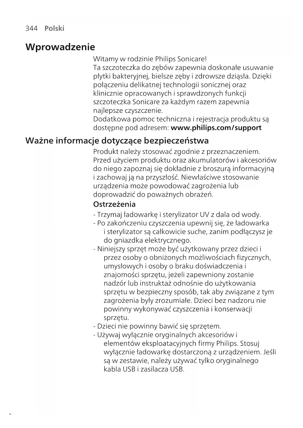 Polski Wprowadzenie Witamy w rodzinie Philips Sonicare! Ta szczoteczka do zębów zapewnia doskonałe usuwanie płytki bakteryjnej, bielsze zęby i zdrowsze dziąsła. Dzięki połączeniu delikatnej technologii sonicznej oraz klinicznie opracowanych i sprawdzonych funkcji szczoteczka Sonicare za każdym razem zapewnia najlepsze czyszczenie. Dodatkowa pomoc techniczna i rejestracja produktu są dostępne pod adresem: www.philips.com/support Ważne informacje dotyczące bezpieczeństwa Produkt należy stosować zgodnie z przeznaczeniem. Przed użyciem produktu oraz akumulatorów i akcesoriów do niego zapoznaj się dokładnie z broszurą informacyjną i zachowaj ją na przyszłość. Niewłaściwe stosowanie urządzenia może powodować zagrożenia lub doprowadzić do poważnych obrażeń. Ostrzeżenia - Trzymaj ładowarkę i sterylizator UV z dala od wody. - Po zakończeniu czyszczenia upewnij się, że ładowarka i sterylizator są całkowicie suche, zanim podłączysz je do gniazdka elektrycznego. - Niniejszy sprzęt może być użytkowany przez dzieci i przez osoby o obniżonych możliwościach fizycznych, umysłowych i osoby o braku doświadczenia i znajomości sprzętu, jeżeli zapewniony zostanie nadzór lub instruktaż odnośnie do użytkowania sprzętu w bezpieczny sposób, tak aby związane z tym zagrożenia były zrozumiałe. Dzieci bez nadzoru nie powinny wykonywać czyszczenia i konserwacji sprzętu. - Dzieci nie powinny bawić się sprzętem. - Używaj wyłącznie oryginalnych akcesoriów i elementów eksploatacyjnych firmy Philips. Stosuj wyłącznie ładowarkę dostarczoną z urządzeniem. Jeśli są w zestawie, należy używać tylko oryginalnego kabla USB i zasilacza USB.345 Polski - To urządzenie nie zawiera elementów, które można samodzielnie wymienić lub naprawić. Jeśli urządzenie jest uszkodzone, nie używaj go i skontaktuj się z Centrum Obsługi Klienta w swoim kraju. Tylko urządzenia z przewodem: Jeśli przewód jest uszkodzony, wymień ładowarkę ze sterylizatorem na nową. - Nie używaj ładowarki i/lub dezynfektora na dworze ani w pobliżu źródeł ciepła. - Nie należy czyścić żadnych części urządzenia w zmywarce do naczyń. - To urządzenie jest przeznaczone wyłącznie do czyszczenia zębów, dziąseł i języka. - Zawsze przechowuj urządzenie poza zasięgiem dzieci. - Przerwij korzystanie z dezynfektora, jeśli żarówka UV pozostaje włączona po otwarciu drzwiczek. Promieniowanie UV może być szkodliwe dla oczu i skóry. - Z dezynfektora należy korzystać wyłącznie z założonym ekranem ochronnym. - Nie dotykaj żarówki sterylizatora UV, gdy jest ona gorąca. - Nie używaj końcówki z połamanym lub wygiętym włosiem. Końcówkę szczoteczki wymieniaj co 3 miesiące lub częściej, gdy widoczne są ślady zużycia. - Unikać kontaktu z produktami zawierającymi olejki eteryczne lub olej kokosowy. Kontakt może spowodować wypadnięcie włosia. - Należy zaprzestać korzystania z urządzenia i skonsultować się z dentystą/lekarzem, jeśli po użyciu wystąpi nadmierne krwawienie, lub jeśli krwawienie nadal występuje po 1 tygodniu użytkowania albo wystąpi dyskomfort lub ból. - W przypadku przejścia operacji szczęki lub dziąseł w ciągu ostatnich 2 miesięcy, przed pierwszym użyciem urządzenia skonsultuj się ze stomatologiem. - Jeśli masz wszczepiony rozrusznik serca lub inne urządzenie, przed użyciem skontaktuj się z lekarzem lub producentem tego urządzenia. - Jeśli masz obawy dotyczące zdrowia, przed skorzystaniem z urządzenia skonsultuj się z lekarzem.346 Polski - To urządzenie do higieny osobistej, które nie jest przeznaczone do użytku przez większą liczbę pacjentów w gabinetach i placówkach stomatologicznych. Instrukcje dotyczące bezpieczeństwa podczas korzystania z baterii i akumulatorów - To urządzenie zawiera akumulatory, który może wyjąć jedynie odpowiednio przeszkolona osoba. - Produkt należy stosować zgodnie z przeznaczeniem. Przed użyciem produktu oraz akumulatorów i akcesoriów do niego zapoznaj się dokładnie z broszurą informacyjną i zachowaj ją na przyszłość. Niewłaściwe stosowanie urządzenia może powodować zagrożenia lub doprowadzić do poważnych obrażeń. Akcesoria dostępne w zestawie mogą się różnić w zależności od produktu. - Używaj wyłącznie oryginalnych akcesoriów i elementów eksploatacyjnych firmy Philips. Korzystaj jedynie z odłączanego zasilacza TCBxxxx, HX6100, HX6110, HX6160 lub WAAxxxx. - Trzymaj produkt i akumulatory do niego z dala od ognia ani nie wystawiaj ich na bezpośrednie działanie promieni słonecznych lub wysokich temperatur. - Jeśli urządzenie nadmiernie się nagrzewa, wydziela nieprzyjemny zapach, zmienia kolor lub jeśli ładowanie trwa znacznie dłużej niż zwykle, zaprzestań korzystania z urządzenia i ładowania go oraz skontaktuj się z firmą Philips. - Nie umieszczaj urządzeń i ich akumulatorów w kuchenkach mikrofalowych lub na kuchenkach indukcyjnych. - Nie należy otwierać, modyfikować, przekłuwać, uszkadzać ani demontować urządzenia oraz jego baterii lub akumulatorów, aby nie dopuścić do nagrzewania się baterii lub akumulatorów i uwalniania przez nie toksycznych lub niebezpiecznych substancji. Nie wolno doprowadzać do zwarć i przeładowywać akumulatorów ani ładować ich w odwrotny sposób.347 Polski - To urządzenie zawiera niewymienny akumulator. Gdy skończy się czas eksploatacji akumulatora, urządzenie należy w odpowiedni sposób zutylizować, zobacz punkt dotyczący recyklingu. - W przypadku uszkodzenia lub wycieku z akumulatora należy unikać kontaktu ze skórą lub oczami. Jeśli do tego dojdzie, należy niezwłocznie dokładnie przemyć to miejsce wodą i skontaktować się z lekarzem. - Podczas obchodzenia się z bateriami lub akumulatorami upewnij się, że Twoje ręce, urządzenie oraz baterie lub akumulatory są suche. - Aby uniknąć przypadkowego zwarcia baterii lub aku