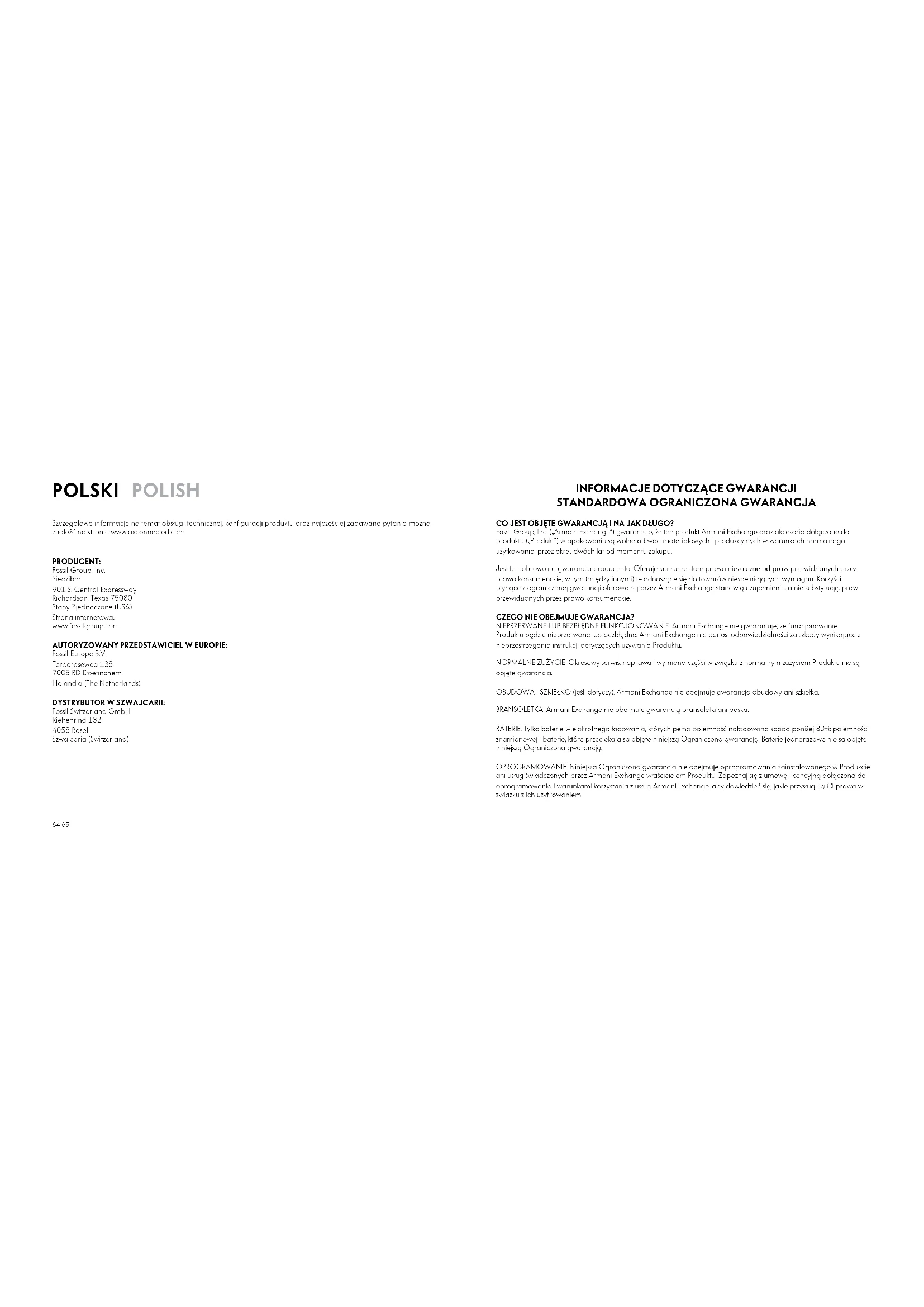 CO JEST OBJĘTE GWARANCJĄ I NA JAK DŁUGO? Fossil Group, Inc. („Armani Exchange”) gwarantuje, że ten produkt Armani Exchange oraz akcesoria dołączone do produktu („Produkt”) w opakowaniu są wolne od wad materiałowych i produkcyjnych w warunkach normalnego użytkowania, przez okres dwóch lat od momentu zakupu. Jest to dobrowolna gwarancja producenta. Oferuje konsumentom prawa niezależne od praw przewidzianych przez prawo konsumenckie, w tym (między innymi) te odnoszące się do towarów niespełniających wymagań. Korzyści płynące z ograniczonej gwarancji oferowanej przez Armani Exchange stanowią uzupełnienie, a nie substytucję, praw przewidzianych przez prawo konsumenckie. CZEGO NIE OBEJMUJE GWARANCJA? NIEPRZERWANE LUB BEZBŁĘDNE FUNKCJONOWANIE. Armani Exchange nie gwarantuje, że funkcjonowanie Produktu będzie nieprzerwane lub bezbłędne. Armani Exchange nie ponosi odpowiedzialności za szkody wynikające z nieprzestrzegania instrukcji dotyczących używania Produktu. NORMALNE ZUŻYCIE. Okresowy serwis, naprawa i wymiana części w związku z normalnym zużyciem Produktu nie są objęte gwarancją. OBUDOWA I SZKIEŁKO (jeśli dotyczy). Armani Exchange nie obejmuje gwarancją obudowy ani szkiełka. BRANSOLETKA. Armani Exchange nie obejmuje gwarancją bransoletki ani paska. BATERIE. Tylko baterie wielokrotnego ładowania, których pełna pojemność naładowana spada poniżej 80% pojemności znamionowej i baterie, które przeciekają są objęte niniejszą Ograniczoną gwarancją. Baterie jednorazowe nie są objęte niniejszą Ograniczoną gwarancją. OPROGRAMOWANIE. Niniejsza Ograniczona gwarancja nie obejmuje oprogramowania zainstalowanego w Produkcie ani usług świadczonych przez Armani Exchange właścicielom Produktu. Zapoznaj się z umową licencyjną dołączoną do oprogramowania i warunkami korzystania z usług Armani Exchange, aby dowiedzieć się, jakie przysługują Ci prawa w związku z ich użytkowaniem.66 67 NADMIERNE I NIEWŁAŚCIWE UŻYCIE. Wady lub uszkodzenia wynikające z: a) niewłaściwego zastosowania, przechowywania, nadmiernego lub niewłaściwego użycia, wypadku lub zaniedbania, takie jak uszkodzenia fizyczne (pęknięcia lub zarysowania, itp.) powierzchni Produktu, wynikające z nieprawidłowego użycia; b) kontaktu z płynami, wodą, deszczem, powietrzem o dużej wilgotności lub nadmiernym potem, piaskiem, brudem, itp., żywnością lub wystawieniem Produktu na oddziaływanie ekstremalnych temperatur; c) użycia produktu do celów komercyjnych, zastosowań nietypowych i w nietypowych warunkach; lub d) innych powodów, niezależnych od Armani Exchange, nie są objęte gwarancją. UŻYWANIE PRODUKTÓW NIENALEŻĄCYCH DO ARMANI EXCHANGE. Wady i uszkodzenia spowodowane zastosowaniem produktów, akcesoriów, oprogramowania lub innych urządzeń peryferyjnych nienależących do Armani Exchange lub nieposiadających certyfikatu nie są objęte gwarancją. ZMIENIONE PRODUKTY. Produkty z: a) usuniętymi, zmienionymi lub nieczytelnymi numerami seryjnymi, kodami z datami produkcji lub innymi znakami rejestracyjnymi; b) naruszonymi zamknięciami lub te, które pokazują dowody uszkodzenia lub dostępu przez nieautoryzowanych sprzedawców lub centra serwisowe; nie są objęte gwarancją. PRODUKTY OD NIEAUTORYZOWANYCH SPRZEDAWCÓW. Produkty, które nie zostały zakupione u autoryzowanego sprzedawcy Armani Exchange nie są objęte gwarancją. USŁUGI KOMUNIKACYJNE. Wady, uszkodzenia lub awaria Produktów, spowodowane jakąkolwiek usługą lub sygnałem komunikacyjnym, które zaprenumerowałeś lub których używasz z Produktami nie są objęte gwarancją. JAKIE SĄ OBOWIĄZKI ARMANI EXCHANGE? W trakcie obowiązywania gwarancji, pod warunkiem, że Produkt jest serwisowany zgodnie z warunkami niniejszej Ograniczonej gwarancji, Armani Exchange dokona naprawy, wymiany lub zwrotu ceny zakupionego Produktu, według własnego uznania i za darmo. Armani Exchange może, według własnego uznania, użyć naprawionych, odnowionych lub nowych części lub elementów do naprawy jakiegokolwiek Produktu lub może zastąpić Produkt naprawionym, odnowionym lub nowym Produktem. Wszystkie wymienione Produkty będą objęte gwarancją przez okres trwania oryginalnej Ograniczonej gwarancji na oryginalny Produkt lub przez dziewięćdziesiąt (90) dni, w zależności od tego, który okres jest dłuższy. Wszystkie wymienione Produkty, części, elementy, tarcze i sprzęt stają się własnością Armani Exchange. Z wyjątkiem sytuacji wyraźnie dozwolonych przez obowiązujące prawo, przeniesienie lub cesja niniejszej Ograniczonej gwarancji jest zabronione. CO TRZEBA ZROBIĆ, ABY UZYSKAĆ SERWIS GWARANCYJNY? Aby uzyskać serwis gwarancyjny w ramach niniejszej Ograniczonej gwarancji należy zwrócić Produkt do autoryzowanego serwisu w opakowaniu nadającym się do wysyłki, wraz z paragonem lub porównywalnym dowodem zakupu, przedstawiającym oryginalną datę zakupu, numer seryjny Produktu oraz nazwę i adres sprzedawcy. Jeśli Armani Exchange zdecyduje, że dany Produkt nie jest objęty niniejszą Ograniczoną gwarancją, musisz zapłacić za wszystkie wymienione części, przesyłkę i koszty robocizny naprawionego Produktu lub za zwrot owego Produktu. Aby znaleźć najbliższe, autoryzowane i międzynarodowe centrum serwisowe, prosimy odwiedzić stronę www. axconnected.com Brak danych, oprogramowanie lub aplikacje dodane do Produktu zostaną zainstalowane ponownie. Powinieneś zachować oddzielną kopię zapasową treści zawartych w Produkcie zanim oddasz Produkt do serwisu gwarancyjnego Armani Exchange, ponieważ niektóre lub wszystkie treści mogą zostać usunięte lub sformatowane podczas napraw gwarancyjnych. JAKIE SĄ OGRANICZENIA ODPOWIEDZIALNOŚCI ARMANI EXCHANGE? POWYŻSZE GWARANCJE I ŚRODKI MAJĄ CHARAKTER WYŁĄCZNY I ZASTĘPUJĄ WSZELKIE INNE GWARANCJE ORAZ ZASADY I WARUNKI, WYRAŹNE, DOROZUMIANE LUB USTAWOWE, W TYM MIĘDZY INNYMI GWARANCJE WARTOŚ