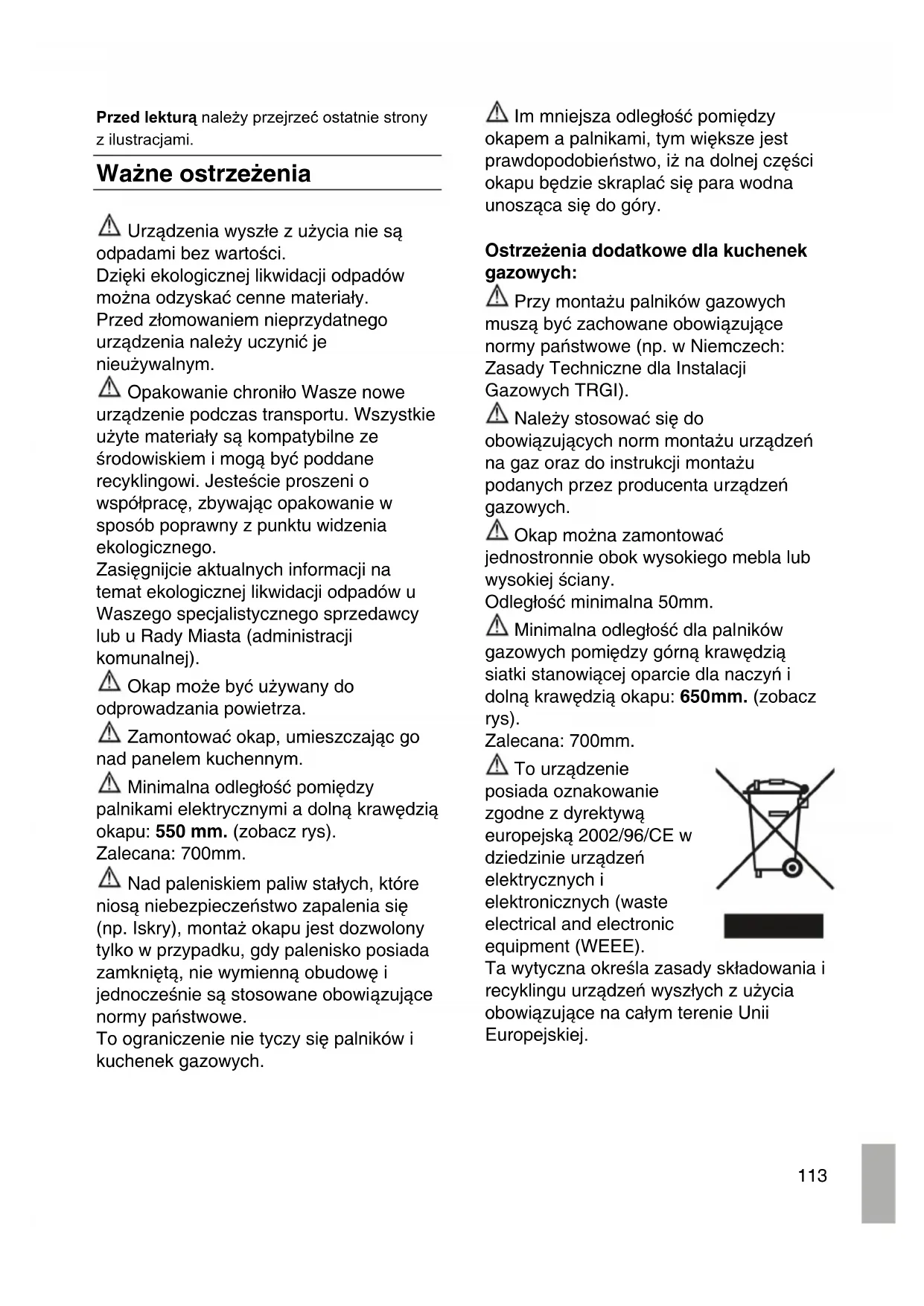 Przed lekturą należy przejrzeć ostatnie strony z ilustracjami. Ważne ostrzeżenia Urządzenia wyszłe z użycia nie są odpadami bez wartości. Dzięki ekologicznej likwidacji odpadów można odzyskać cenne materiały. Przed złomowaniem nieprzydatnego urządzenia należy uczynić je nieużywalnym. Opakowanie chroniło Wasze nowe urządzenie podczas transportu. Wszystkie użyte materiały są kompatybilne ze środowiskiem i mogą być poddane recyklingowi. Jesteście proszeni o współpracę, zbywając opakowanie w sposób poprawny z punktu widzenia ekologicznego. Zasięgnijcie aktualnych informacji na temat ekologicznej likwidacji odpadów u Waszego specjalistycznego sprzedawcy lub u Rady Miasta (administracji komunalnej). Okap może być używany do odprowadzania powietrza. Zamontować okap, umieszczając go nad panelem kuchennym. Minimalna odległość pomiędzy palnikami elektrycznymi a dolną krawędzią okapu: 550 mm. (zobacz rys). Zalecana: 700mm. Nad paleniskiem paliw stałych, które niosą niebezpieczeństwo zapalenia się (np. Iskry), montaż okapu jest dozwolony tylko w przypadku, gdy palenisko posiada zamkniętą, nie wymienną obudowę i jednocześnie są stosowane obowiązujące normy państwowe. To ograniczenie nie tyczy się palników i kuchenek gazowych. Im mniejsza odległość pomiędzy okapem a palnikami, tym większe jest prawdopodobieństwo, iż na dolnej części okapu będzie skraplać się para wodna unosząca się do góry. Ostrzeżenia dodatkowe dla kuchenek gazowych: Przy montażu palników gazowych muszą być zachowane obowiązujące normy państwowe (np. w Niemczech: Zasady Techniczne dla Instalacji Gazowych TRGI). Należy stosować się do obowiązujących norm montażu urządzeń na gaz oraz do instrukcji montażu podanych przez producenta urządzeń gazowych. Okap można zamontować jednostronnie obok wysokiego mebla lub wysokiej ściany. Odległość minimalna 50mm. Minimalna odległość dla palników gazowych pomiędzy górną krawędzią siatki stanowiącej oparcie dla naczyń i dolną krawędzią okapu: 650mm. (zobacz rys). Zalecana: 700mm. To urządzenie posiada oznakowanie zgodne z dyrektywą europejską 2002/96/CE w dziedzinie urządzeń elektrycznych i elektronicznych (waste electrical and electronic equipment (WEEE). Ta wytyczna określa zasady składowania i recyklingu urządzeń wyszłych z użycia obowiązujące na całym terenie Unii Europejskiej.114