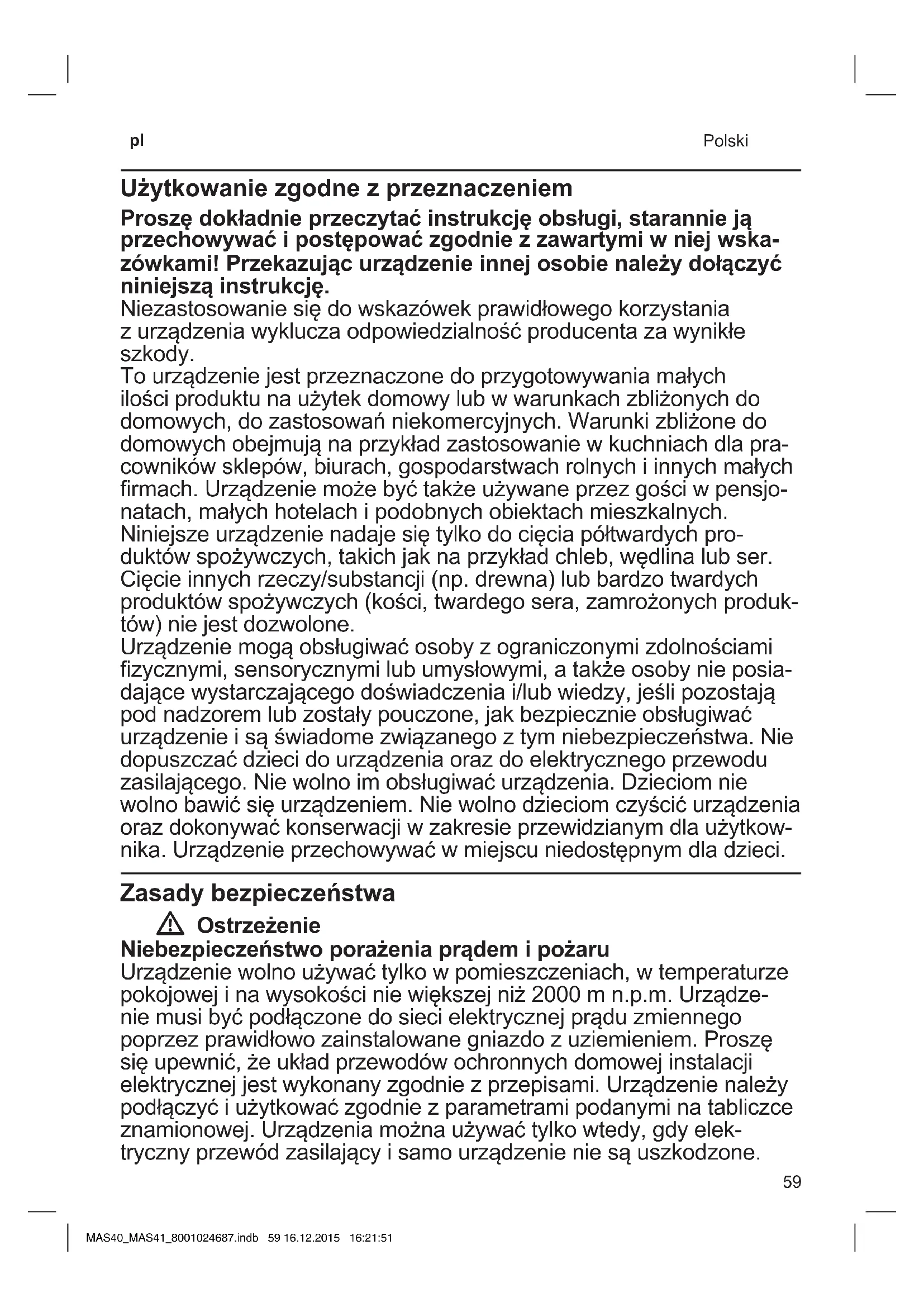 - Polski Użytkowanie zgodne z przeznaczeniem Proszę dokładnie przeczytać instrukcję obsługi, starannie ją przechowywać i postępować zgodnie z zawartymi w niej wska- zówkami! Przekazując urządzenie innej osobie należy dołączyć niniejszą instrukcję. Niezastosowaniesiędowskazówekprawidłowegokorzystania zurządzeniawykluczaodpowiedzialnośćproducentazawynikłe szkody. Tourządzeniejestprzeznaczonedoprzygotowywaniamałych ilościproduktunaużytekdomowylubwwarunkachzbliżonychdo domowych,dozastosowańniekomercyjnych.Warunkizbliżonedo domowychobejmująnaprzykładzastosowaniewkuchniachdlapra- cownikówsklepów,biurach,gospodarstwachrolnychiinnychmałych rmach.Urządzeniemożebyćtakżeużywaneprzezgościwpensjo- natach,małychhotelachipodobnychobiektachmieszkalnych. Niniejszeurządzenienadajesiętylkodocięciapółtwardychpro- duktówspożywczych,takichjaknaprzykładchleb,wędlinalubser. Cięcieinnychrzeczy/substancji(np.drewna)lubbardzotwardych produktówspożywczych(kości,twardegosera,zamrożonychproduk- tów)niejestdozwolone. Urządzeniemogąobsługiwaćosobyzograniczonymizdolnościami zycznymi,sensorycznymilubumysłowymi,atakżeosobynieposia- dającewystarczającegodoświadczeniai/lubwiedzy,jeślipozostają podnadzoremlubzostałypouczone,jakbezpiecznieobsługiwać urządzenieisąświadomezwiązanegoztymniebezpieczeństwa.Nie dopuszczaćdziecidourządzeniaorazdoelektrycznegoprzewodu zasilającego.Niewolnoimobsługiwaćurządzenia.Dzieciomnie wolnobawićsięurządzeniem.Niewolnodzieciomczyścićurządzenia orazdokonywaćkonserwacjiwzakresieprzewidzianymdlaużytkow- nika.Urządzenieprzechowywaćwmiejscuniedostępnymdladzieci. Zasady bezpieczeństwa W Ostrzeżenie Niebezpieczeństwo porażenia prądem i pożaru Urządzeniewolnoużywaćtylkowpomieszczeniach,wtemperaturze pokojowejinawysokościniewiększejniż2000mn.p.m.Urządze- niemusibyćpodłączonedosiecielektrycznejprąduzmiennego poprzezprawidłowozainstalowanegniazdozuziemieniem.Proszę sięupewnić,żeukładprzewodówochronnychdomowejinstalacji elektrycznejjestwykonanyzgodniezprzepisami.Urządzenienależy podłączyćiużytkowaćzgodniezparametramipodanyminatabliczce znamionowej.Urządzeniamożnaużywaćtylkowtedy,gdyelek- trycznyprzewódzasilającyisamourządzenieniesąuszkodzone. MAS40_MAS41_8001024687.indb 59 16.12.2015 16:21:5160 pl Polski Abyuniknąćzagrożeń,zlecićnaprawyurządzenia,jaknp.wymianę uszkodzonegoprzewoduzasilającego,tylkonaszemuautoryzowa- nemuserwisowi.Zawszenadzorowaćpracęurządzenia! Niedoprowadzićdostykaniasięprzewoduelektrycznegozgorącymi elementamilubnieprzeciągaćgonadostrymikrawędziami.Nie wolnozanurzaćurządzeniawwodzielubumieszczaćwzmywarce donaczyń.Urządzenianiewolnoużywaćobokzlewozmywaka napełnionegowodą!Urządzenianiewolnochwytaćmokrymirękoma aniwłączaćnabiegujałowym.Urządzeniemusibyćzawszeodłą- czaneodsiecipokażdymużyciu,wprzypadkubrakunadzoru,przed złożeniem,demontażemlubczyszczeniemorazwprzypadkuwystą- pieniaawarii.Przedwymianąelementówwyposażenialubczęści dodatkowych,któreznajdująsięwruchupodczaspracyurządzenia, należykonieczniewyłączyćurządzenieiwyjąćwtyczkęzgniazdka sieciowego. W Ostrzeżenie Niebezpieczeństwo zranienia Nóżjestbardzoostry.Niezbliżaćrąkdotarczy.Powyłączeniuurzą- dzenianapędpracujejeszczeprzezkrótkiczas.Odczekaćdozatrzy- maniasięnoża!Pozakończeniupracynastawićszerokośćkrojenia na0.Tourządzeniemusibyćużywanewrazzprowadnicąidociska- czemwewłaściwympołożeniuroboczym,zawyjątkiemprzypadku, gdywielkośćikształtkrojonegoproduktuuniemożliwiająichużycie. Przedprzystąpieniemdoczyszczeniaurządzeniawyjąćwtyczkę zgniazdkasieciowegoizdjąćtarczętnącą.Tarczytnącejniechwytać zaostrze,lecztylkozauchwyt.Wprzypadkuprzerwywdopływie prądu,urządzeniepozostajewłączoneipoprzerwiewznawiapracę. W Uwaga Silnikmożesięprzegrzać!Pomaksymalnie5minutachnieprzerwanej pracywyłączyćurządzenieipozostawićdoochłodzenia. W Ostrzeżenie Niebezpieczeństwo uduszenia Dzieciomniewolnobawićsięopakowaniemurządzenia. Serdecznie gratulujemy Państwu zakupu nowego urządzenia marki Bosch. Dalsze informacje dotyczące naszych produk- tów znajdą Państwo na naszej stronie internetowej. Spis treści Użytkowaniezgodnezprzeznaczeniem p. 59
