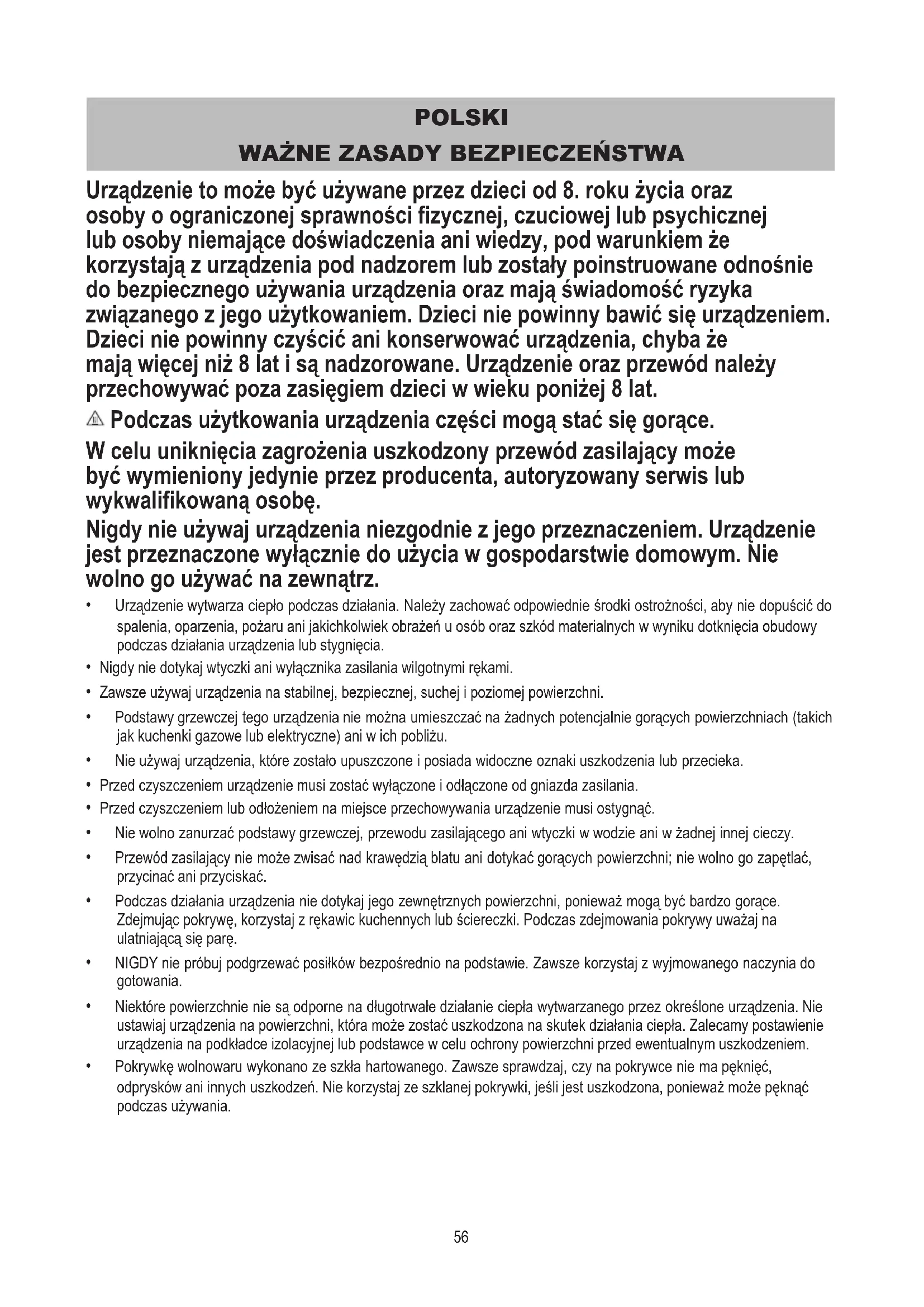 Urządzenie to może być używane przez dzieci od 8. roku życia oraz osoby o ograniczonej sprawności fizycznej, czuciowej lub psychicznej lub osoby niemające doświadczenia ani wiedzy, pod warunkiem że korzystają z urządzenia pod nadzorem lub zostały poinstruowane odnośnie do bezpiecznego używania urządzenia oraz mają świadomość ryzyka związanego z jego użytkowaniem. Dzieci nie powinny bawić się urządzeniem. Dzieci nie powinny czyścić ani konserwować urządzenia, chyba że mają więcej niż 8 lat i są nadzorowane. Urządzenie oraz przewód należy przechowywać poza zasięgiem dzieci w wieku poniżej 8 lat. Podczas użytkowania urządzenia części mogą stać się gorące. W celu uniknięcia zagrożenia uszkodzony przewód zasilający może być wymieniony jedynie przez producenta, autoryzowany serwis lub wykwalifikowaną osobę. Nigdy nie używaj urządzenia niezgodnie z jego przeznaczeniem. Urządzenie jest przeznaczone wyłącznie do użycia w gospodarstwie domowym. Nie wolno go używać na zewnątrz.