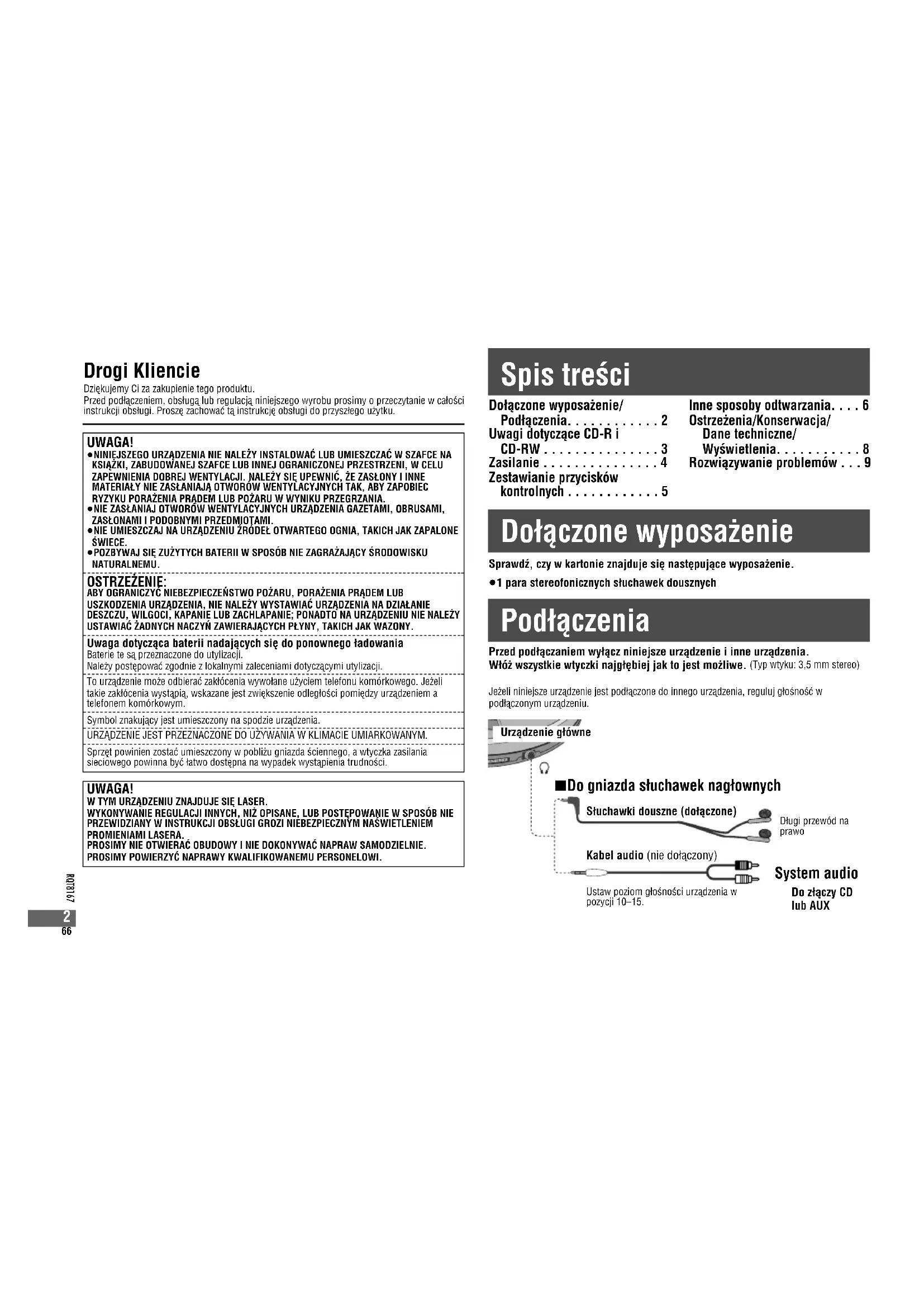 - UWAGA! ≥NINIEJSZEGO URZÀDZENIA NIE NALEËY INSTALOWAÃ LUB UMIESZCZAÃ W SZAFCE NAKSIÀËKI, ZABUDOWANEJ SZAFCE LUB INNEJ OGRANICZONEJ PRZESTRZENI, W CELUZAPEWNIENIA DOBREJ WENTYLACJI. NALEËY SIÈ UPEWNIÃ, ËE ZASÌONY I INNEMATERIAÌY NIE ZASÌANIAJÀ OTWORÓW WENTYLACYJNYCH TAK, ABY ZAPOBIECRYZYKU PORAËENIA PRÀDEM LUB POËARU W WYNIKU PRZEGRZANIA.≥NIE ZASÌANIAJ OTWORÓW WENTYLACYJNYCH URZÀDZENIA GAZETAMI, OBRUSAMI,ZASÌONAMI I PODOBNYMI PRZEDMIOTAMI.≥NIE UMIESZCZAJ NA URZÀDZENIU ŒRÓDEÌ OTWARTEGO OGNIA, TAKICH JAK ZAPALONEØWIECE.≥POZBYWAJ SIÈ ZUËYTYCH BATERII W SPOSÓB NIE ZAGRAËAJÀCY ØRODOWISKUNATURALNEMU. OSTRZEËENIE: ABY OGRANICZYÃ NIEBEZPIECZEÆSTWO POËARU, PORAËENIA PRÀDEM LUBUSZKODZENIA URZÀDZENIA, NIE NALEËY WYSTAWIAÃ URZÀDZENIA NA DZIAÌANIEDESZCZU, WILGOCI, KAPANIE LUB ZACHLAPANIE; PONADTO NA URZÀDZENIU NIE NALEËYUSTAWIAÃ ËADNYCH NACZYÆ ZAWIERAJÀCYCH PÌYNY, TAKICH JAK WAZONY. Uwaga dotyczàca baterii nadajàcych siè do ponownego ìadowania Baterie te sà przeznaczone do utylizacji.Naleëy postèpowaã zgodnie z lokalnymi zaleceniami dotyczàcymi utylizacji.To urzàdzenie moëe odbieraã zakìócenia wywoìane uëyciem telefonu komórkowego. Jeëelitakie zakìócenia wystàpià, wskazane jest zwièkszenie odlegìoøci pomièdzy urzàdzeniem atelefonem komórkowym.Symbol znakujàcy jest umieszczony na spodzie urzàdzenia.URZÀDZENIE JEST PRZEZNACZONE DO UËYWANIA W KLIMACIE UMIARKOWANYM.Sprzèt powinien zostaã umieszczony w pobliëu gniazda øciennego, a wtyczka zasilaniasieciowego powinna byã ìatwo dostèpna na wypadek wystàpienia trudnoøci. Drogi Kliencie Dzièkujemy Ci za zakupienie tego produktu.Przed podìàczeniem, obsìugà lub regulacjà niniejszego wyrobu prosimy o przeczytanie w caìoøciinstrukcji obsìugi. Proszè zachowaã tà instrukcjè obsìugi do przyszìego uëytku. UWAGA! W TYM URZÀDZENIU ZNAJDUJE SIÈ LASER.WYKONYWANIE REGULACJI INNYCH, NIË OPISANE, LUB POSTÈPOWANIE W SPOSÓB NIEPRZEWIDZIANY W INSTRUKCJI OBSÌUGI GROZI NIEBEZPIECZNYM NAØWIETLENIEMPROMIENIAMI LASERA.PROSIMY NIE OTWIERAÃ OBUDOWY I NIE DOKONYWAÃ NAPRAW SAMODZIELNIE.PROSIMY POWIERZYÃ NAPRAWY KWALIFIKOWANEMU PERSONELOWI. Sìuchawki douszne (doìàczone) Dìugi przewód naprawo Do zìàczy CD lub AUX System audio Kabel audio (nie doìàczony) Urzàdzenie gìówne Przed podìàczaniem wyìàcz niniejsze urzàdzenie i inne urzàdzenia. Wìóë wszystkie wtyczki najgìèbiej jak to jest moëliwe. (Typ wtyku: 3,5 mm stereo)Jeëeli niniejsze urzàdzenie jest podìàczone do innego urzàdzenia, reguluj gìoønoøã wpodìàczonym urzàdzeniu. ∫Do gniazda sìuchawek nagìownych Ustaw poziom gìoønoøci urzàdzenia wpozycji 10–15. Spis treøci Doìàczone wyposaëenie/ Podìàczenia p. 2