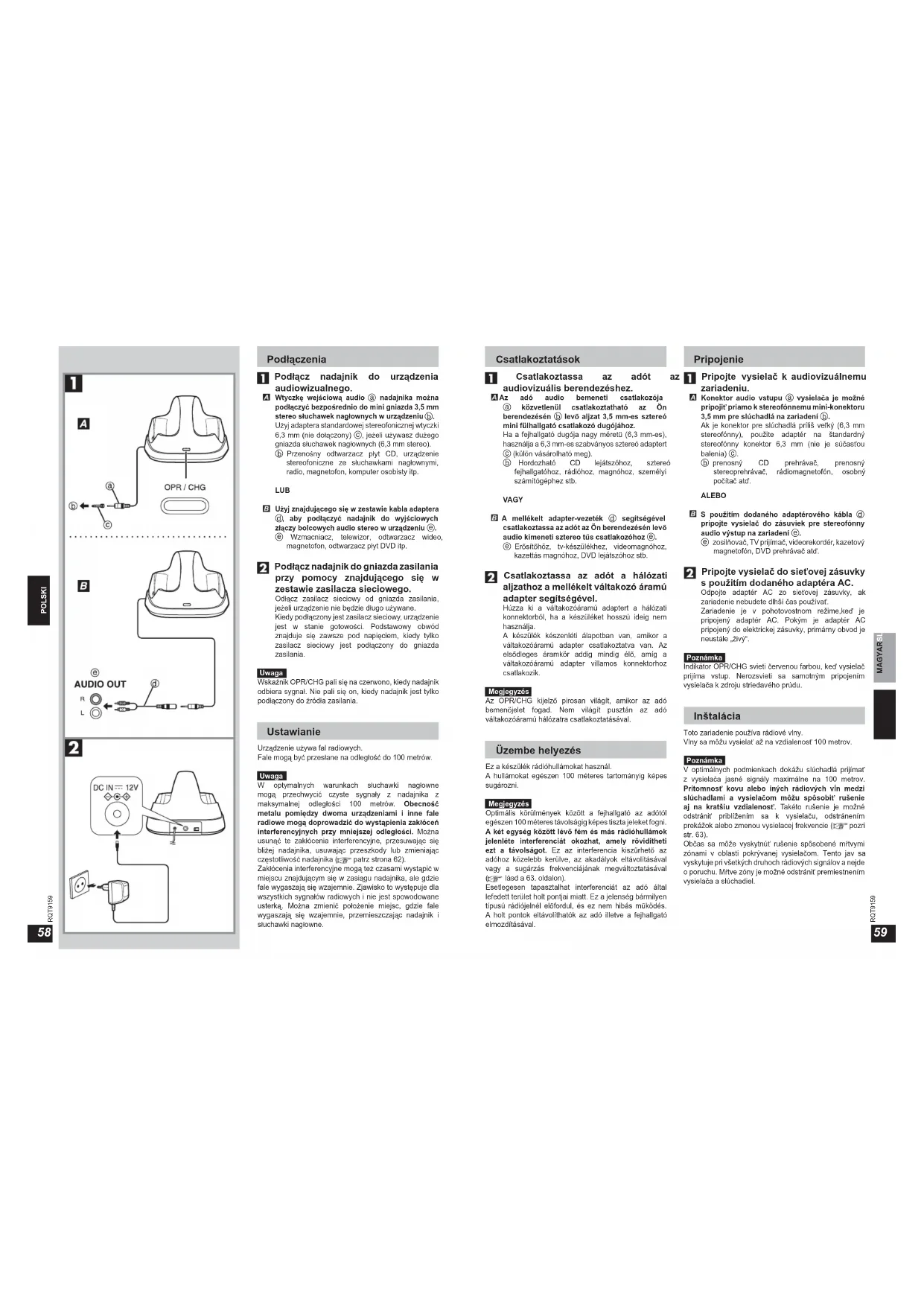 - Dane techniczne Wyposażenie Prosimy o sprawdzenie i zidentyfi kowanie dołączonego wyposażenia. Zasilacz sieciowy (prąd stały 12 V, 150 mA) (Dla Zjednoczonego Krolestwa: RFX1695) (Dla Europy kontynentalnej: RFX1694) 2 akumulatory niklowo-metalowodorkowe (HHR- 4AGE/2B) Kabel adaptera (mini gniazdo 3,5 mm stereo – wtyczka bolcowa x 2) (RFX3655) Wyrób może wymagać ręcznego zresetowania po silnym wyładowaniu elektrostatycznym. Tylko do użytku wewnątrz pomieszczeń. OSTRZEŻENIE Jeżeli bateria nie zostanie prawidłowo wymieniona, występuje niebezpieczeństwo wybuchu. Wymieniaj wyłącznie na taki sam rodzaj lub równoważny, zalecany przez producenta. Pozbywaj się zużytych baterii w sposób podany przez producenta. Tisztelt vásárló! Köszönjük, hogy megvásárolta ezt a terméket. Az optimális működtetés és a biztonság érdekében kérjük, olvassa el fi gyelmesen ezeket az utasításokat. Tulajdonságok — A fejhallgató az adótól egészen 100 méterig használható. Az adó elhelyezése és az akkumulátorok állapota befolyásolja ezt a távolságot. p. 67