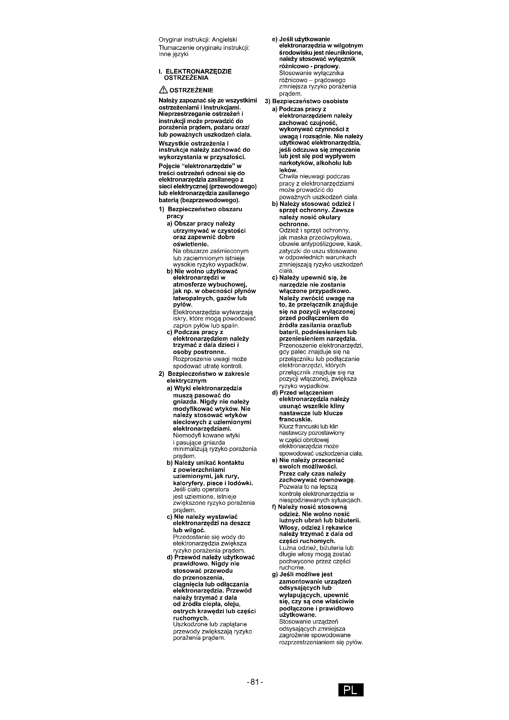 OSTRZEŻENIA OSTRZEŻENIE Należy zapoznać się ze wszystkimi ostrzeżeniami i instrukcjami. Nieprzestrzeganie ostrzeżeń i instrukcji może prowadzić do porażenia prądem, pożaru oraz/ lub poważnych uszkodzeń ciała. Wszystkie ostrzeżenia i instrukcje należy zachować do wykorzystania w przyszłości. Pojęcie “elektronarzędzie” w treści ostrzeżeń odnosi się do elektronarzędzia zasilanego z sieci elektrycznej (przewodowego) lub elektronarzędzia zasilanego baterią (bezprzewodowego).