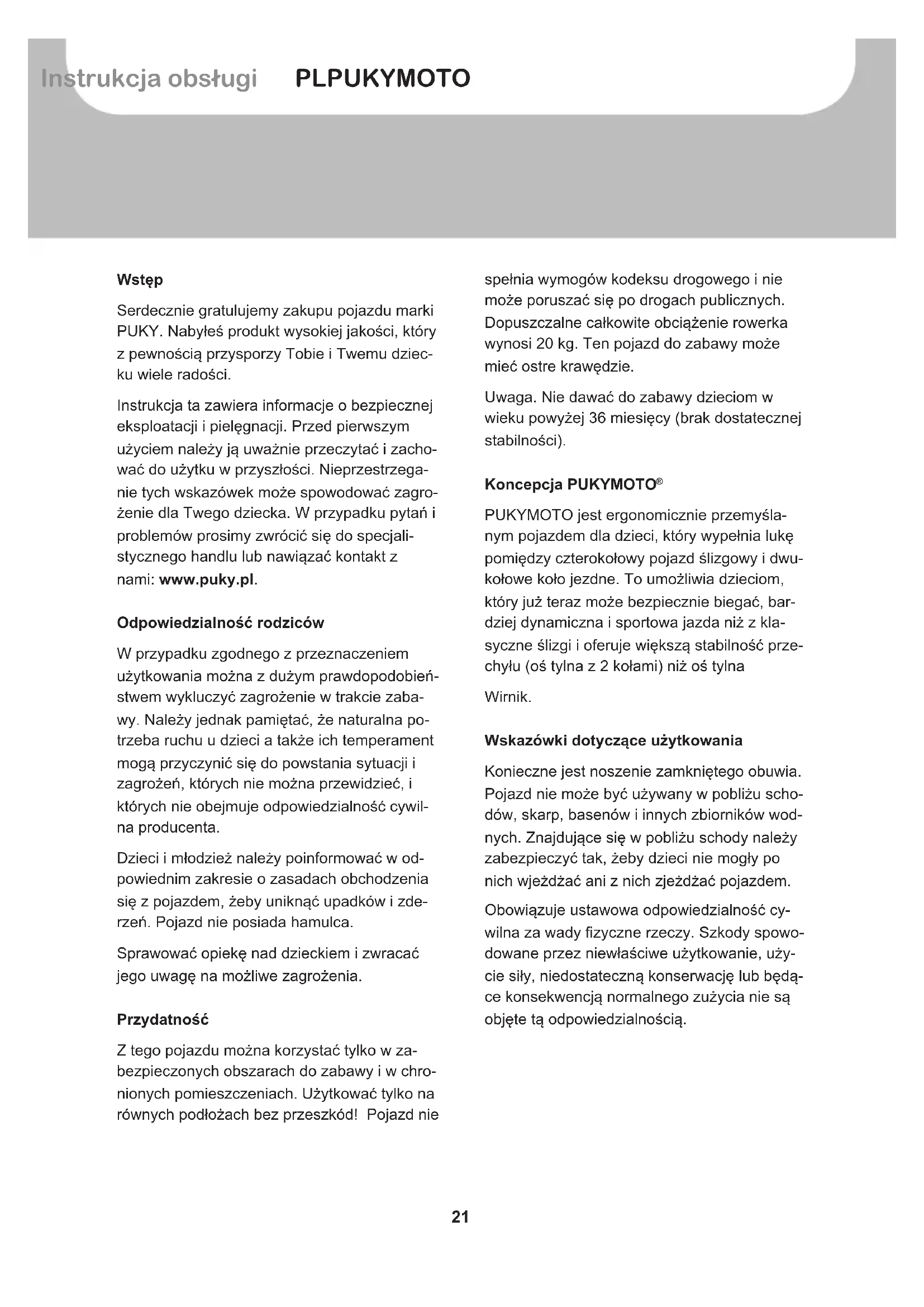 Serdecznie gratulujemy zakupu pojazdu marki PUKY. Nabytes produkt wysokiej jakosci, który z pewnoscią przysporzy Tobie i Twemu;dziecku wie radosci.