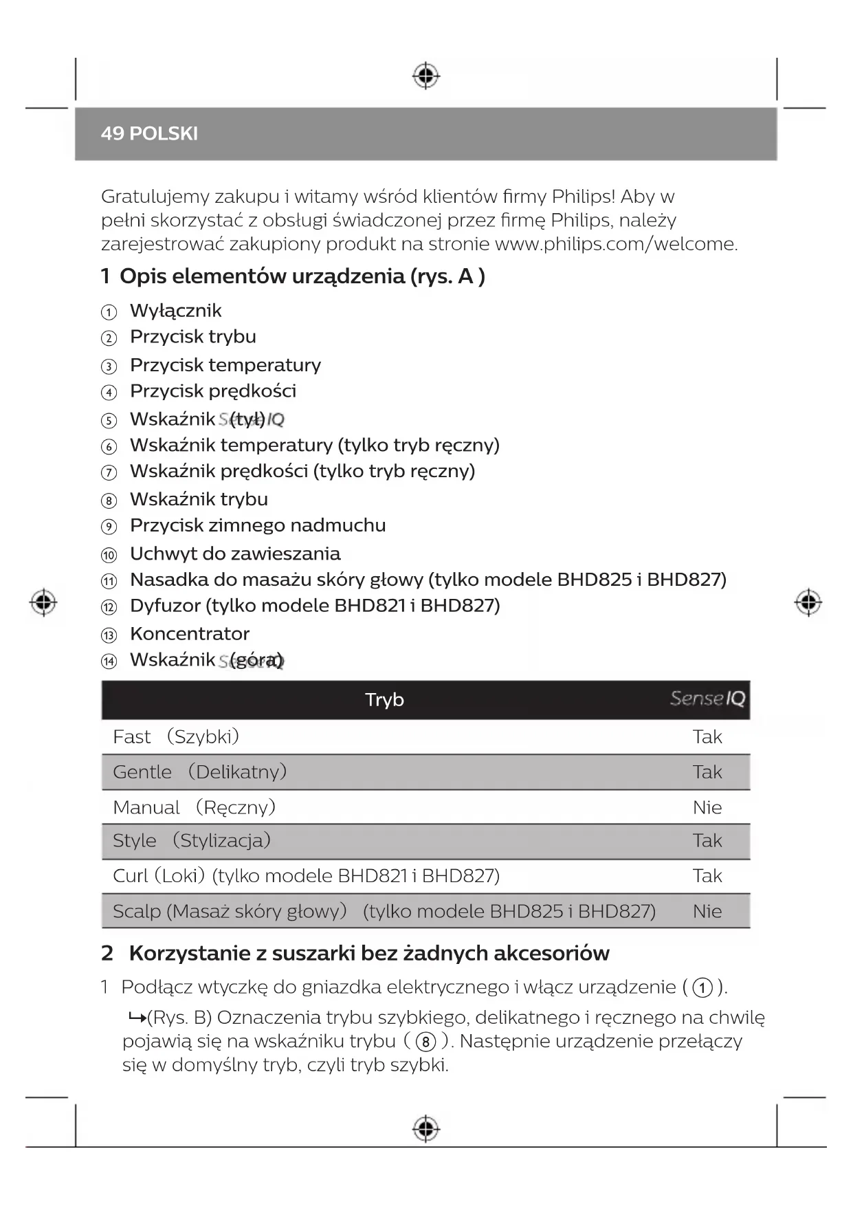 - Zimny nadmuch ( ) działa we wszystkich trybach. Jeśli chcesz zmienić moc w trybie zimnego nadmuchu, zalecamy wybranie trybu ręcznego i zmianę ustawienia temperatury na 1. 3 Układanie fryzury (rys. C) 1 Nałóż koncentrator ( m ), a tryb stylizacji zostanie włączony automatycznie. »Jeśli zamocujesz koncentrator, a następnie włączysz suszarkę, na wskaźniku trybu na chwilę pojawią się oznaczenia trybu szybkiego, delikatnego, ręcznego i stylizacji. Następnie suszarka przełączy się w tryb stylizacji. 50POLSKIUwaga: Tryb szybki, delikatny, ręczny i stylizacji można zmieniać według potrzeby. 2 Wybierz jedno pasmo włosów (o szerokości nie większej niż 5 cm) i umieść szczotkę u ich nasady. Trzymając koncentrator skierowany w dół na włosy, przesuwaj szczotkę i suszarkę do włosów jednym ruchem aż do końca włosów. Powtórz tę czynność na kolejnych pasmach włosów. 3 Aby utrwalić fryzurę, naciśnij przycisk zimnego nadmuchu JEDEN RAZ ( i ), aby z suszarki wydobywał się chłodny strumień powietrza. 4 Aby stworzyć delikatnie wywinięte pasma, zbliżając się do końcówek włosów, lekko obróć szczotkę do wewnątrz. Naciśnij przycisk zimnego nadmuchu JEDEN RAZ i przytrzymaj go w tej pozycji przez 3–4 sekundy przy ustawieniu zimnego nadmuchu. 5 Aby zdjąć koncentrator, po prostu go odłącz, a tryb przełączy się na poprzednio ustawiony. 4 Korzystanie z dyfuzora (tylko modele BHD821 i BHD827, rys. D) Dyfuzor jest pomocny przy suszeniu kręconych włosów. Jeśli masz naturalnie kręcone włosy lub trwałą ondulację, możesz użyć dyfuzora, aby nadać bardziej atrakcyjny wygląd lokom. W górnej części dyfuzora znajduje się otwór, który umożliwia technologii wykrywanie temperatury włosów podczas ich suszenia lub układania. Uwaga: Możesz dowolnie przełączać między trybem loków a trybem ręcznym. 1 Załóż dyfuzor ( l ) na suszarkę, a włączy się tryb loków. 2 Trzymaj suszarkę pionowo i umieść włosy między wypustkami, wykonując okrężne ruchy, następnie przesuwaj ją powoli w kierunku skóry głowy. 3 Przyłóż dyfuzor do skóry głowy i wykonuj obrotowe ruchy. Pomaga to wysuszyć skórę głowy i dodać objętości u nasady włosów. 4 Aby utrwalić fryzurę, naciśnij przycisk zimnego nadmuchu JEDEN RAZ ( i ), aby z suszarki wydobywał się chłodny strumień powietrza. 5 Aby zdjąć dyfuzor, po prostu go odłącz, a tryb przełączy się na poprzednio ustawiony. 51 POLSKI5 Masowanie skóry głowy (tylko modele BHD825 i BHD827, rys. E) Nasadka do masażu skóry głowy z miękkimi wypustkami stymuluje skórę głowy dzięki wibracjom i wytwarzaniu łagodnego ciepła. 1 Zamocuj nasadkę do masowania skóry głowy ( k ) na suszarce, aby włączyć tryb masażu skóry głowy. 2 Delikatnie umieść wypustki masujące na skórze głowy, aby zapewnić sobie relaks. Uwaga: Wypustki masujące powinny dotykać skóry głowy. Nie należy przyciskać ich mocno do głowy, ponieważ zmniejszy to skuteczność nasadki masującej. 3 Przesuwaj dyfuzor okrężnymi ruchami po różnych obszarach głowy, w tym samym czasie susząc włosy i masując skórę. Uwaga: Z nasadką do masażu skóry głowy można używać wyłącznie trybu masażu skóry głowy. Gdy ta nasadka jest nałożona na suszarkę, nie można zmienić trybu na inny. 6 Po użyciu Uwaga: Nie zanurzaj żadnych nasadek w wodzie podczas czyszczenia. 1 Wyłącz urządzenie i wyjmij jego wtyczkę z gniazdka elektrycznego. 2 Umieść je na powierzchni odpornej na wysokie temperatury, aby ostygło. 3 Usuń kurz z kratek za pomocą odkurzacza. 4 Wyczyść suszarkę wilgotną szmatką. 5 Przechowuj urządzenie w bezpiecznym i suchym miejscu, z dala od kurzu. Możesz też powiesić urządzenie za uchwyt do zawieszania ( j ). 7 Gwarancja i serwis W razie jakichkolwiek pytań lub problemów prosimy odwiedzić naszą stronę internetową www.philips.com/support lub skontaktować się z lokalnym Centrum Obsługi Klienta rmy Philips (numer telefonu znajduje się w ulotce gwarancyjnej). Jeśli w Twoim kraju nie ma Centrum Obsługi Klienta, zwróć się o pomoc do sprzedawcy produktów rmy Philips. 52POLSKIFelicitări pentru achiziţie şi bun venit la Philips! Pentru a benecia pe deplin de asistenţa oferită de Philips, înregistrează-ţi produsul la www.philips.com/welcome. 1 Prezentare generală (fig. A) a Comutatorul pornit/oprit b Butonul pentru mod c Butonul pentru temperatură d Butonul pentru viteză e Indicatorul (spate) f Indicatorul de temperatură (numai modul Manual) g Indicatorul de viteză (numai modul Manual) h Indicatorul de mod i Butonul pentru jet de aer rece j Agăţătoare k Accesoriu de masaj pentru scalp (numai BHD825 şi BHD827) l Difuzor pentru bucle (numai BHD821 şi BHD827) m Cap de coafare n Indicatorul (sus) Mod Fast (Rapid) Da Gentle (Delicat) Da Manual Nu Style (Coafare) Da Curl (Bucle) (numai BHD821 şi BHD827) Da Scalp (numai BHD825 şi BHD827) Nu 53 ROMÂNĂ2 Utilizarea uscătorului de păr fără accesorii 1 Conectează ştecherul la o priză de alimentare şi porneşte aparatul (a). »( Fig. B ) Modurile Rapid, Delicat şi Manual vor semnalate pentru scurt timp de indicatorul de mod (h). Apoi, aparatul va intra în modul implicit, respectiv modul Rapid. 2 Apasă butonul de mod ( b ) pentru a schimba între modurile Rapid, Delicat şi Manual. Mod Funcţie Fast (Rapid) Usucă-ţi părul ud într-un timp scurt cu performanţele sale puternice. Gentle (Delicat) Usucă-ţi părul la o temperatură de îngrijire, cu un ux de aer delicat. Manual Usucă-ţi părul la setarea dorită de temperatură şi viteză . Sfaturi: