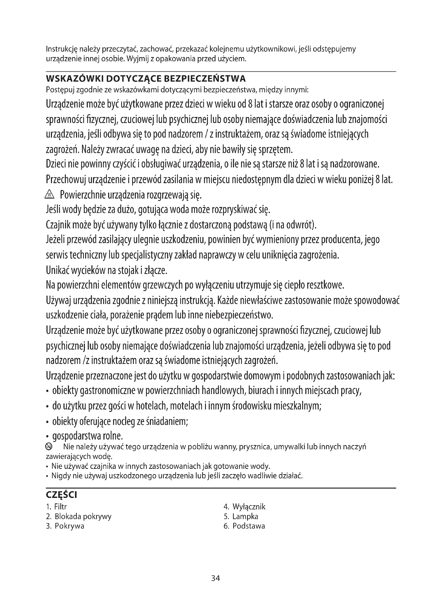 Postępuj zgodnie ze wskazówkami dotyczącymi bezpieczeństwa, między innymi: Urządzenie może być użytkowane przez dzieci w wieku od 8 lat i starsze oraz osoby o ograniczonej sprawności zycznej, czuciowej lub psychicznej lub osoby niemające doświadczenia lub znajomości urządzenia, jeśli odbywa się to pod nadzorem / z instruktażem, oraz są świadome istniejących zagrożeń. Należy zwracać uwagę na dzieci, aby nie bawiły się sprzętem. Dzieci nie powinny czyścić i obsługiwać urządzenia, o ile nie są starsze niż 8 lat i są nadzorowane. Przechowuj urządzenie i przewód zasilania w miejscu niedostępnym dla dzieci w wieku poniżej 8 lat. h Powierzchnie urządzenia rozgrzewają się. Jeśli wody będzie za dużo, gotująca woda może rozpryskiwać się. Czajnik może być używany tylko łącznie z dostarczoną podstawą (i na odwrót). Jeżeli przewód zasilający ulegnie uszkodzeniu, powinien być wymieniony przez producenta, jego serwis techniczny lub specjalistyczny zakład naprawczy w celu uniknięcia zagrożenia. Unikać wycieków na stojak i złącze. Na powierzchni elementów grzewczych po wyłączeniu utrzymuje się ciepło resztkowe. Używaj urządzenia zgodnie z niniejszą instrukcją. Każde niewłaściwe zastosowanie może spowodować uszkodzenie ciała, porażenie prądem lub inne niebezpieczeństwo. Urządzenie może być użytkowane przez osoby o ograniczonej sprawności zycznej, czuciowej lub psychicznej lub osoby niemające doświadczenia lub znajomości urządzenia, jeżeli odbywa się to pod nadzorem /z instruktażem oraz są świadome istniejących zagrożeń. Urządzenie przeznaczone jest do użytku w gospodarstwie domowym i podobnych zastosowaniach jak: