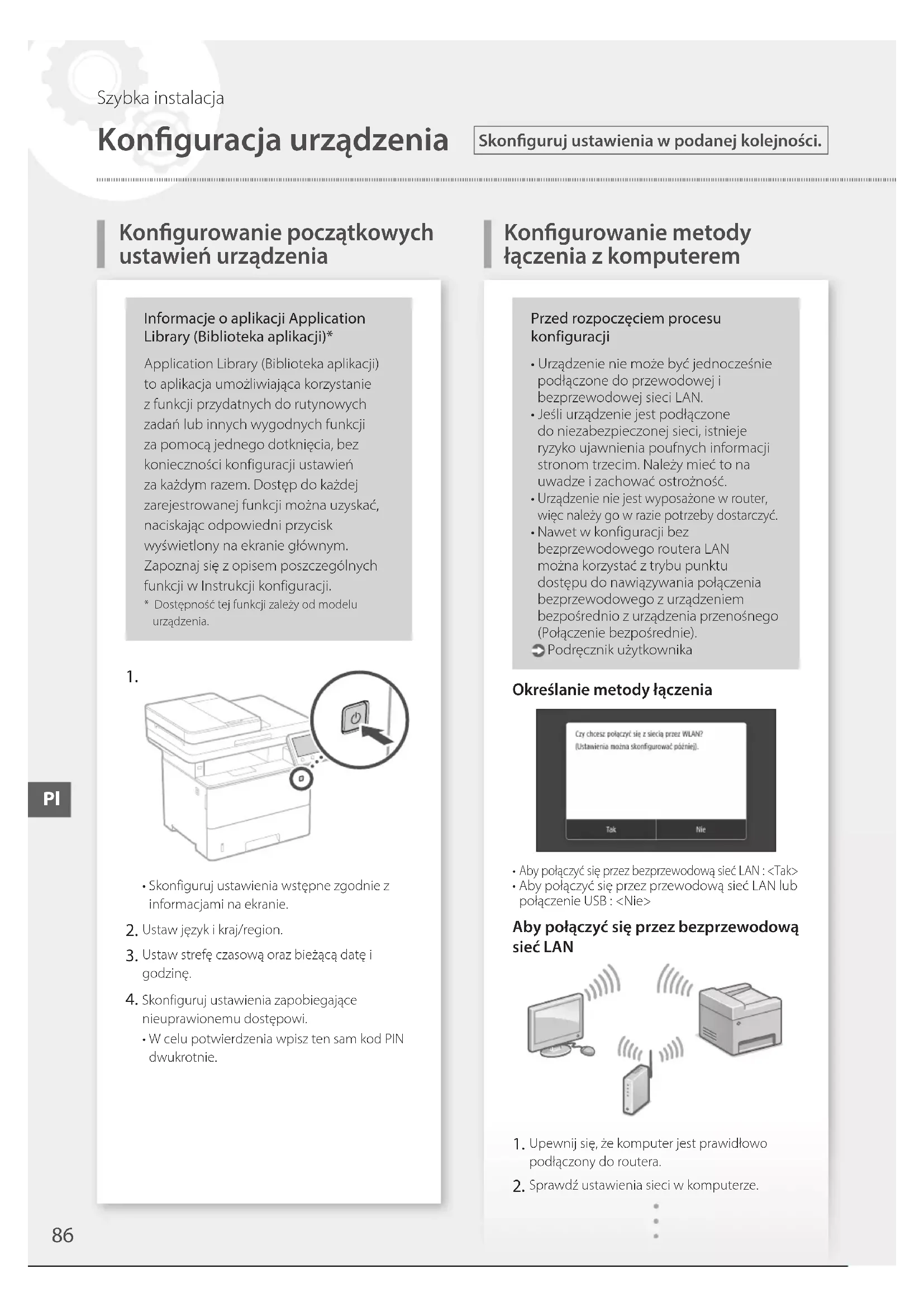 - Skonfiguruj ustawienia wstępne zgodnie z informacjami na ekranie. Ustaw język i kraj/region. Ustaw strefę czasową oraz bieżącą datę i godzinę. Skonfiguruj ustawienia zapobiegające nieuprawionemu dostępowi.• W celu potwierdzenia wpisz ten sam kod PIN dwukrotnie.Przed rozpoczęciem procesu konfiguracji• Urządzenie nie może być jednocześnie podłączone do przewodowej i bezprzewodowej sieci LAN.• Jeśli urządzenie jest podłączone do niezabezpieczonej sieci, istnieje ryzyko ujawnienia poufnych informacji stronom trzecim. Należy mieć to na uwadze i zachować ostrożność. Urządzenie nie jest wyposażone w router, więc należy go w razie potrzeby dostarczyć. Nawet w konfiguracji bez bezprzewodowego routera LAN można korzystać z trybu punktu dostępu do nawiązywania połączenia bezprzewodowego z urządzeniem bezpośrednio z urządzenia przenośnego (Połączenie bezpośrednie). Podręcznik użytkownikaOkreślanie metody łączenia Aby połączyć się przez bezprzewodową sieć LAN : <Tak>• Aby połączyć się przez przewodową sieć LAN lub połączenie USB : <Nie>Aby połączyć się przez bezprzewodową sieć LAN Upewnij się, że komputer jest prawidłowo podłączony do routera. Sprawdź ustawienia sieci w komputerze.