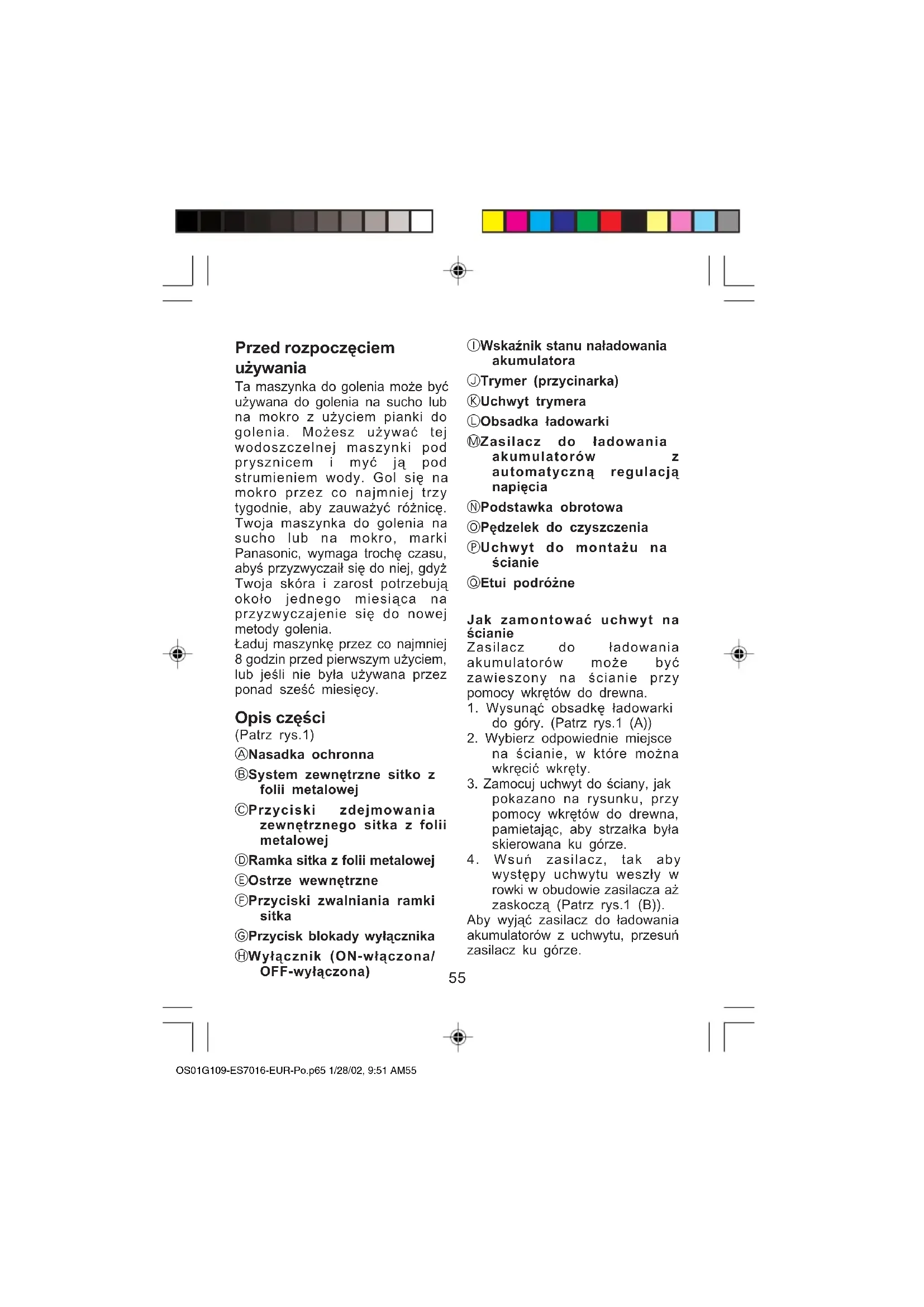 - Käytä parranajokonettasi vain sen varsinaiseen käyttötarkoitukseen tämän käyttöohjeen mukaisesti. Tuote on tarkoitettu vain kotikäyttöön. OS01G108_ES7016_EUR_Fin 1/28/02, 9:25 AM5455 Przed rozpoczęciem używania Ta maszynka do golenia może być używana do golenia na sucho lub na mokro z użyciem pianki do golenia. Możesz używać tej wodoszczelnej maszynki pod prysznicem i myć ją pod strumieniem wody. Gol się na mokro przez co najmniej trzy tygodnie, aby zauważyć różnicę. Twoja maszynka do golenia na sucho lub na mokro, marki Panasonic, wymaga trochę czasu, abyś przyzwyczaił się do niej, gdyż Twoja skóra i zarost potrzebują około jednego miesiąca na przyzwyczajenie się do nowej metody golenia. Ładuj maszynkę przez co najmniej 8 godzin przed pierwszym użyciem, lub jeśli nie była używana przez ponad sześć miesięcy. Opis części (Patrz rys.1) A Nasadka ochronna B System zewnętrzne sitko z folii metalowej C Przyciski zdejmowania zewnętrznego sitka z folii metalowej D Ramka sitka z folii metalowej E Ostrze wewnętrzne F Przyciski zwalniania ramki sitka G Przycisk blokady wyłącznika H Wyłącznik (ON-włączona/ OFF-wyłączona) I Wskaźnik stanu naładowania akumulatora J Trymer (przycinarka) K Uchwyt trymera L Obsadka ładowarki M Zasilacz do ładowania akumulatorów z automatyczną regulacją napięcia N Podstawka obrotowa O Pędzelek do czyszczenia P Uchwyt do montażu na ścianie Q Etui podróżne Jak zamontować uchwyt na ścianie Zasilacz do ładowania akumulatorów może być zawieszony na ścianie przy pomocy wkrętów do drewna.