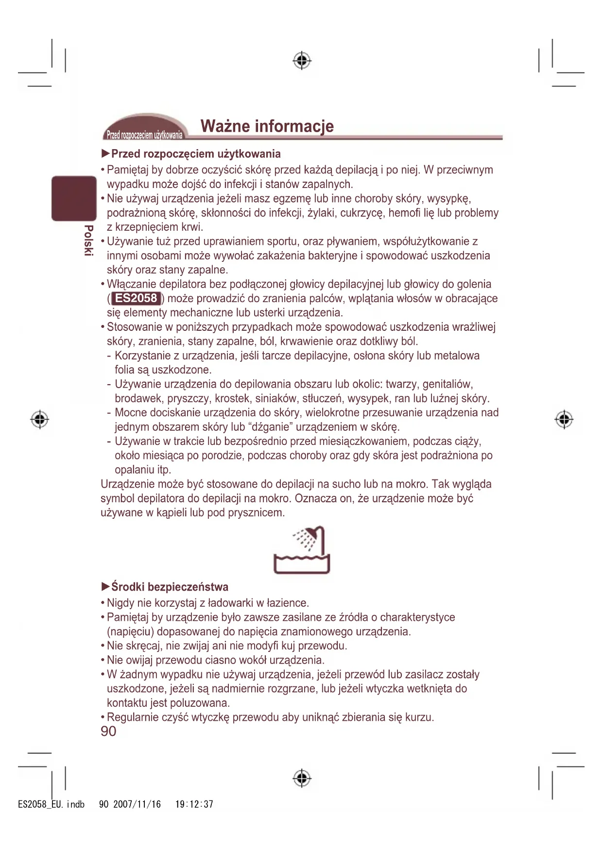 ES2058 ) może prowadzić do zranienia palców, wplątania włosów w obracające się elementy mechaniczne lub usterki urządzenia. Stosowanie w poniższych przypadkach może spowodować uszkodzenia wrażliwej skóry, zranienia, stany zapalne, ból, krwawienie oraz dotkliwy ból. Korzystanie z urządzenia, jeśli tarcze depilacyjne, osłona skóry lub metalowa folia są uszkodzone. Używanie urządzenia do depilowania obszaru lub okolic: twarzy, genitaliów, brodawek, pryszczy, krostek, siniaków, stłuczeń, wysypek, ran lub luźnej skóry. Mocne dociskanie urządzenia do skóry, wielokrotne przesuwanie urządzenia nad jednym obszarem skóry lub “dźganie” urządzeniem w skórę. Używanie w trakcie lub bezpośrednio przed miesiączkowaniem, podczas ciąży, około miesiąca po porodzie, podczas choroby oraz gdy skóra jest podrażniona po opalaniu itp. Urządzenie może być stosowane do depilacji na sucho lub na mokro. Tak wygląda symbol depilatora do depilacji na mokro. Oznacza on, że urządzenie może być używane w kąpieli lub pod prysznicem. Środki bezpieczeństwa Nigdy nie korzystaj z ładowarki w łazience. Pamiętaj by urządzenie było zawsze zasilane ze źródła o charakterystyce (napięciu) dopasowanej do napięcia znamionowego urządzenia. Nie skręcaj, nie zwijaj ani nie modyfi kuj przewodu. Nie owijaj przewodu ciasno wokół urządzenia. W żadnym wypadku nie używaj urządzenia, jeżeli przewód lub zasilacz zostały uszkodzone, jeżeli są nadmiernie rozgrzane, lub jeżeli wtyczka wetknięta do kontaktu jest poluzowana. Regularnie czyść wtyczkę przewodu aby uniknąć zbierania się kurzu.