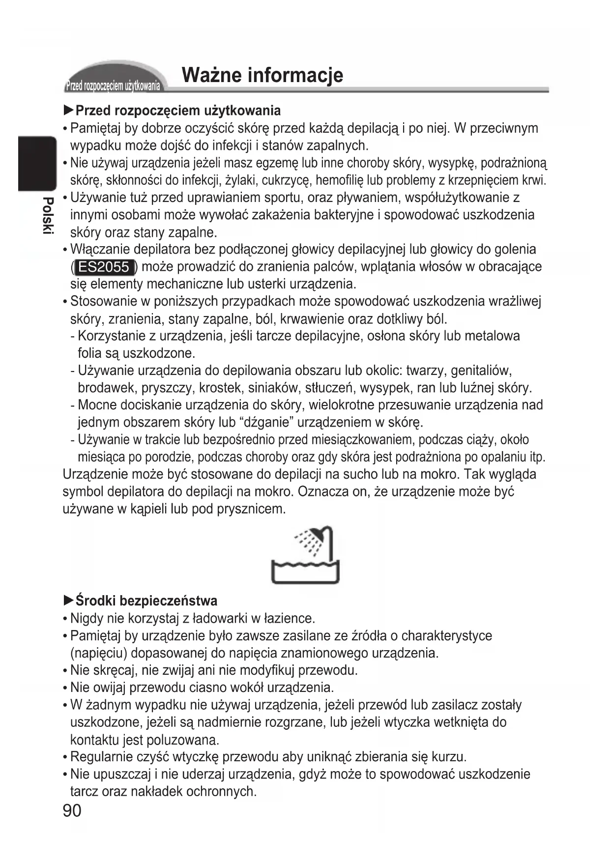ES2055 ) może prowadzić do zranienia palców, wplątania włosów w obracające się elementy mechaniczne lub usterki urządzenia. Stosowanie w poniższych przypadkach może spowodować uszkodzenia wrażliwej skóry, zranienia, stany zapalne, ból, krwawienie oraz dotkliwy ból. Korzystanie z urządzenia, jeśli tarcze depilacyjne, osłona skóry lub metalowa folia są uszkodzone. Używanie urządzenia do depilowania obszaru lub okolic: twarzy, genitaliów, brodawek, pryszczy, krostek, siniaków, stłuczeń, wysypek, ran lub luźnej skóry. Mocne dociskanie urządzenia do skóry, wielokrotne przesuwanie urządzenia nad jednym obszarem skóry lub “dźganie” urządzeniem w skórę. Używanie w trakcie lub bezpośrednio przed miesiączkowaniem, podczas ciąży, około miesiąca po porodzie, podczas choroby oraz gdy skóra jest podrażniona po opalaniu itp. Urządzenie może być stosowane do depilacji na sucho lub na mokro. Tak wygląda symbol depilatora do depilacji na mokro. Oznacza on, że urządzenie może być używane w kąpieli lub pod prysznicem. 1Środkibezpieczeństwa Nigdy nie korzystaj z ładowarki w łazience. Pamiętaj by urządzenie było zawsze zasilane ze źródła o charakterystyce (napięciu) dopasowanej do napięcia znamionowego urządzenia. Nie skręcaj, nie zwijaj ani nie modykuj przewodu. Nie owijaj przewodu ciasno wokół urządzenia. W żadnym wypadku nie używaj urządzenia, jeżeli przewód lub zasilacz zostały uszkodzone, jeżeli są nadmiernie rozgrzane, lub jeżeli wtyczka wetknięta do kontaktu jest poluzowana. Regularnie czyść wtyczkę przewodu aby uniknąć zbierania się kurzu. Nie upuszczaj i nie uderzaj urządzenia, gdyż może to spowodować uszkodzenie tarcz oraz nakładek ochronnych.
