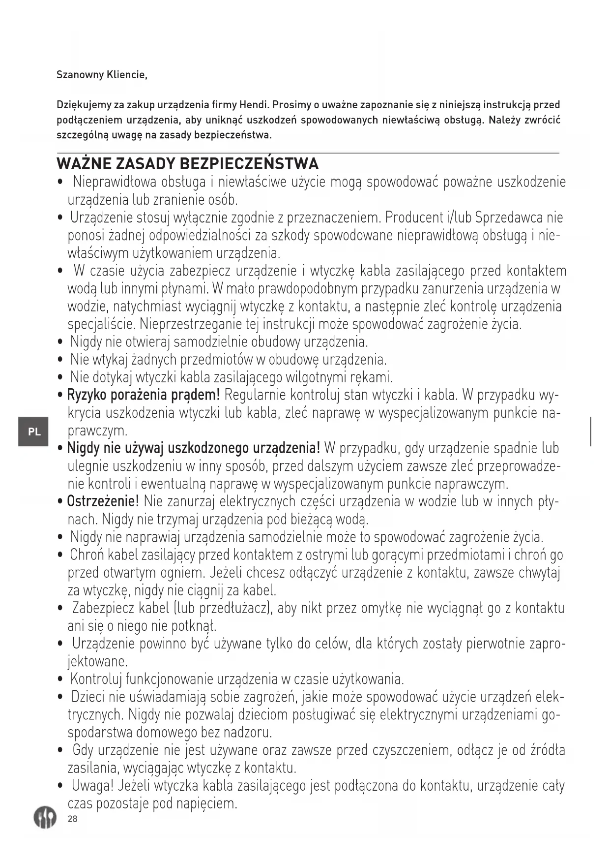 Szanowny Kliencie, Dziękujemy za zakup urządzenia firmy Hendi. Prosimy o uważne zapoznanie się z niniejszą instrukcją przed podłączeniem urządzenia, aby uniknąć uszkodzeń spowodowanych niewłaściwą obsługą. Należy zwrócić szczególną uwagę na zasady bezpieczeństwa.