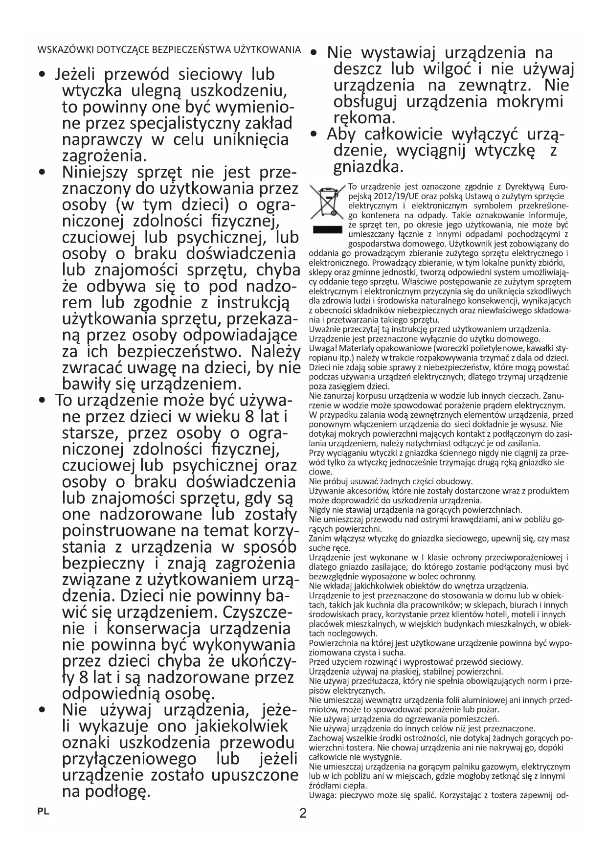 - To urządzenie może być używa- ne przez dzieci w wieku 8 lat i starsze, przez osoby o ogra- niczonej zdolności zycznej, czuciowej lub psychicznej oraz osoby o braku doświadczenia lub znajomości sprzętu, gdy są one nadzorowane lub zostały poinstruowane na temat korzy- stania z urządzenia w sposób bezpieczny i znają zagrożenia związane z użytkowaniem urzą- dzenia. Dzieci nie powinny ba- wić się urządzeniem. Czyszcze- nie i konserwacja urządzenia nie powinna być wykonywania przez dzieci chyba że ukończy- ły 8 lat i są nadzorowane przez odpowiednią osobę.