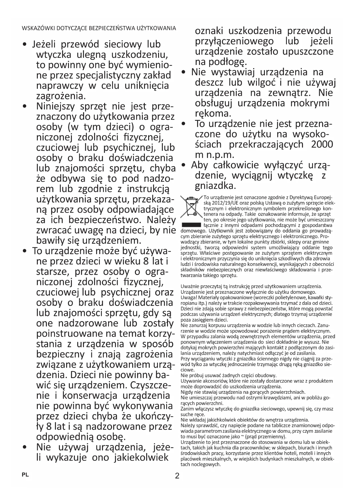 - To urządzenie może być używa- ne przez dzieci w wieku 8 lat i starsze, przez osoby o ogra- niczonej zdolności zycznej, czuciowej lub psychicznej oraz osoby o braku doświadczenia lub znajomości sprzętu, gdy są one nadzorowane lub zostały poinstruowane na temat korzy- stania z urządzenia w sposób bezpieczny i znają zagrożenia związane z użytkowaniem urzą- dzenia. Dzieci nie powinny ba- wić się urządzeniem. Czyszcze- nie i konserwacja urządzenia nie powinna być wykonywania przez dzieci chyba że ukończy- ły 8 lat i są nadzorowane przez odpowiednią osobę.