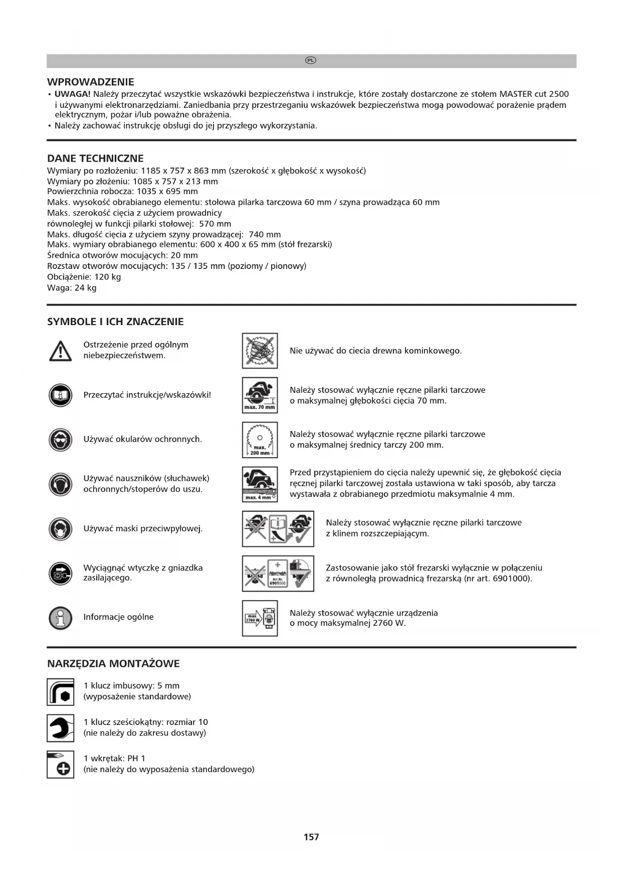 - UWAGA! Należy przeczytać wszystkie wskazówki bezpieczeństwa i instrukcje, które zostały dostarczone ze stołem MASTER cut 2500 i używanymi elektronarzędziami. Zaniedbania przy przestrzeganiu wskazówek bezpieczeństwa mogą powodować porażenie prądem elektrycznym, pożar i/lub poważne obrażenia.