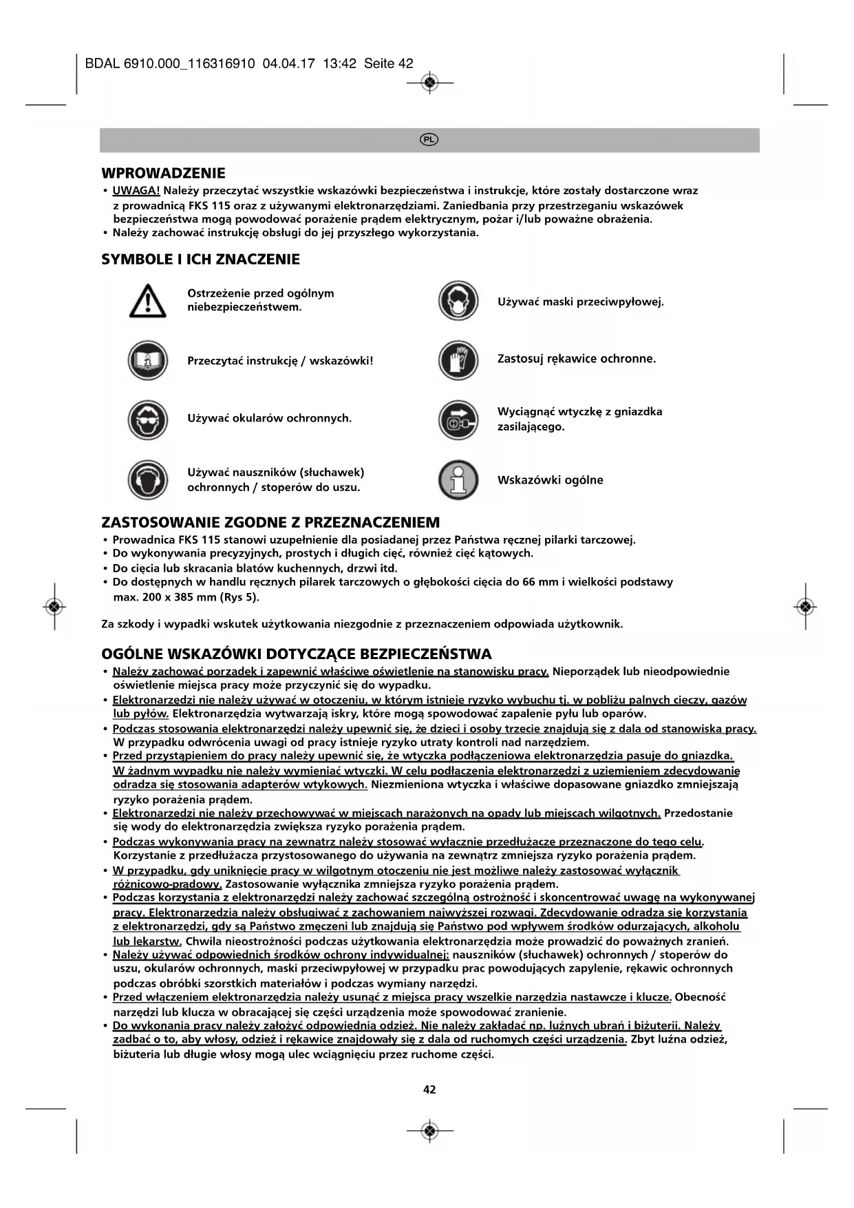 Ostrzeżenie przed ogólnym niebezpieczeństwem. Przeczytać instrukcję / wskazówki! Używać okularów ochronnych. Używać nauszników (słuchawek) ochronnych / stoperów do uszu. Wyciągnąć wtyczkę z gniazdka zasilającego. Wskazówki ogólne Używać maski przeciwpyłowej. Zastosuj rękawice ochronne. BDAL 6910.000_116316910 04.04.17 13:42 Seite 42• Zdecydowanie odradza się używania elektronarzędzi z uszkodzonym włącznikiem. Elektronarzędzie z uszkodzoną funkcją włączania i wyłączania stwarza zagrożenie i wymaga naprawy.