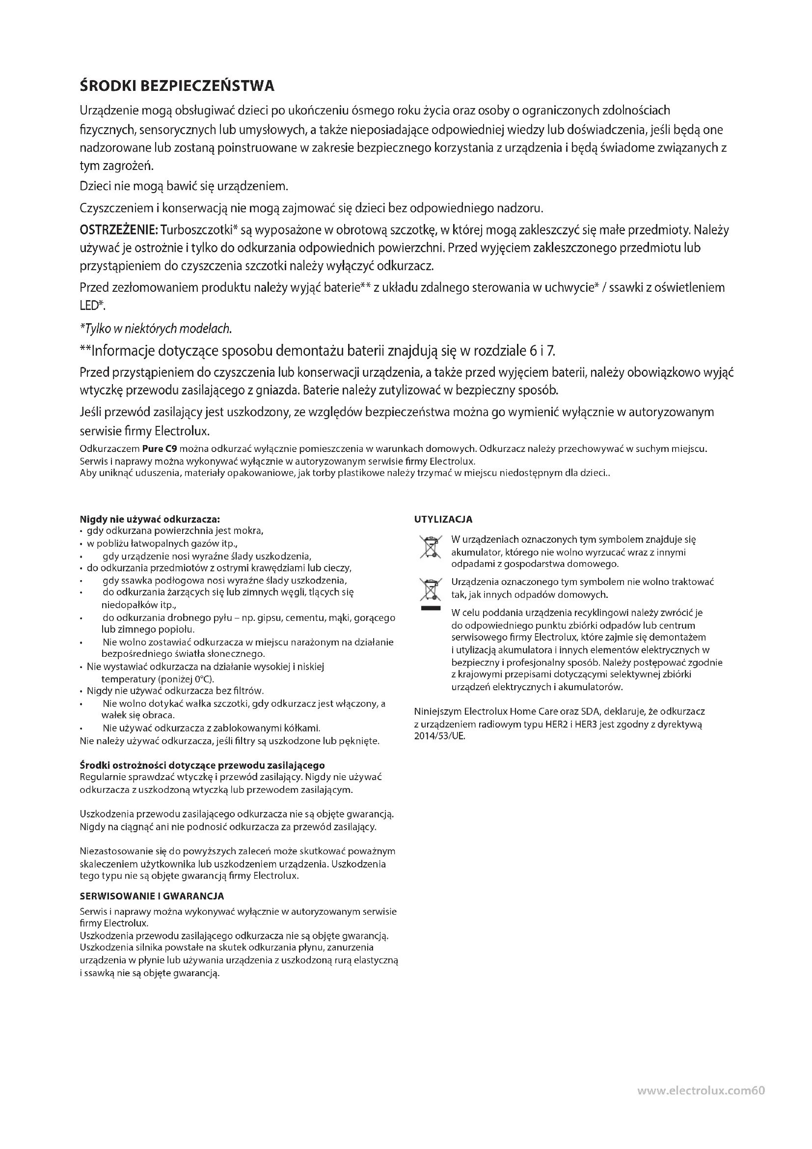 Serwis i naprawy można wykonywać wyłącznie w autoryzowanym serwisie rmy Electrolux. Uszkodzenia przewodu zasilającego odkurzacza nie są objęte gwarancją. Uszkodzenia silnika powstałe na skutek odkurzania płynu, zanurzenia urządzenia w płynie lub używania urządzenia z uszkodzoną rurą elastyczną i ssawką nie są objęte gwarancją. UTYLIZACJA W urządzeniach oznaczonych tym symbolem znajduje się akumulator, którego nie wolno wyrzucać wraz z innymi odpadami z gospodarstwa domowego. Urządzenia oznaczonego tym symbolem nie wolno traktować tak, jak innych odpadów domowych. W celu poddania urządzenia recyklingowi należy zwrócić je do odpowiedniego punktu zbiórki odpadów lub centrum serwisowego rmy Electrolux, które zajmie się demontażem i utylizacją akumulatora i innych elementów elektrycznych w bezpieczny i profesjonalny sposób. Należy postępować zgodnie z krajowymi przepisami dotyczącymi selektywnej zbiórki urządzeń elektrycznych i akumulatorów. Niniejszym Electrolux Home Care oraz SDA, deklaruje, że odkurzacz z urządzeniem radiowym typu HER2 i HER3 jest zgodny z dyrektywą 2014/53/UE.61www.electrolux.com POLSKI Dziękujemy za zakup odkurzacza Electrolux Pure C9. Aby uzyskać najlepsze efekty, należy zawsze stosować oryginalne akcesoria i części zamienne. Ten produkt zaprojektowano jako bezpieczny dla środowiska. Wszystkie plastikowe części oznaczono jako nadające się do ponownego przetworzenia.