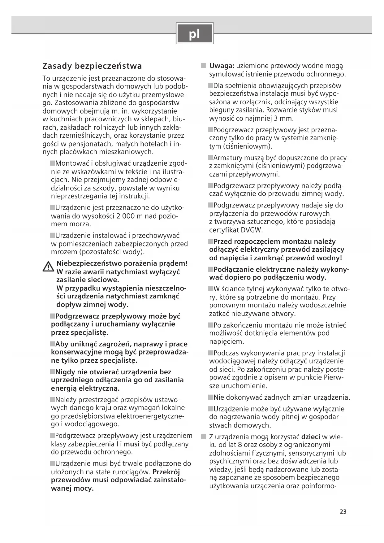 Zasady bezpieczeństwa To urządzenie jest przeznaczone do stosowa- nia w gospodarstwach domowych lub podob- nych i nie nadaje się do użytku przemysłowe- go. Zastosowania zbliżone do gospodarstw domowych obejmują m. in. wykorzystanie w kuchniach pracowniczych w sklepach, biu- rach, zakładach rolniczych lub innych zakła- dach rzemieślniczych, oraz korzystanie przez gości w pensjonatach, małych hotelach i in- nych placówkach mieszkaniowych. ■ Montować i obsługiwać urządzenie zgod- nie ze wskazówkami w tekście i na ilustra- cjach. Nie przejmujemy żadnej odpowie- dzialności za szkody, powstałe w wyniku nieprzestrzegania tej instrukcji. ■ Urządzenie jest przeznaczone do użytko- wania do wysokości 2 000 m nad pozio- mem morza. ■ Urządzenie instalować i przechowywać w pomieszczeniach zabezpieczonych przed mrozem (pozostałości wody). Niebezpieczeństwo porażenia prądem! W razie awarii natychmiast wyłączyć zasilanie sieciowe. W przypadku wystąpienia nieszczelno- ści urządzenia natychmiast zamknąć dopływ zimnej wody. ■ Podgrzewacz przepływowy może być podłączany i uruchamiany wyłącznie przez specjalistę. ■ Aby uniknąć zagrożeń, naprawy i prace konserwacyjne mogą być przeprowadza- ne tylko przez specjalistę. ■ Nigdy nie otwierać urządzenia bez uprzedniego odłączenia go od zasilania energią elektryczną. ■ Należy przestrzegać przepisów ustawo- wych danego kraju oraz wymagań lokalne- go przedsiębiorstwa elektroenergetyczne- go i wodociągowego. ■ Podgrzewacz przepływowy jest urządzeniem klasy zabezpieczenia I i musi być podłączany do przewodu ochronnego. ■ Urządzenie musi być trwale podłączone do ułożonych na stałe rurociągów. Przekrój przewodów musi odpowiadać zainstalo- wanej mocy. ■ Uwaga: uziemione przewody wodne mogą symulować istnienie przewodu ochronnego. ■ Dla spełnienia obowiązujących przepisów bezpieczeństwa instalacja musi być wypo- sażona w rozłącznik, odcinający wszystkie bieguny zasilania. Rozwarcie styków musi wynosić co najmniej 3 mm. ■ Podgrzewacz przepływowy jest przezna- czony tylko do pracy w systemie zamknię- tym (ciśnieniowym). ■ Armatury muszą być dopuszczone do pracy z zamkniętymi (ciśnieniowymi) podgrzewa- czami przepływowymi. ■ Podgrzewacz przepływowy należy podłą- czać wyłącznie do przewodu zimnej wody. ■ Podgrzewacz przepływowy nadaje się do przyłączenia do przewodów rurowych z tworzywa sztucznego, które posiadają certyfikat DVGW. ■ Przed rozpoczęciem montażu należy odłączyć elektryczny przewód zasilający od napięcia i zamknąć przewód wodny! ■ Podłączanie elektryczne należy wykony- wać dopiero po podłączeniu wody. ■ W ściance tylnej wykonywać tylko te otwo- ry, które są potrzebne do montażu. Przy ponownym montażu należy wodoszczelnie zatkać nieużywane otwory. ■ Po zakończeniu montażu nie może istnieć możliwość dotknięcia elementów pod napięciem. ■ Podczas wykonywania prac przy instalacji wodociągowej należy odłączyć urządzenie od sieci. Po zakończeniu prac należy postę- pować zgodnie z opisem w punkcie Pierw- sze uruchomienie. ■ Nie dokonywać żadnych zmian urządzenia. ■ Urządzenie może być używane wyłącznie do nagrzewania wody pitnej w gospodar- stwach domowych. ■ Z urządzenia mogą korzystać dzieci w wie- ku od lat 8 oraz osoby z ograniczonymi zdolnościami fizycznymi, sensorycznymi lub psychicznymi oraz bez doświadczenia lub wiedzy, jeśli będą nadzorowane lub zosta- ną zapoznane ze sposobem bezpiecznego użytkowania urządzenia oraz poinformo-24
